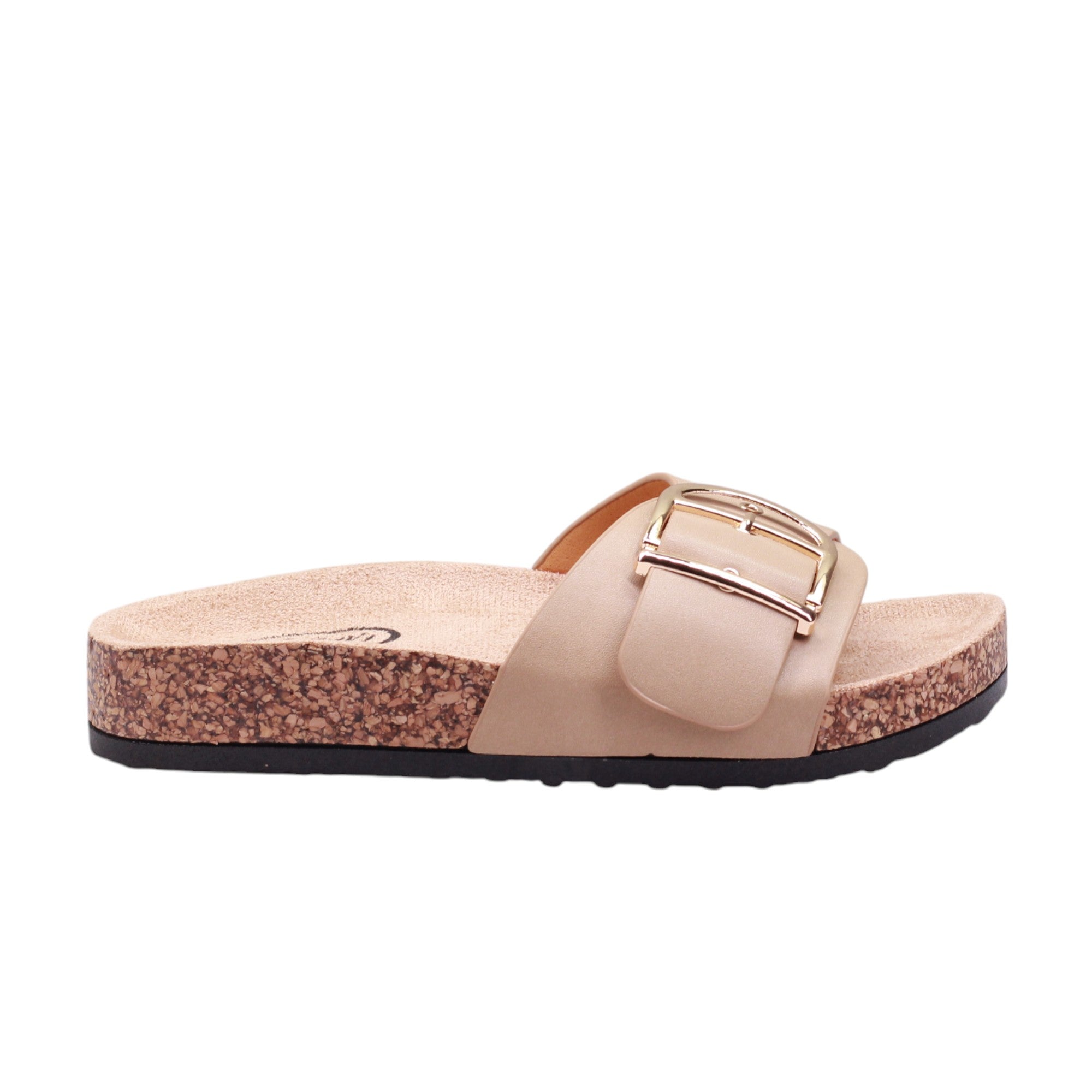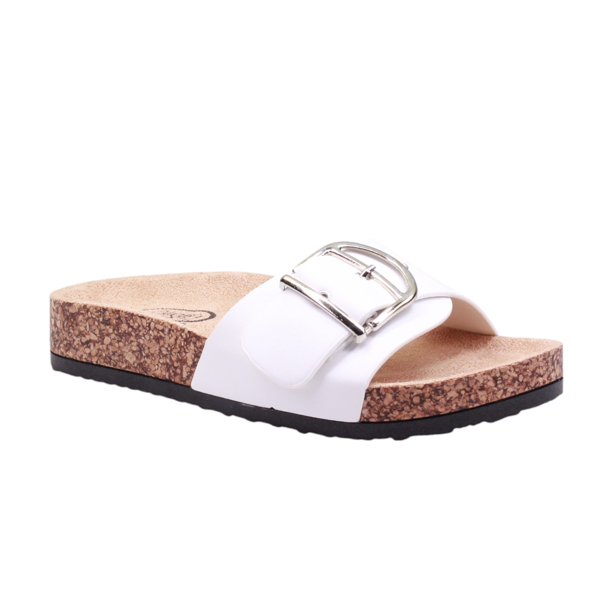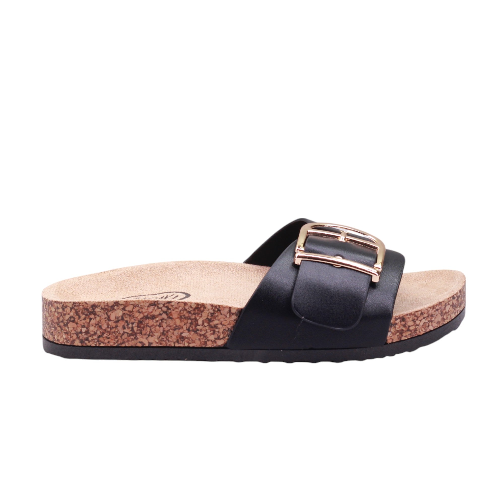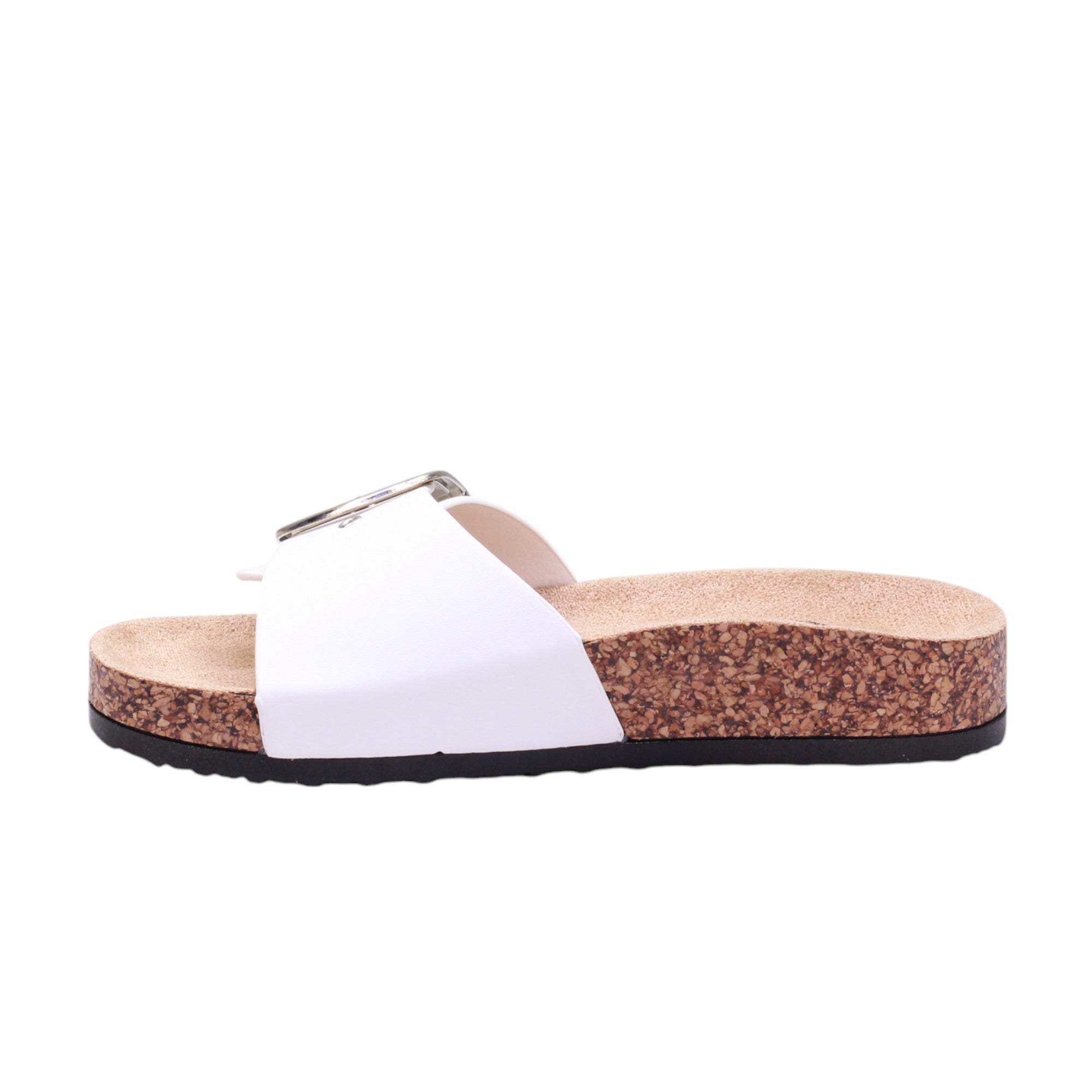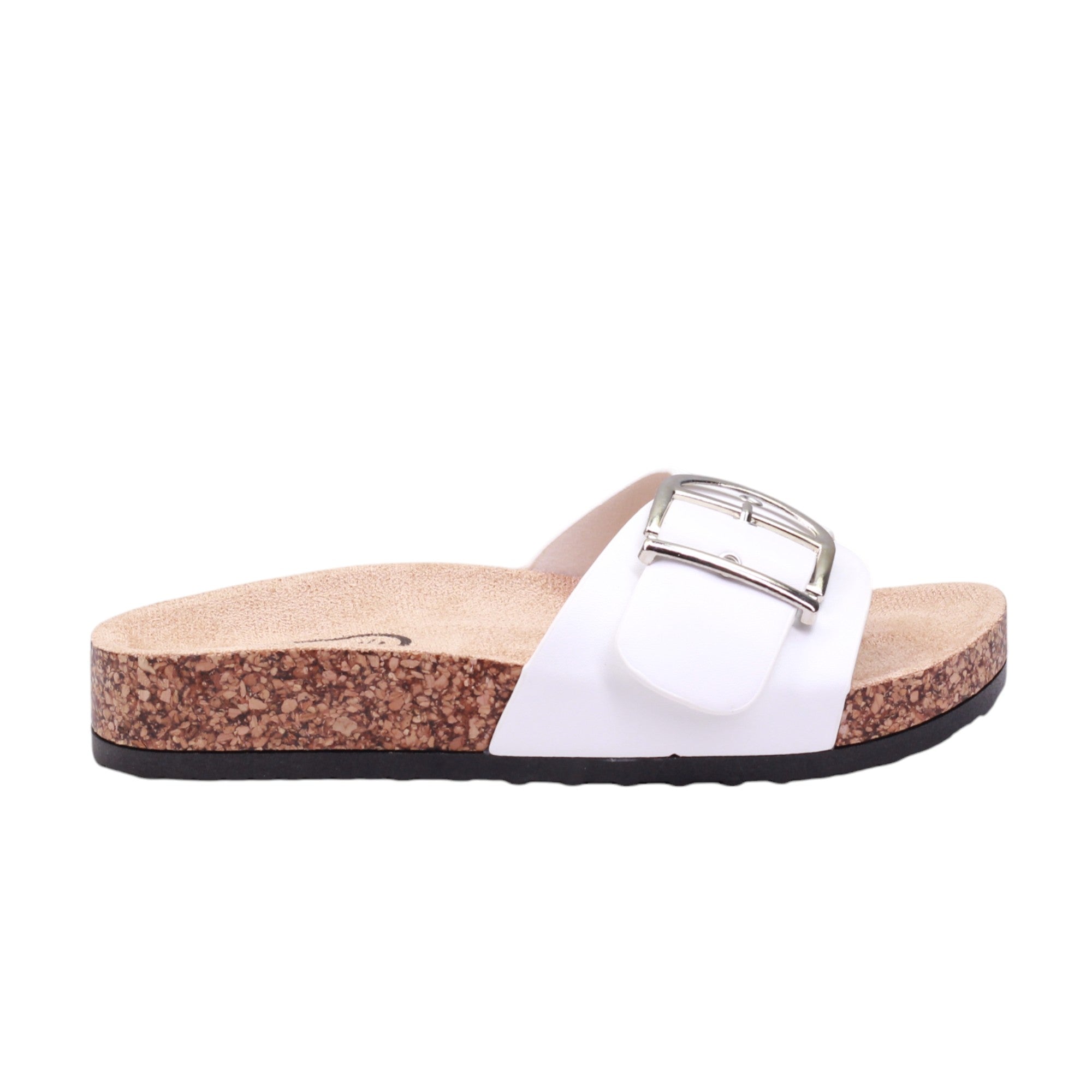 Sandalia para dama marca Caray en colores negro, blanco y natural. Este modelo cuenta con una altura de 2.5 centímetros y corte con una hebilla grande, proporcionando comodidad y un ajuste seguro. Además, su suela ergonómica tipo corcho brinda un soporte óptimo para los pies, evitando la fatiga y mejorando la postura al caminar.
