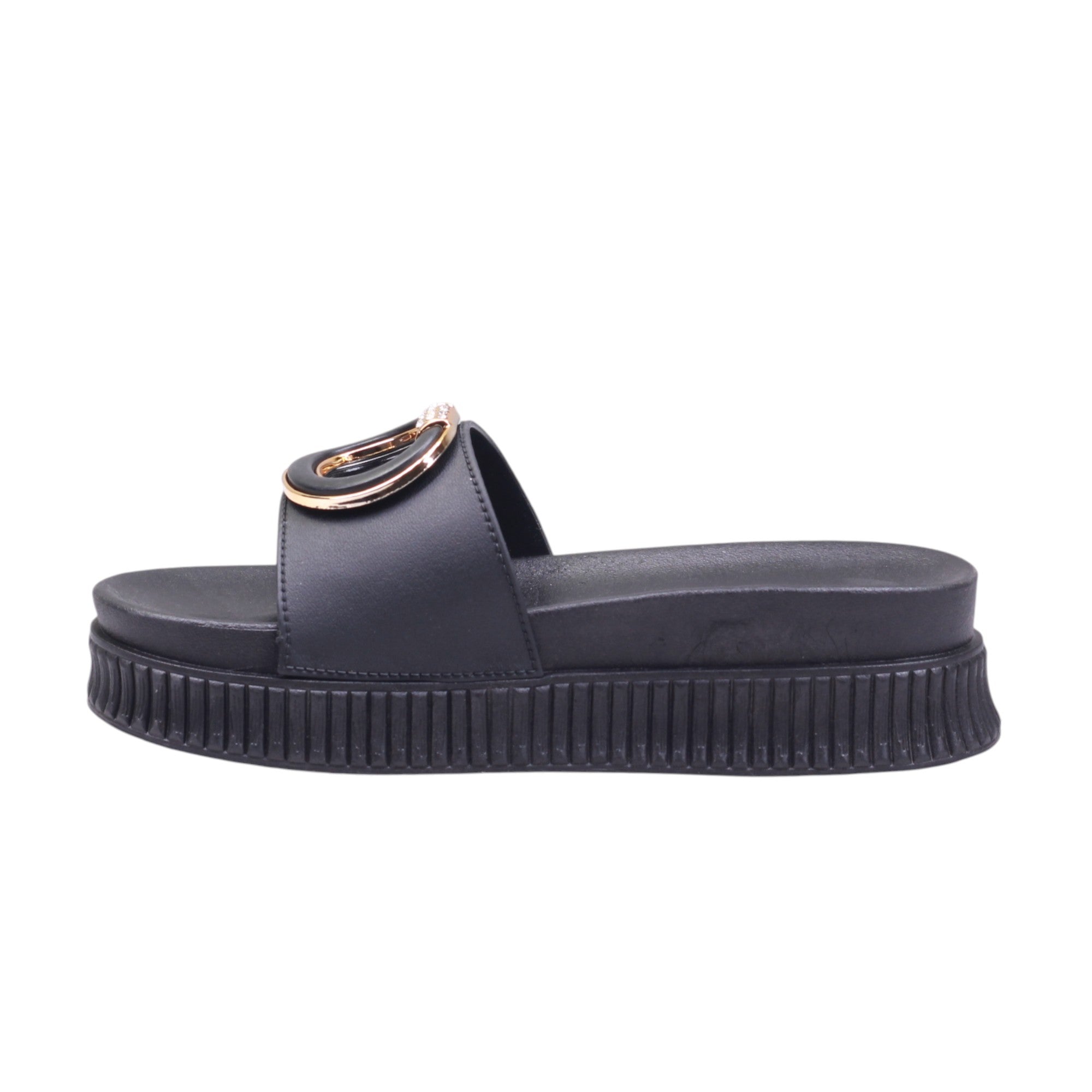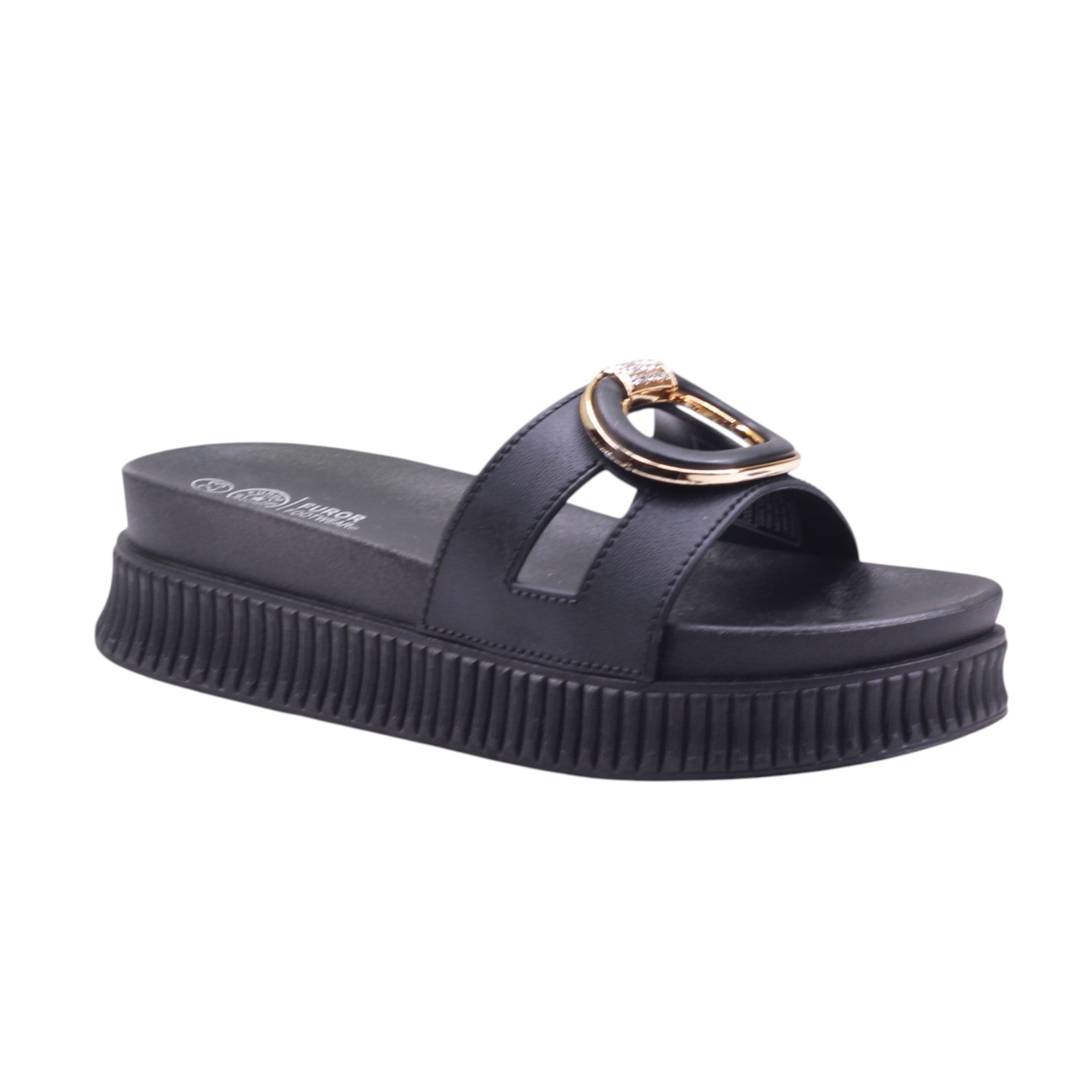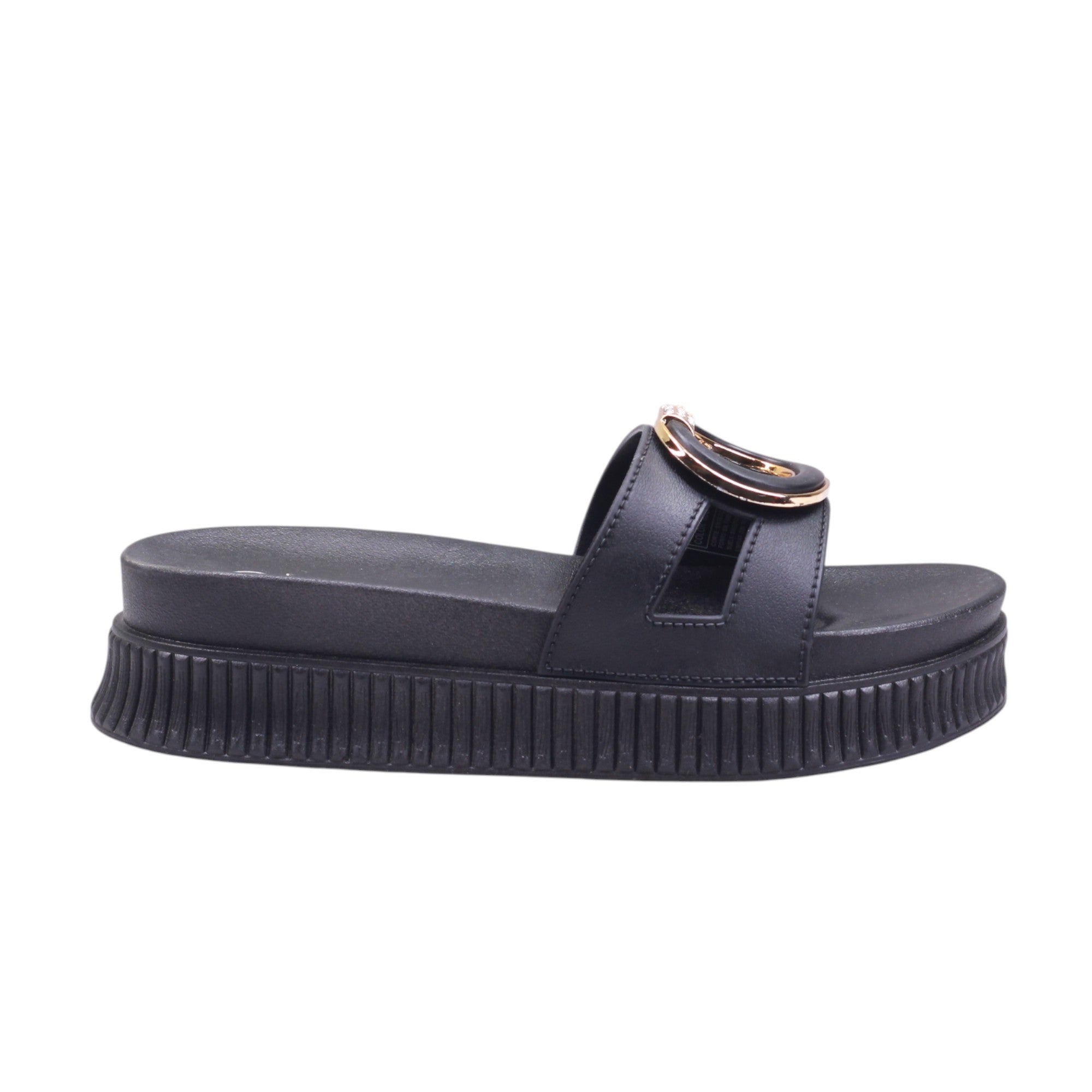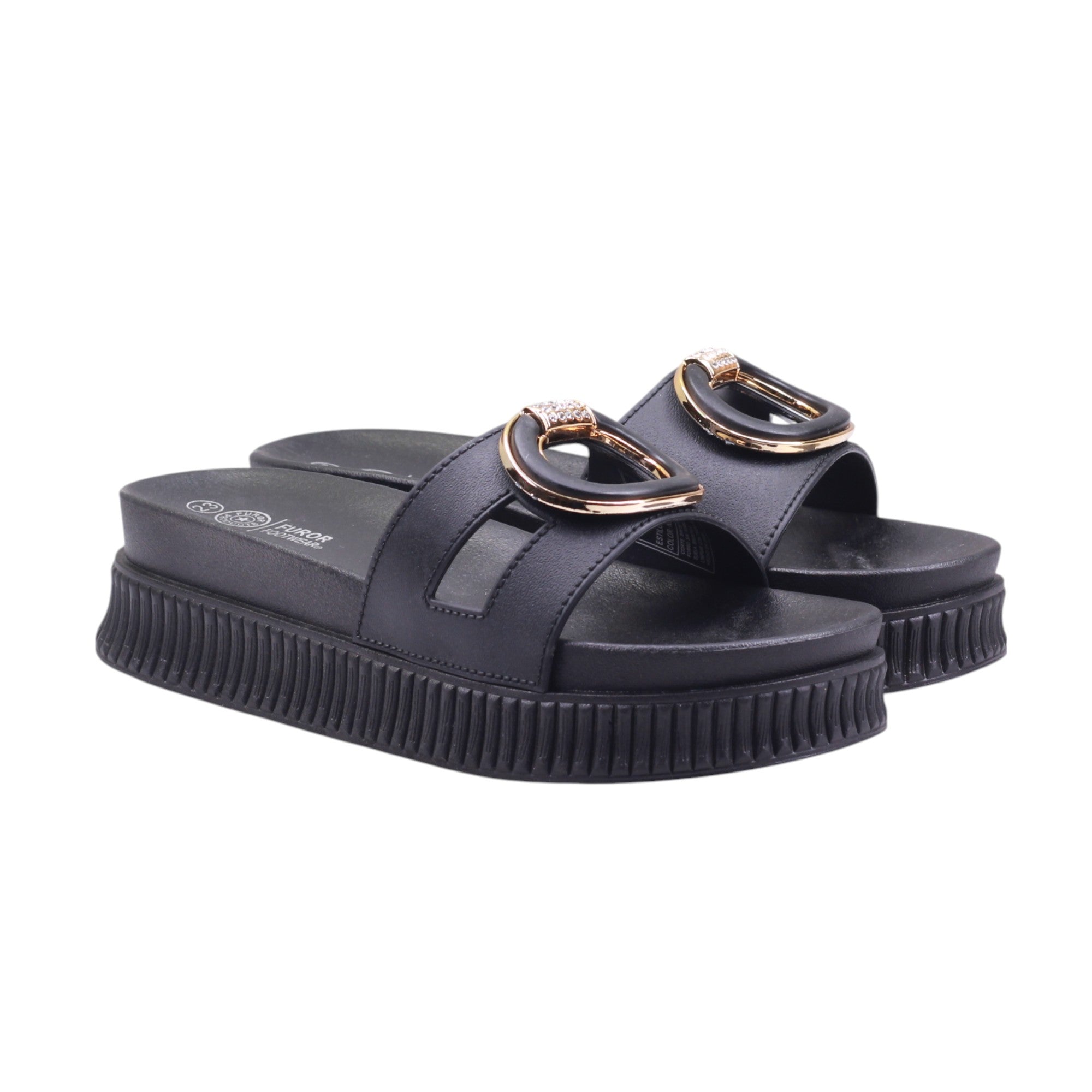 Sandalia para dama marca Furor en color negro. Este modelo combina diseño urbano con un toque elegante. Fabricado en materiales artificiales, ofrece una estructura ligera y resistente. La plataforma de 4.5 cm con textura ondulada brinda altura y comodidad para caminar con seguridad. El adorno frontal en negro con detalles dorados tipo hebilla metálica añade un contraste visual atractivo que eleva el estilo. La correa superior asegura el pie con firmeza, mientras que el diseño abierto permite frescura y libertad de movimiento.