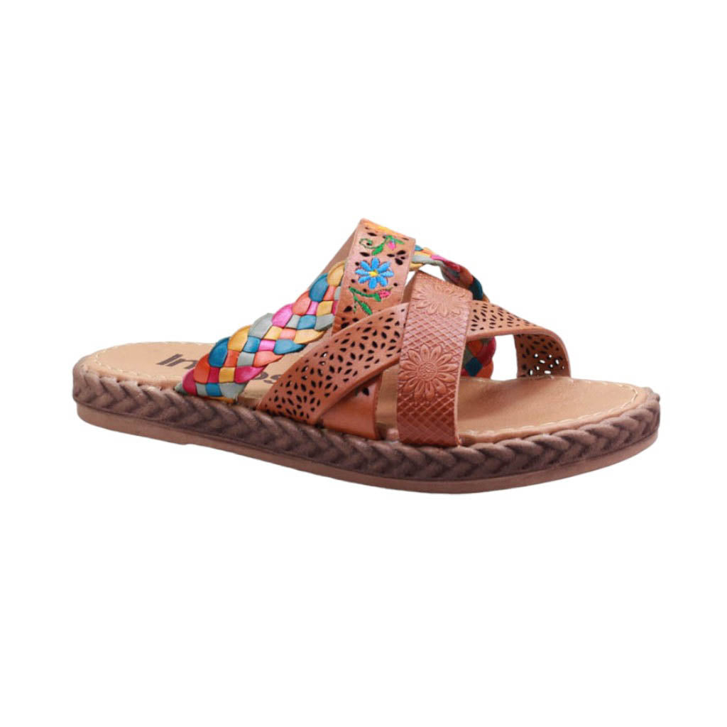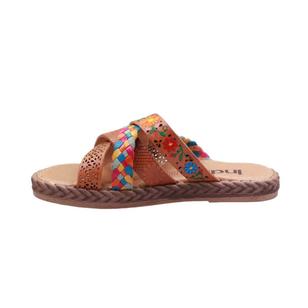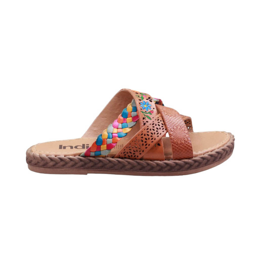 Sandalia para dama marca Indios en color nuez. Es un modelo de suela corrida con vista en tejido, cuenta con tiras en cruce. Cada tira cuenta con diferente vista.