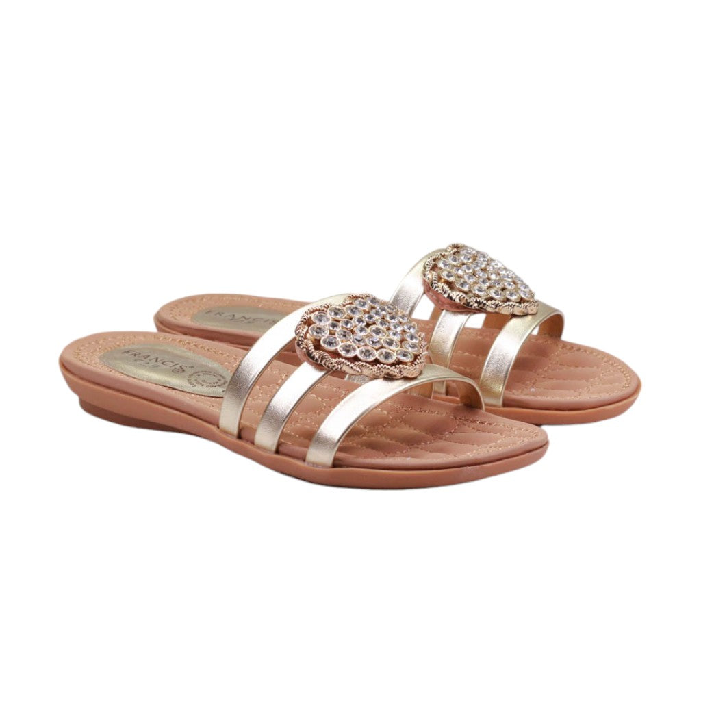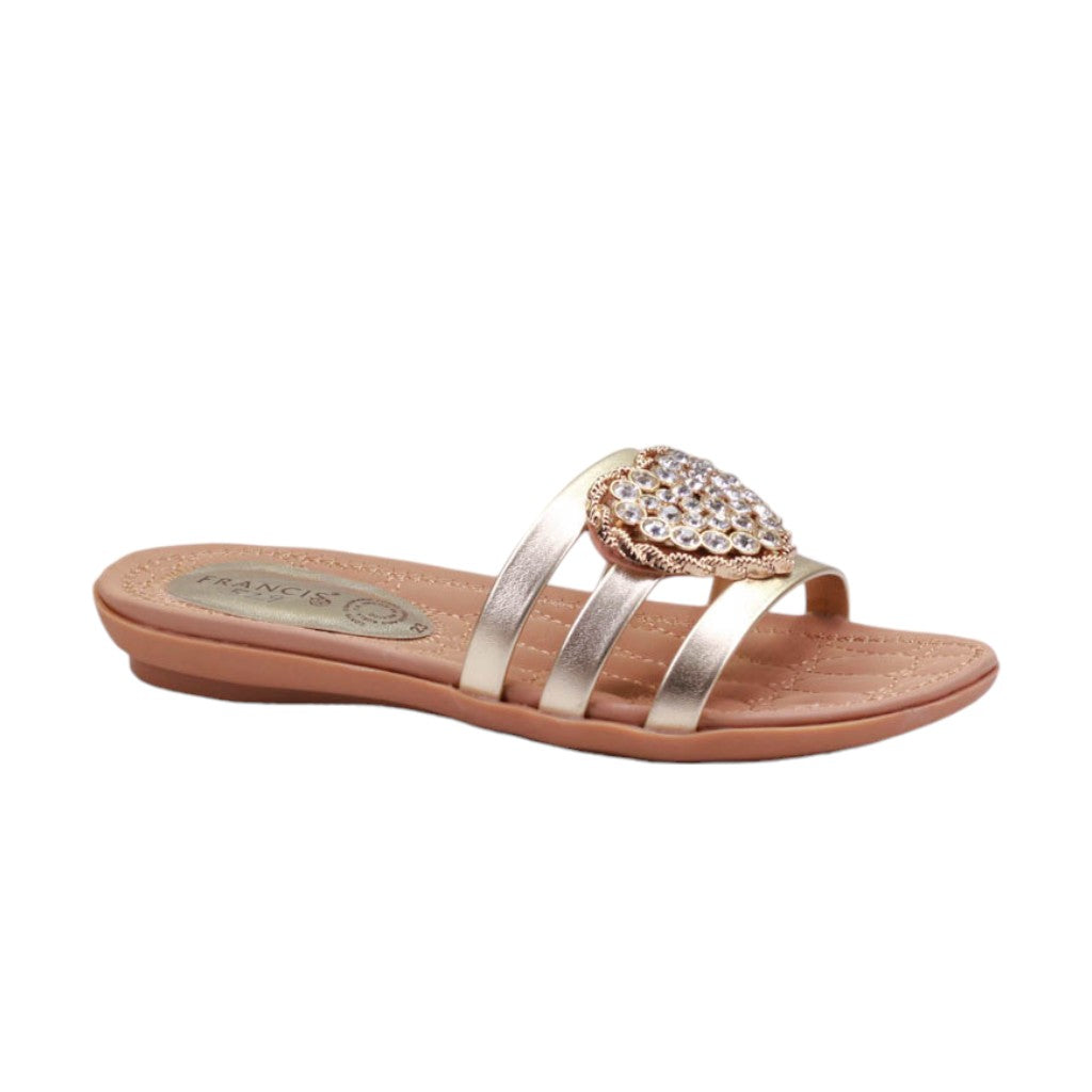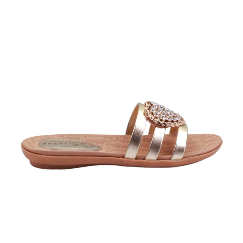 Sandalia para dama marca Francis en color oro. Este modelo es de metedera y cuenta con tira y adorno en forma de corazón, es una sandalia clásica, lo cual hace que no pase de moda, su tacón de 2.00 cm es adecuado para el uso diario. Perfectas para casa o playa. Modelo que no puede faltar en tu guardarropa.