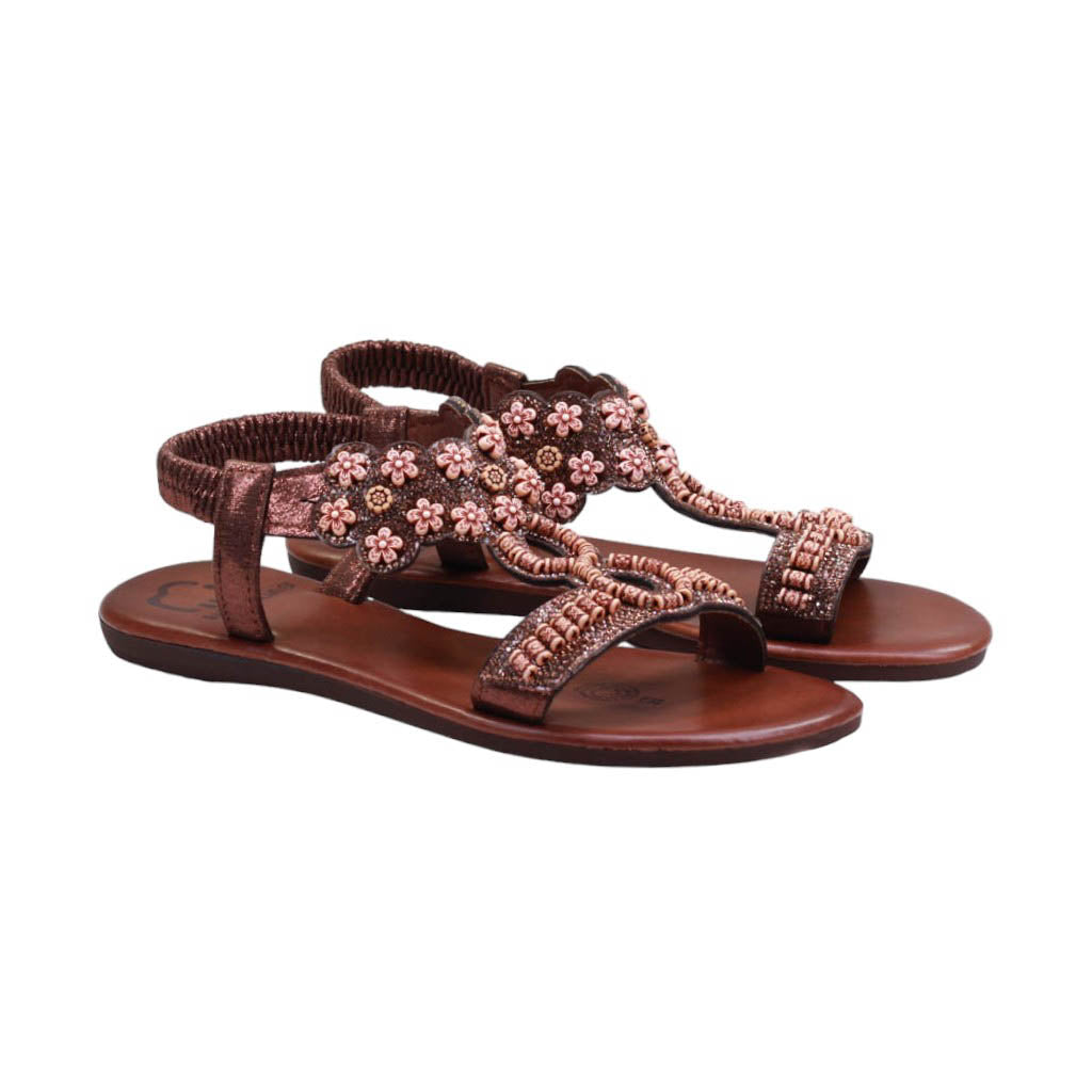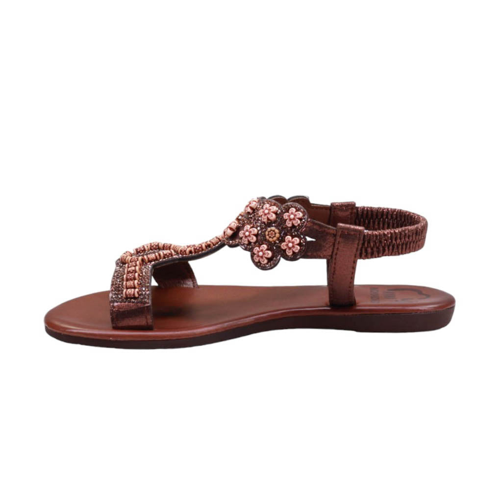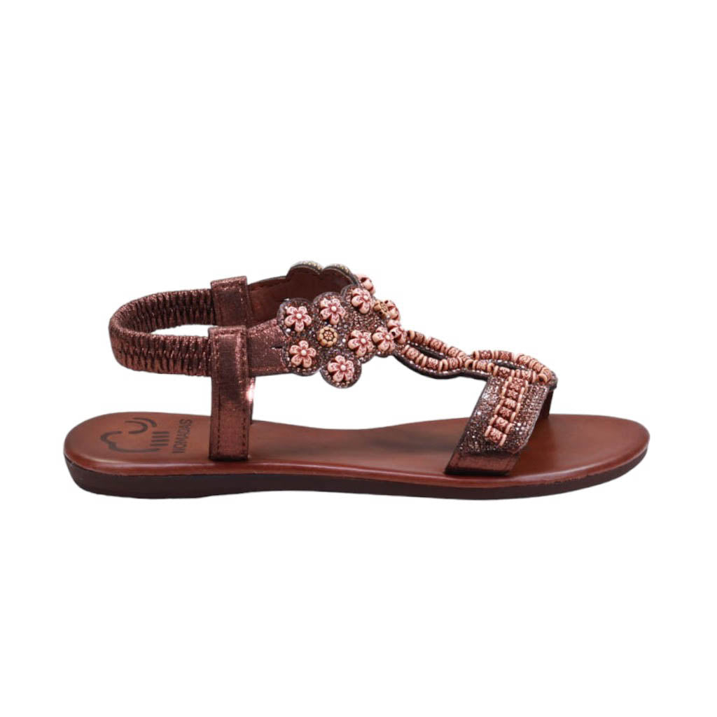Sandalia para dama marca Nómadas en color cobre. Es un modelo con ajuste trasero, es un modelo adornado con flores. Esta sandalia destaca por la suavidad que te dará paso a paso.