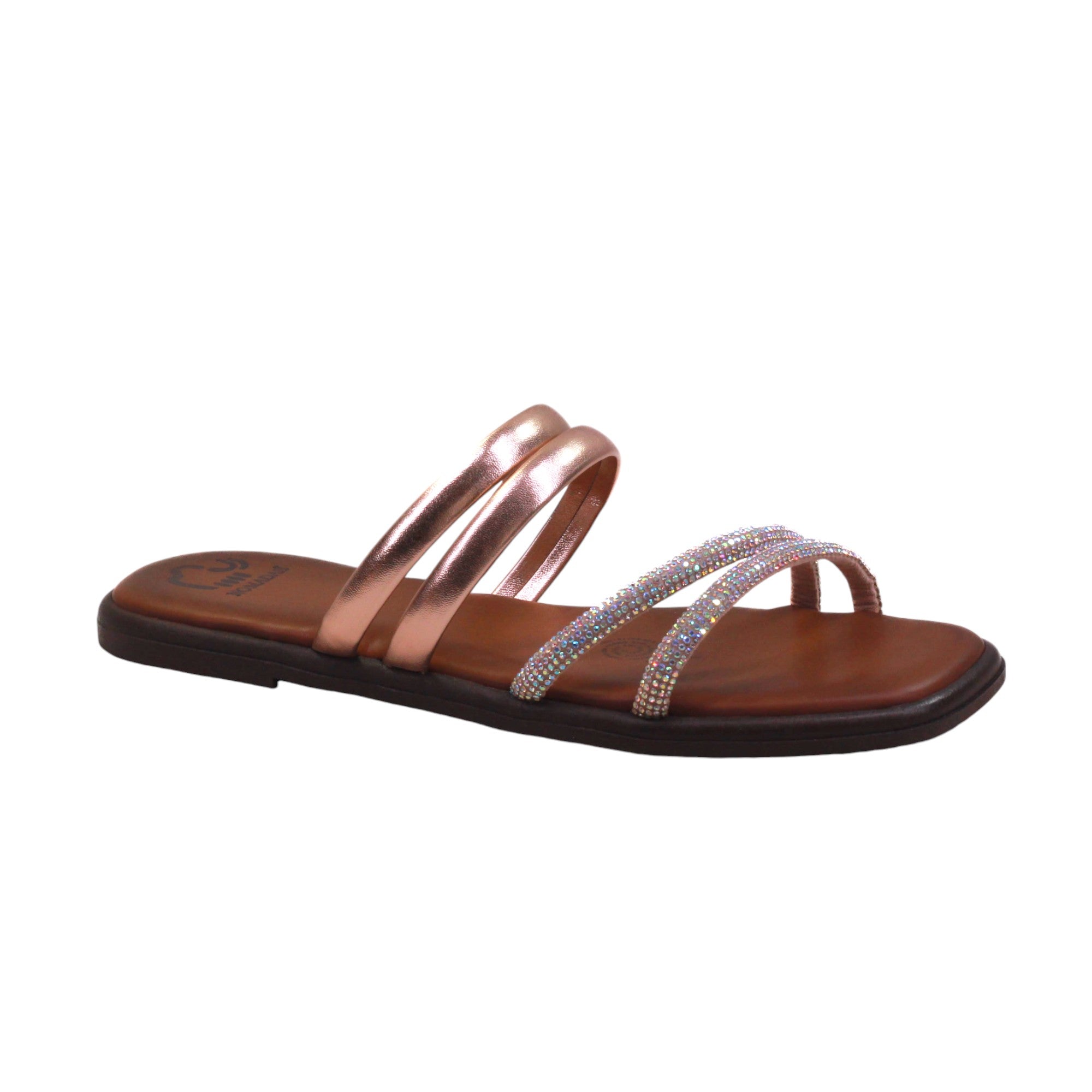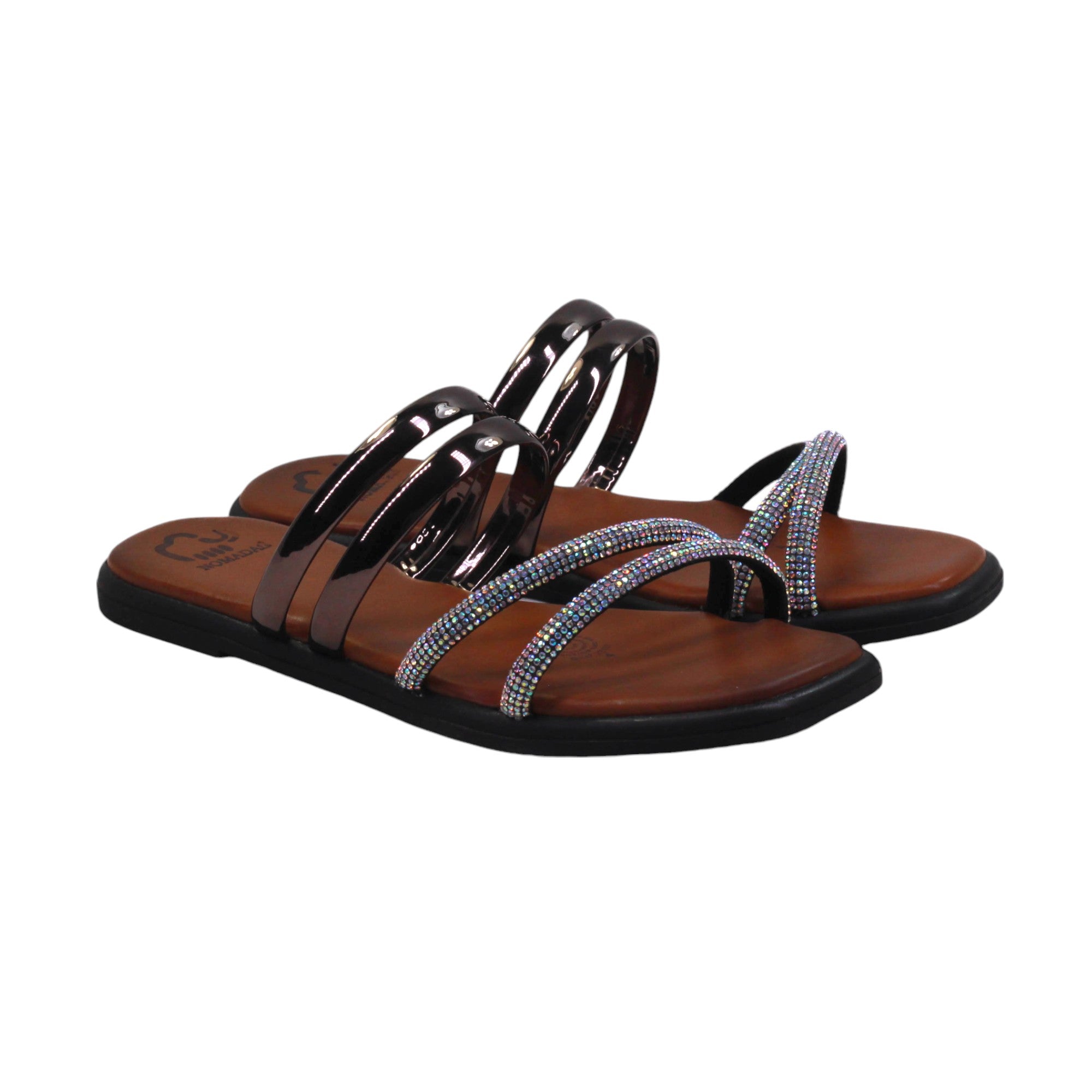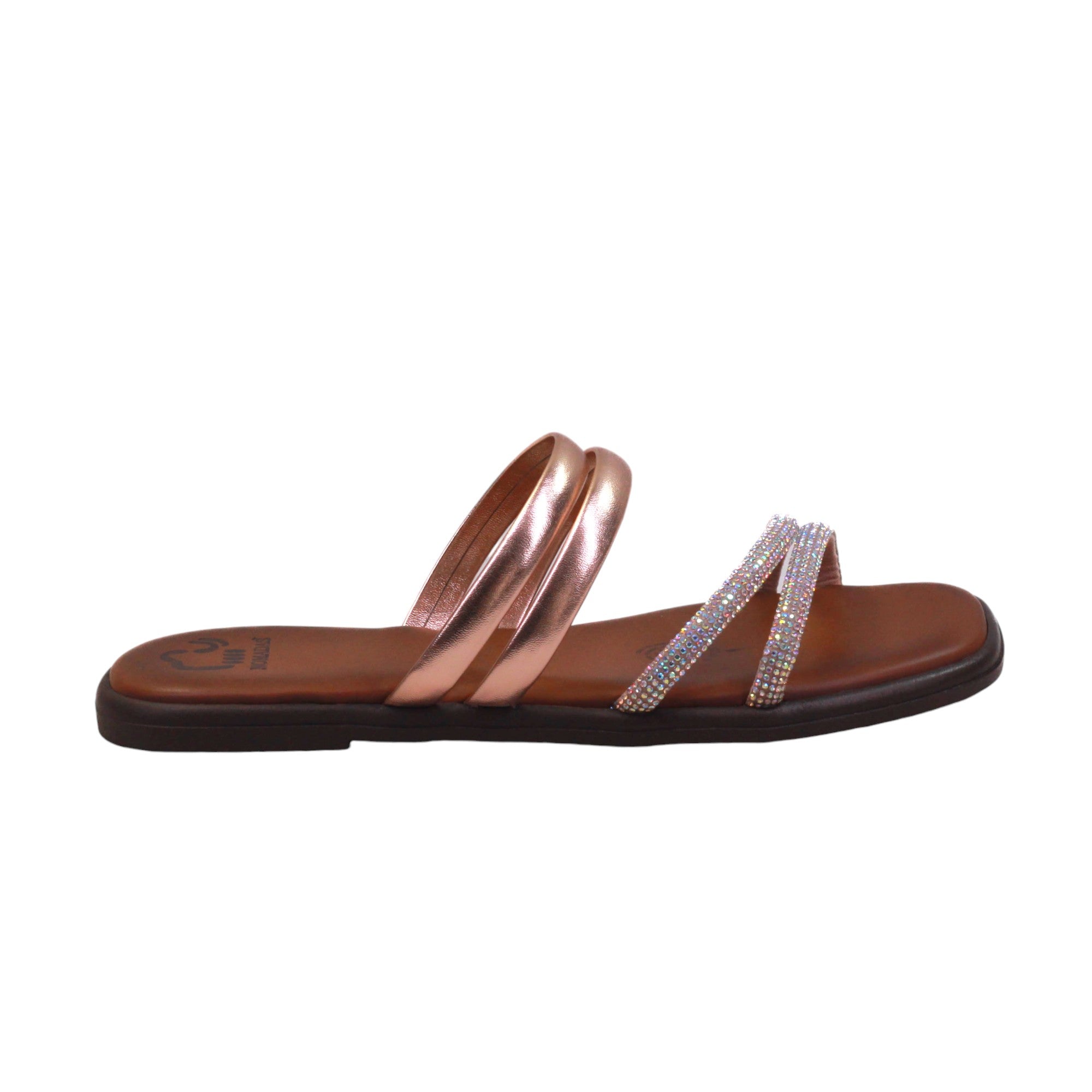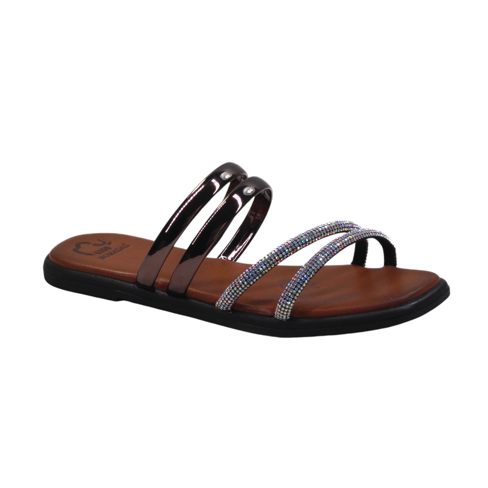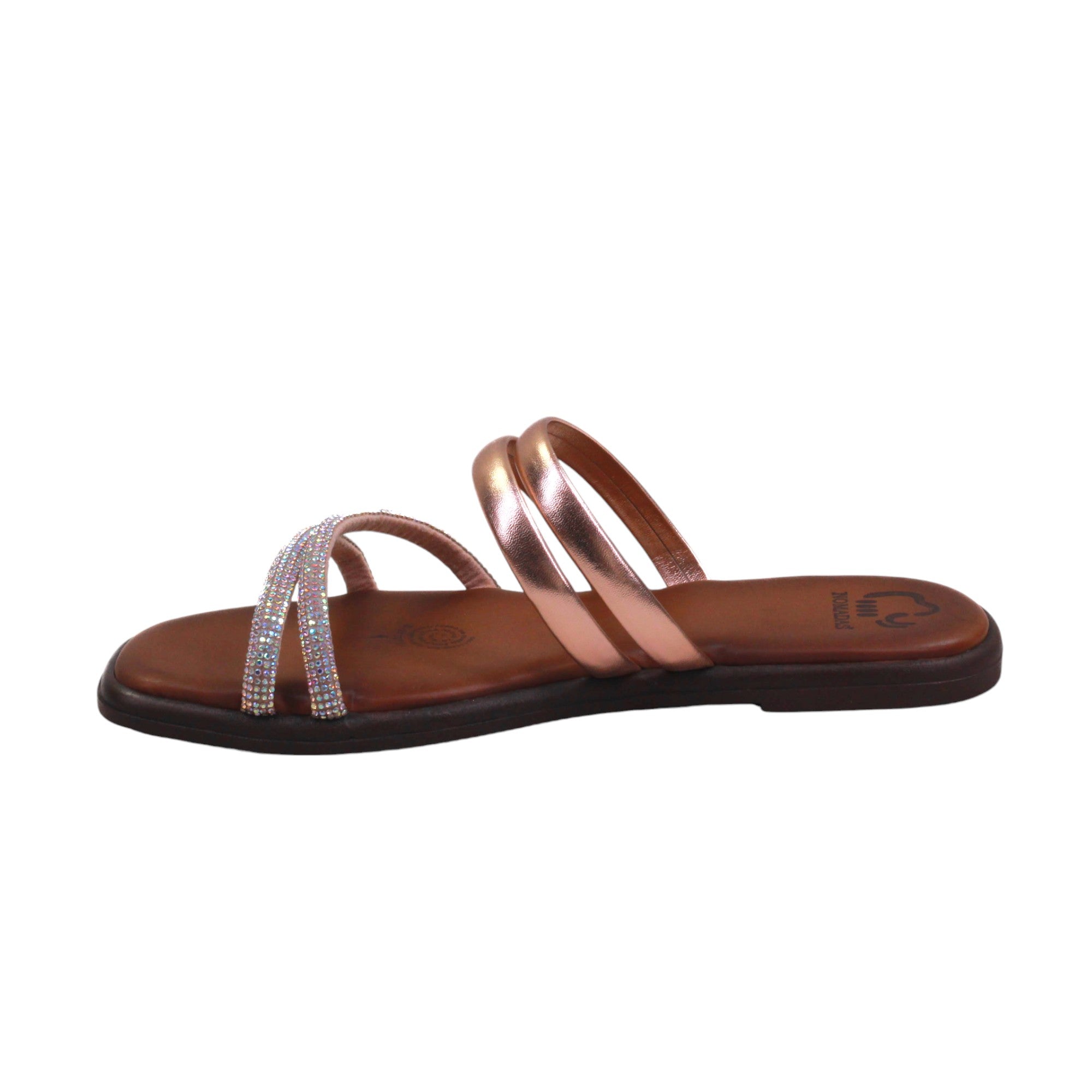 Sandalia para dama marca Nómadas en color acero y oro rosado. Es una sandalia de Confort que te proporciona la comodidad que necesitas paso a paso. Cuenta con doble tira de frente con estampado en pedrería y doble tira más al tobillo con terminado en metal.
