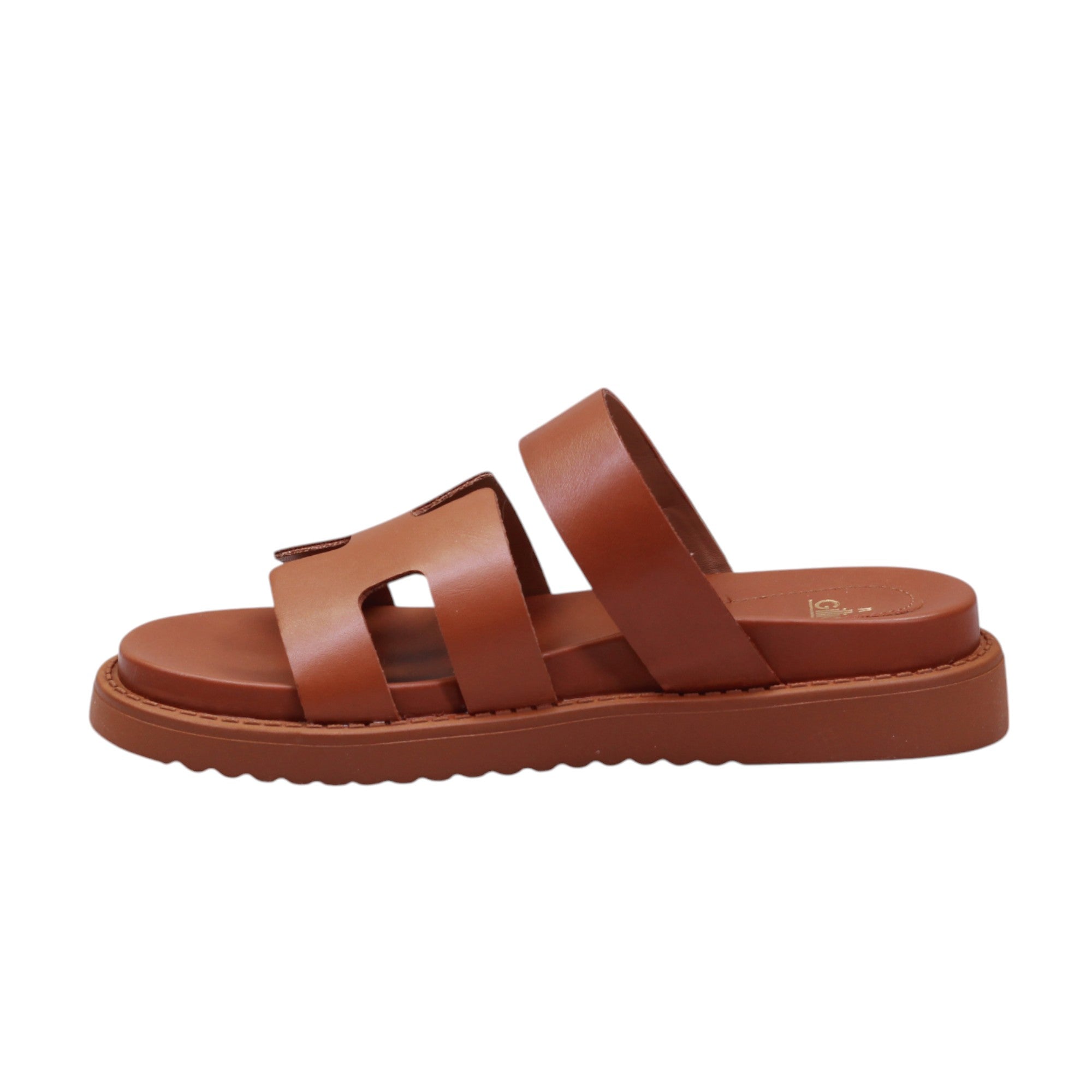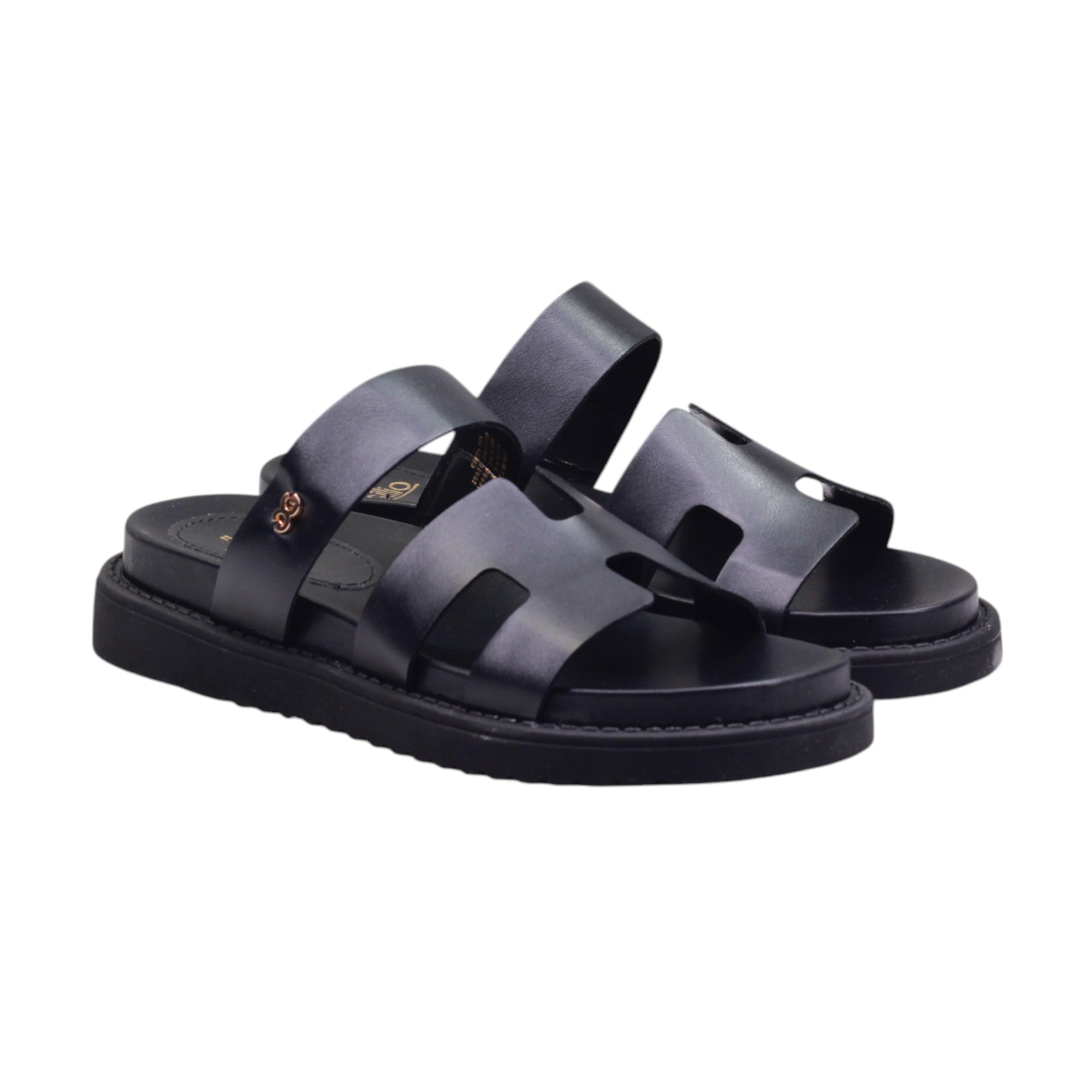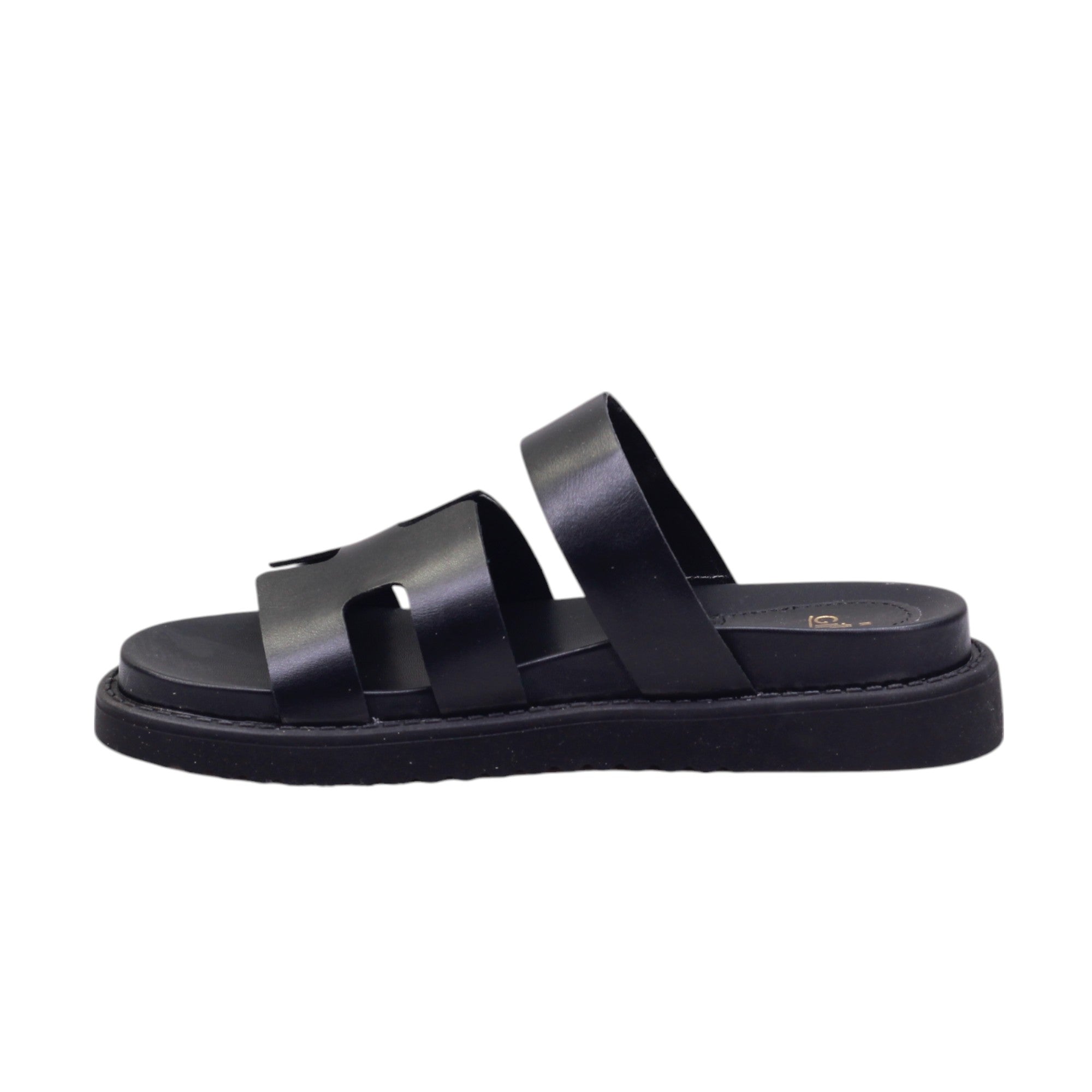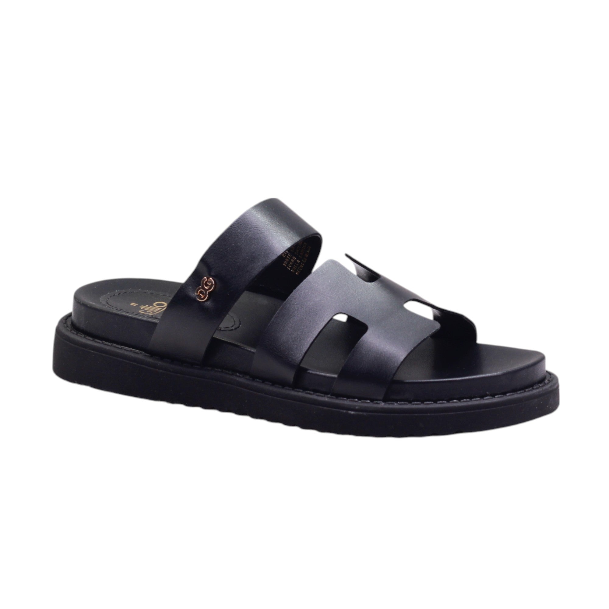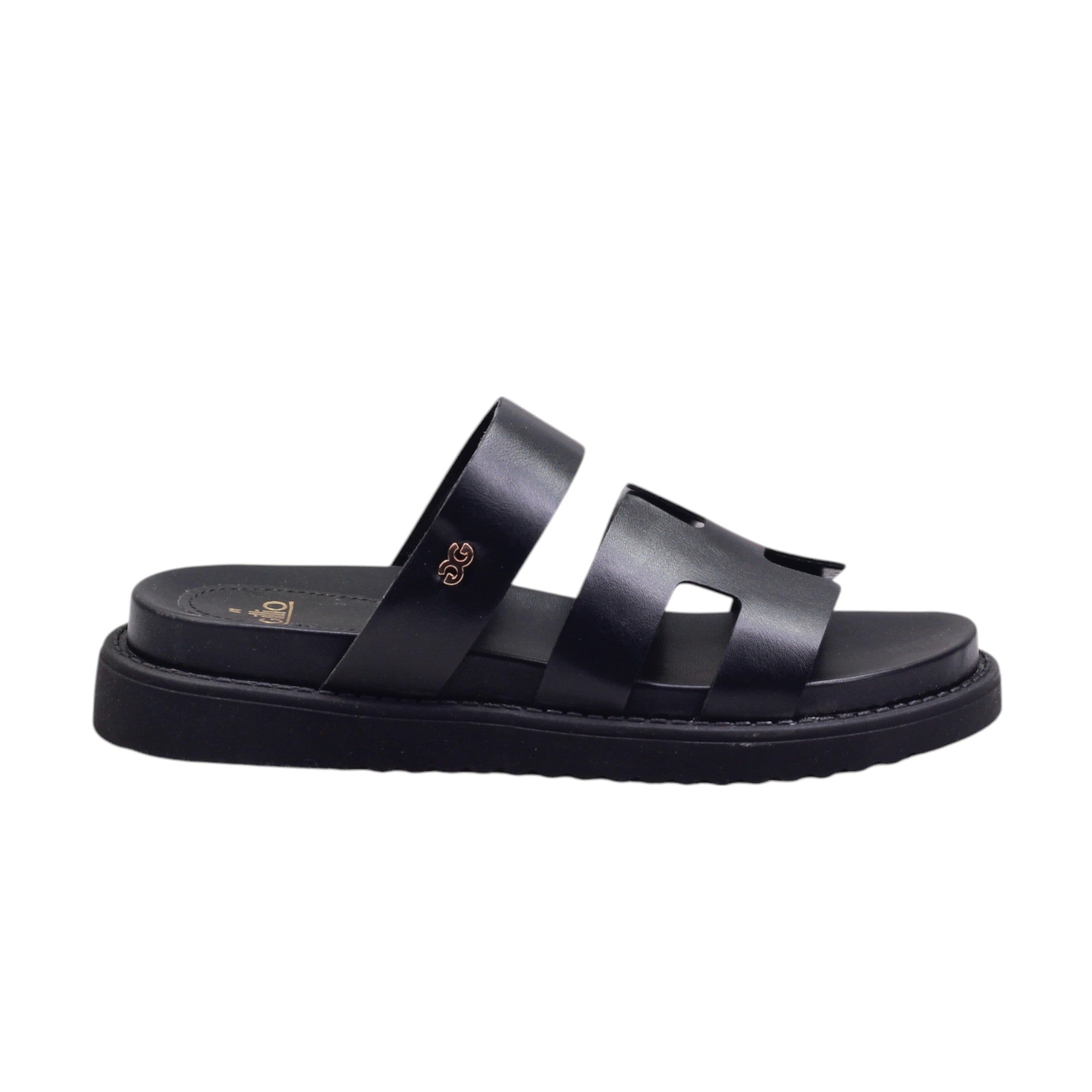 Sandalia para dama marca Gillio en colores negro y miel. Bella sandalia casual con doble tira de metedera con altura trasera de 2.00 cm.