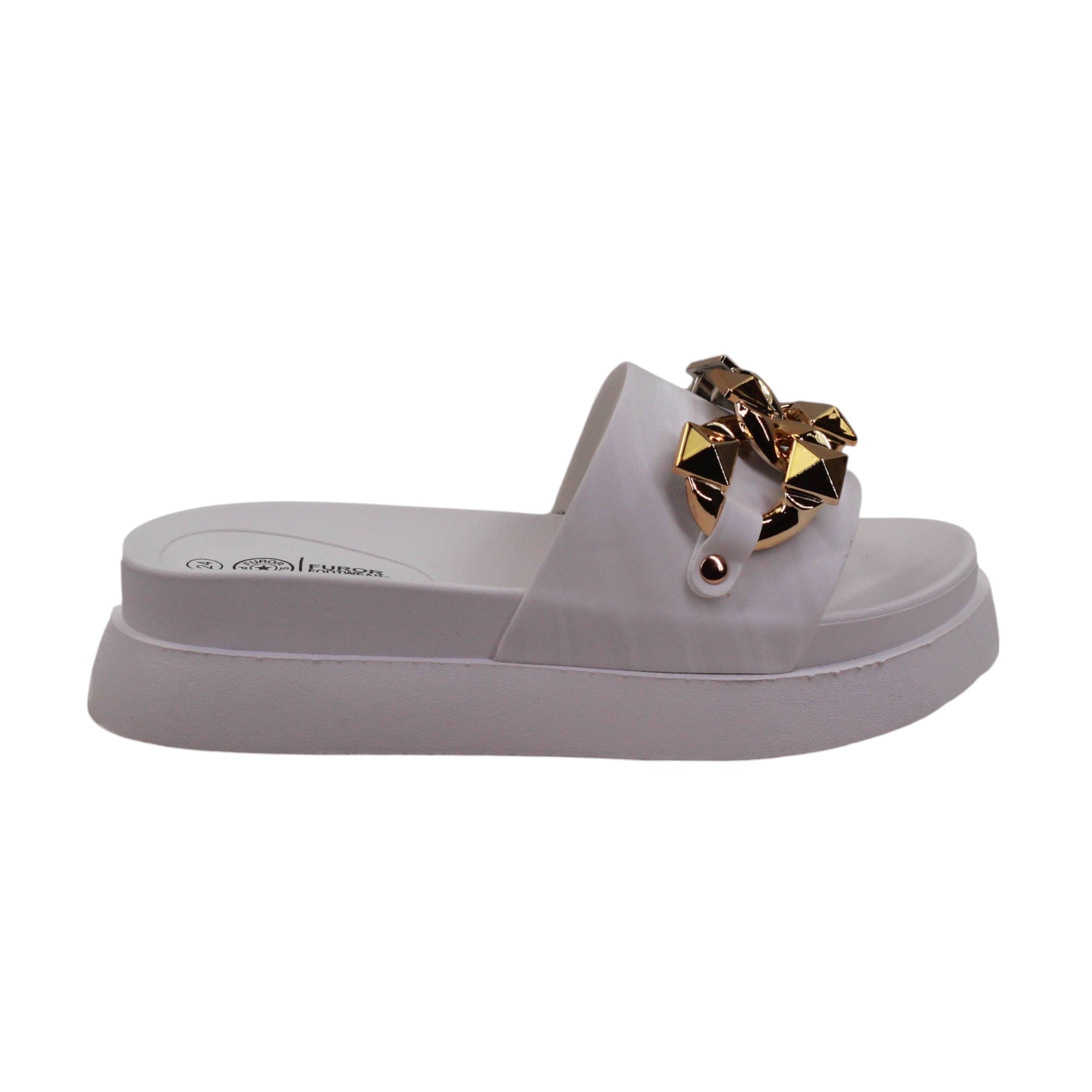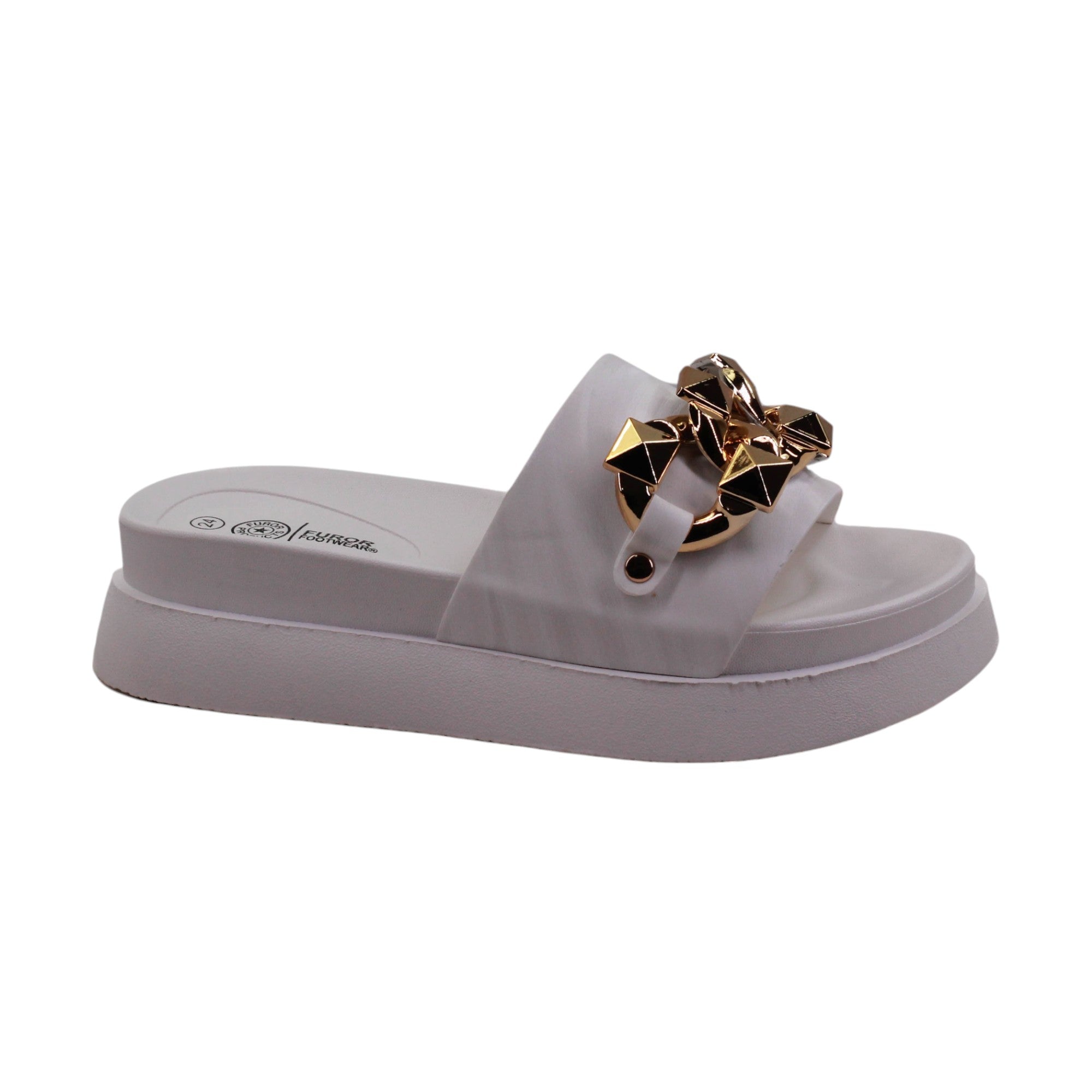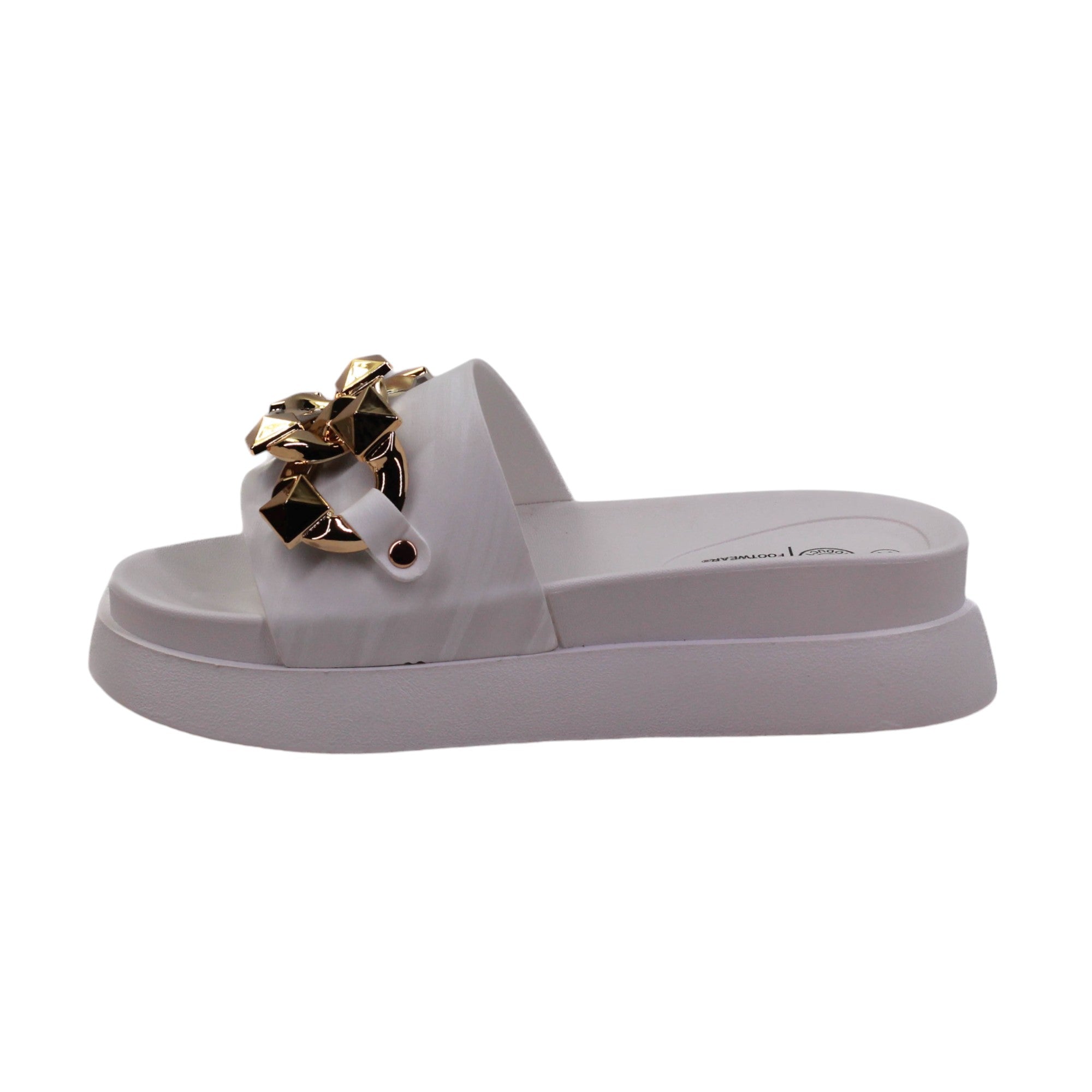 Sandalia para dama marca Furor en color blanco. Súper cómoda gracias a su diseño, El detalle de eslabones en color dorado harán que te veas increíble sin sacrificar tu comodidad. Es una sandalia ligera, lo cual brinda bastante comodidad.