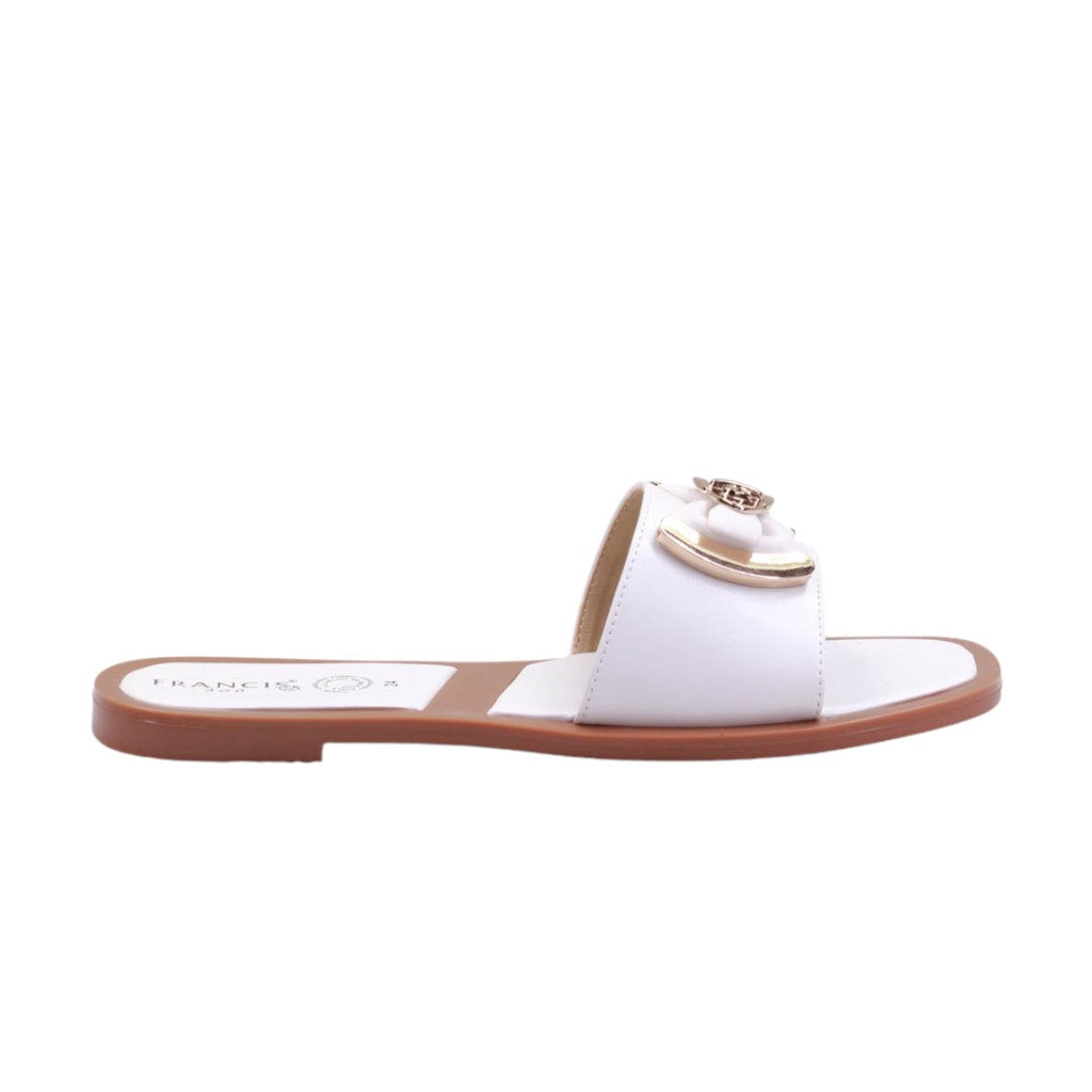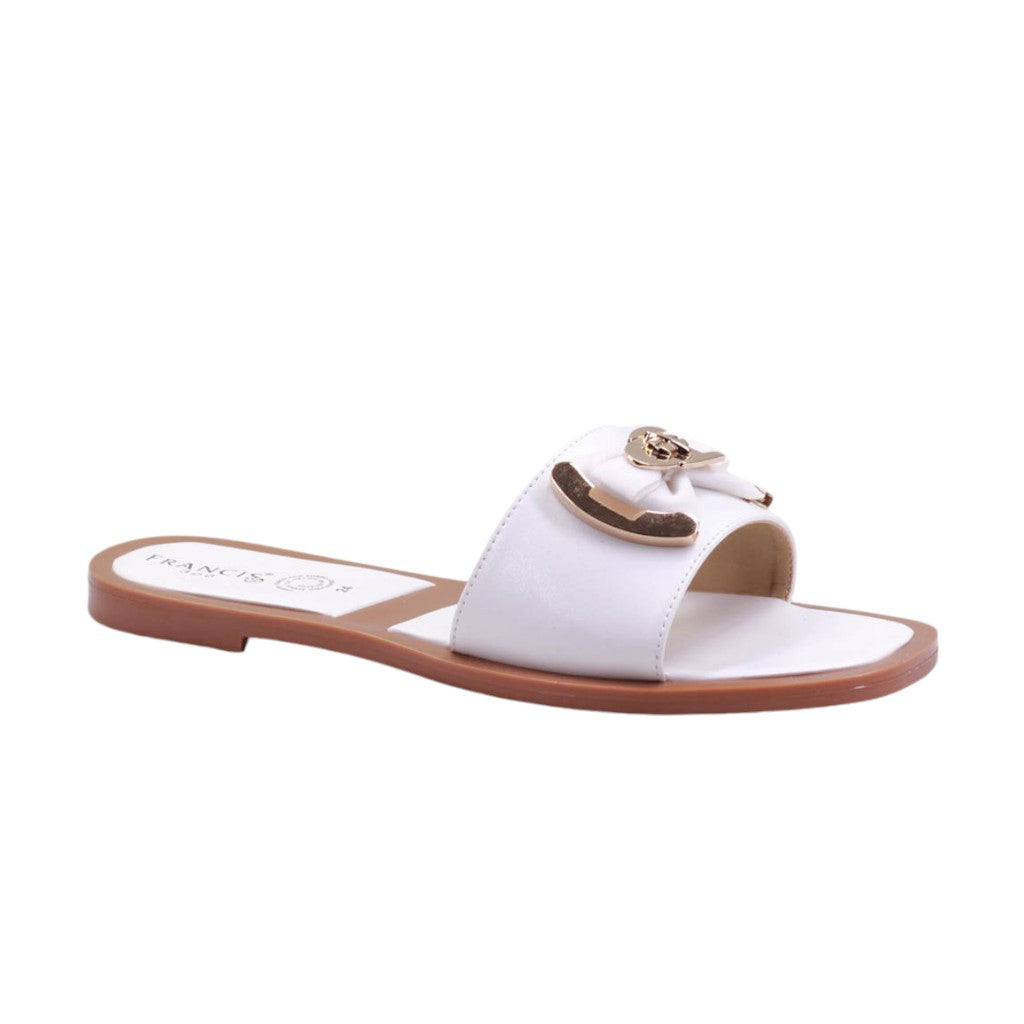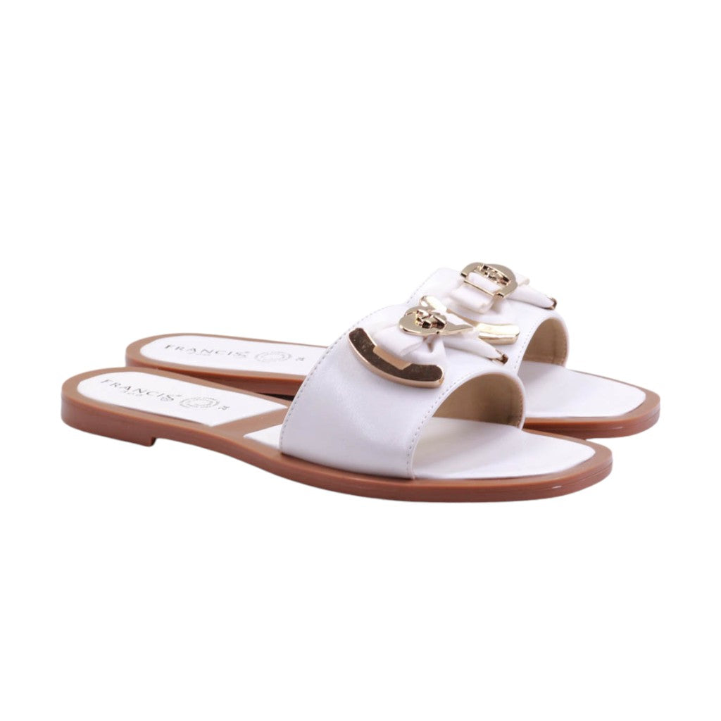Sandalia para dama marca Francis en colores blanco y negro. Este modelo cuenta con un tacón bajo y un moño de adorno, lo que lo hace perfecto para un look casual en casa o en la playa. Con su diseño de dedo, brinda comodidad y estilo para cualquier ocasión.