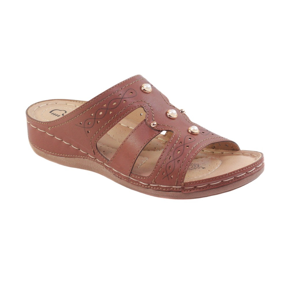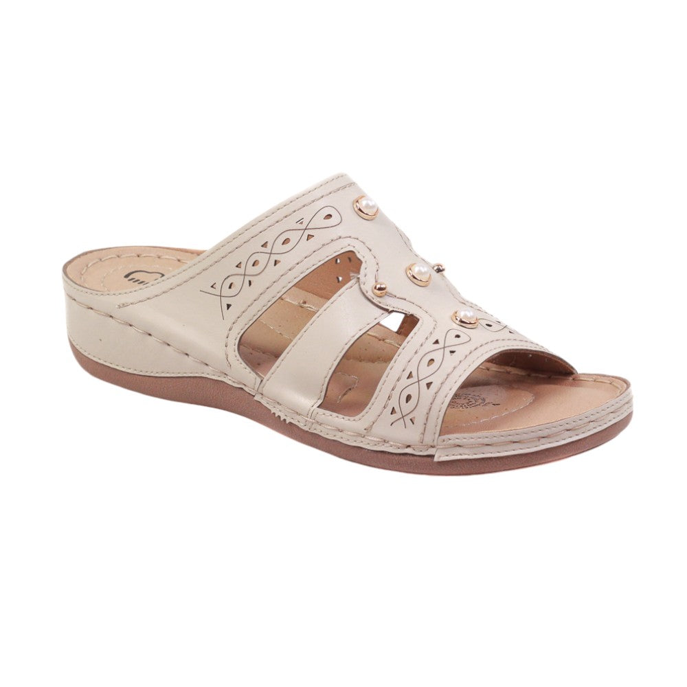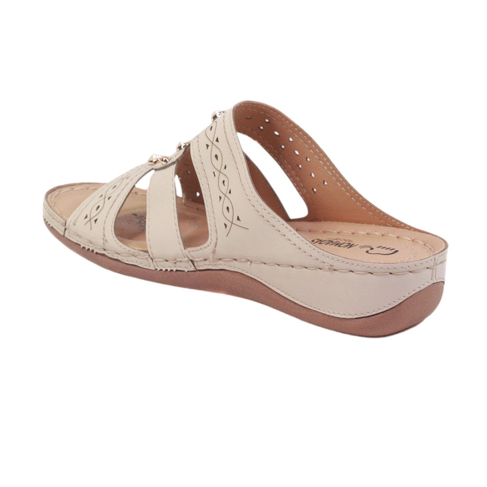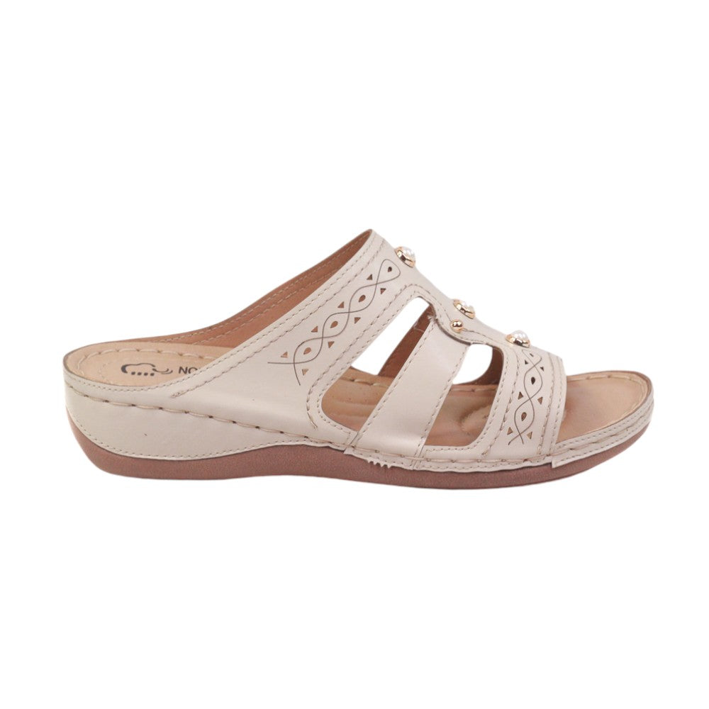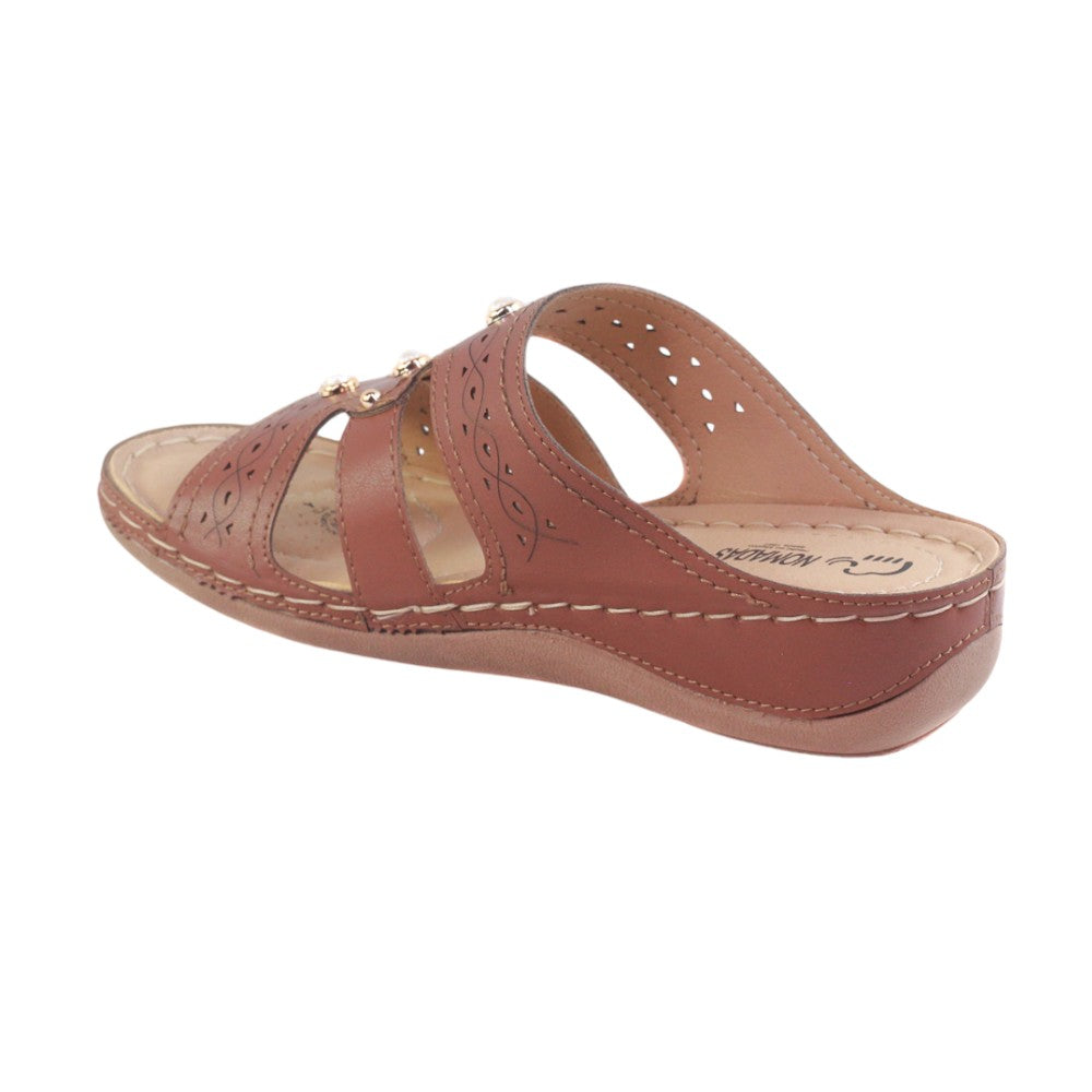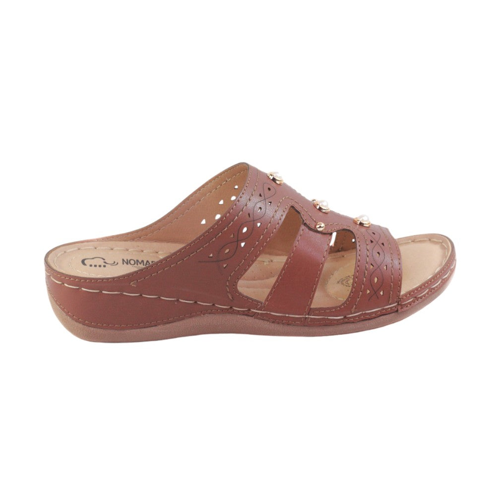 Sandalia para dama marca Nomadas en color nude y tan. Bonito diseño con perforaciones y perlas de adorno, cuenta con plantilla acojinada y ergonómica.
