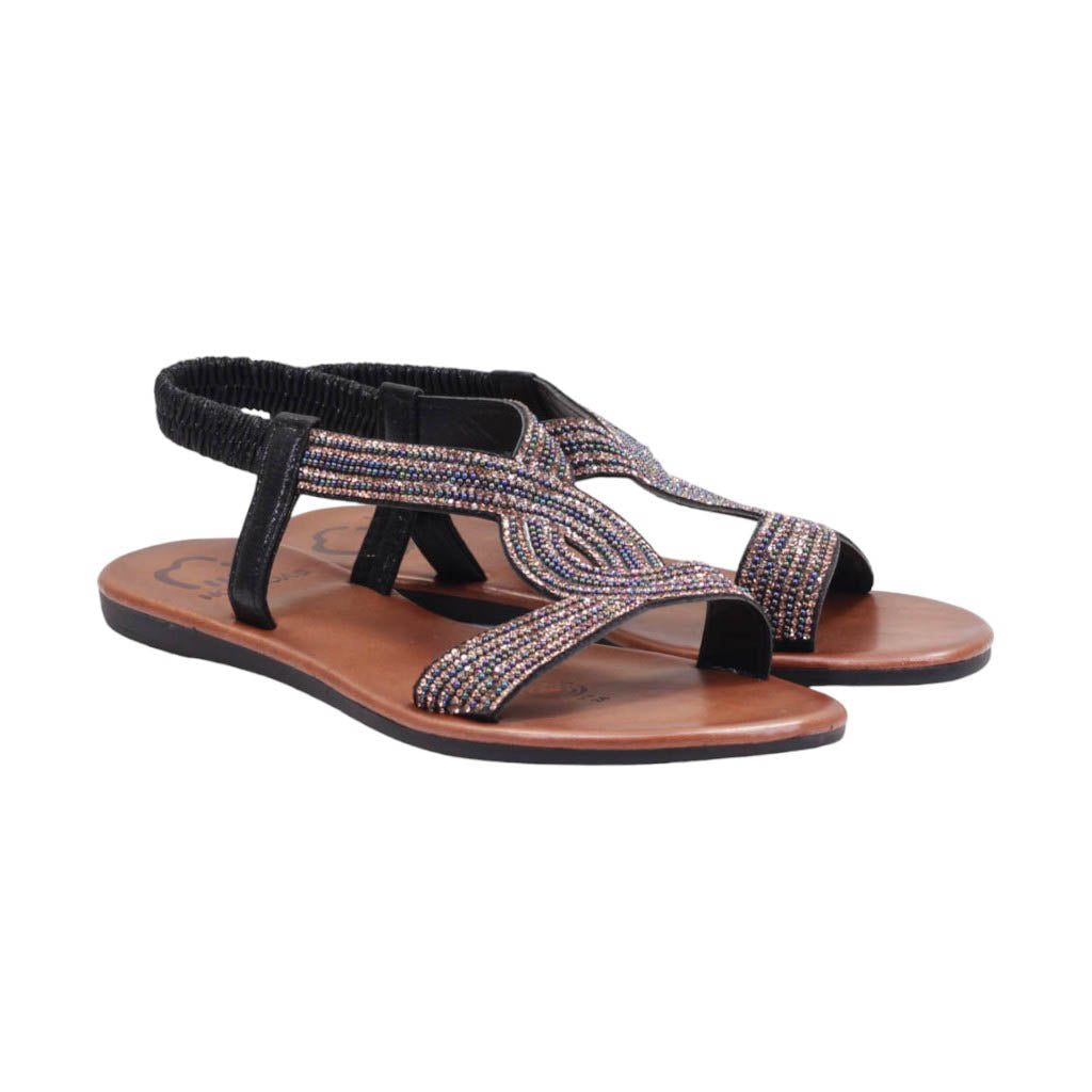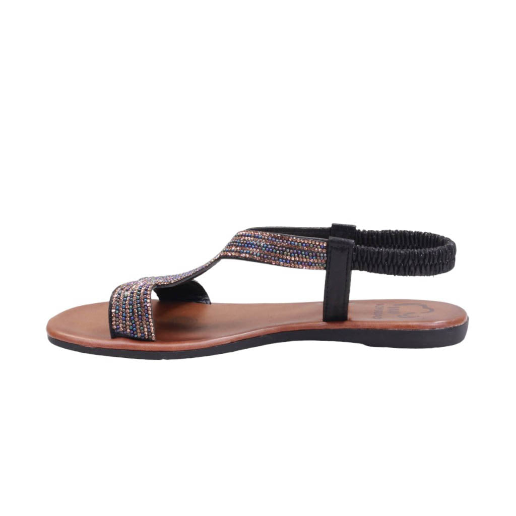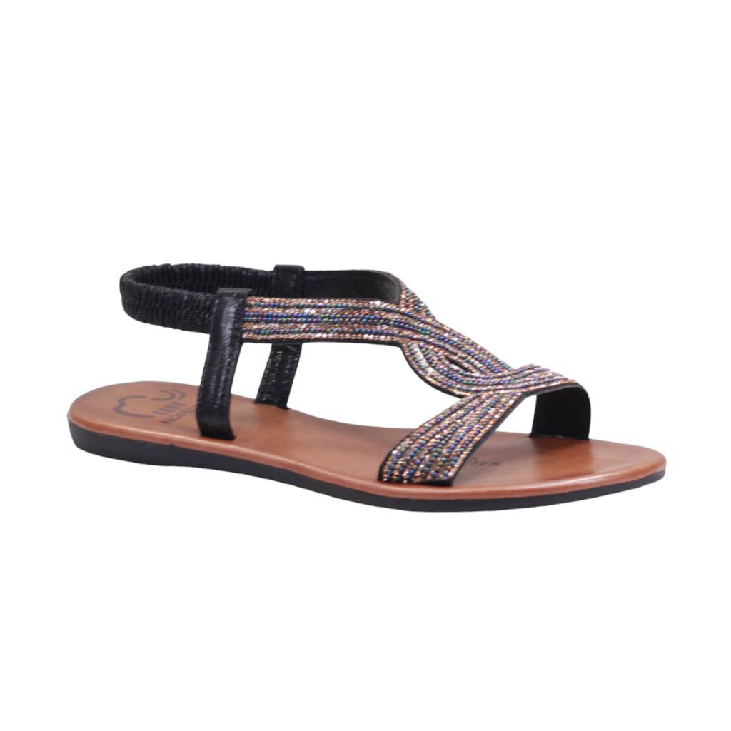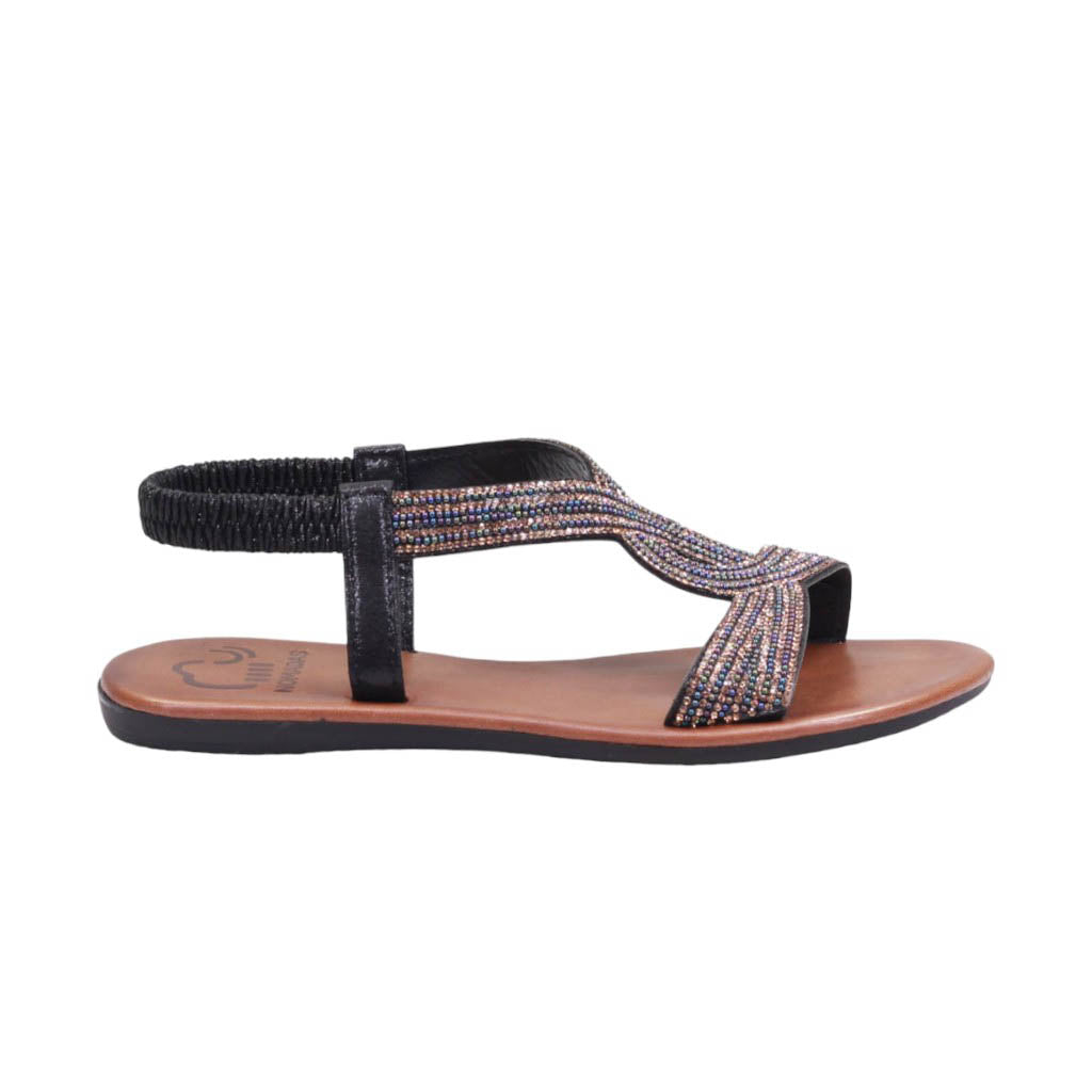 Sandalia para dama marca Nómadas en color negro. Este modelo cuenta con una tira trasera elástica y un diseño de pedrería en múltiples tonos. Además, su plantilla brinda una comodidad excepcional. Disfruta de estilo y confort con este zapato único.