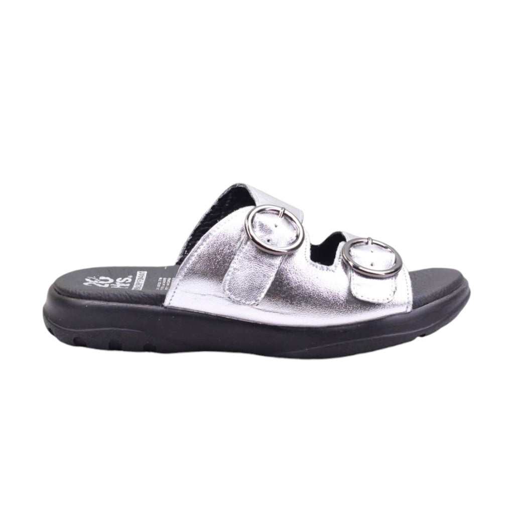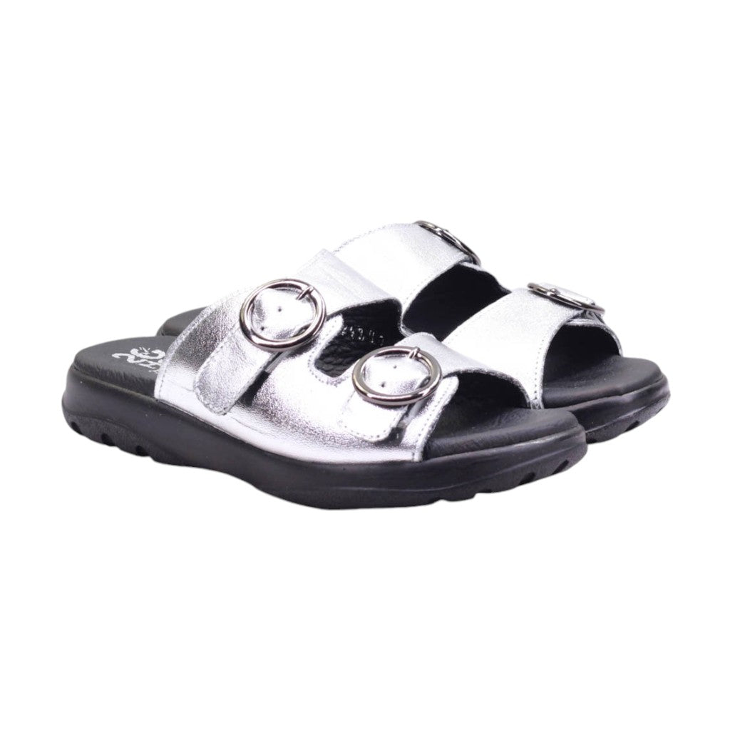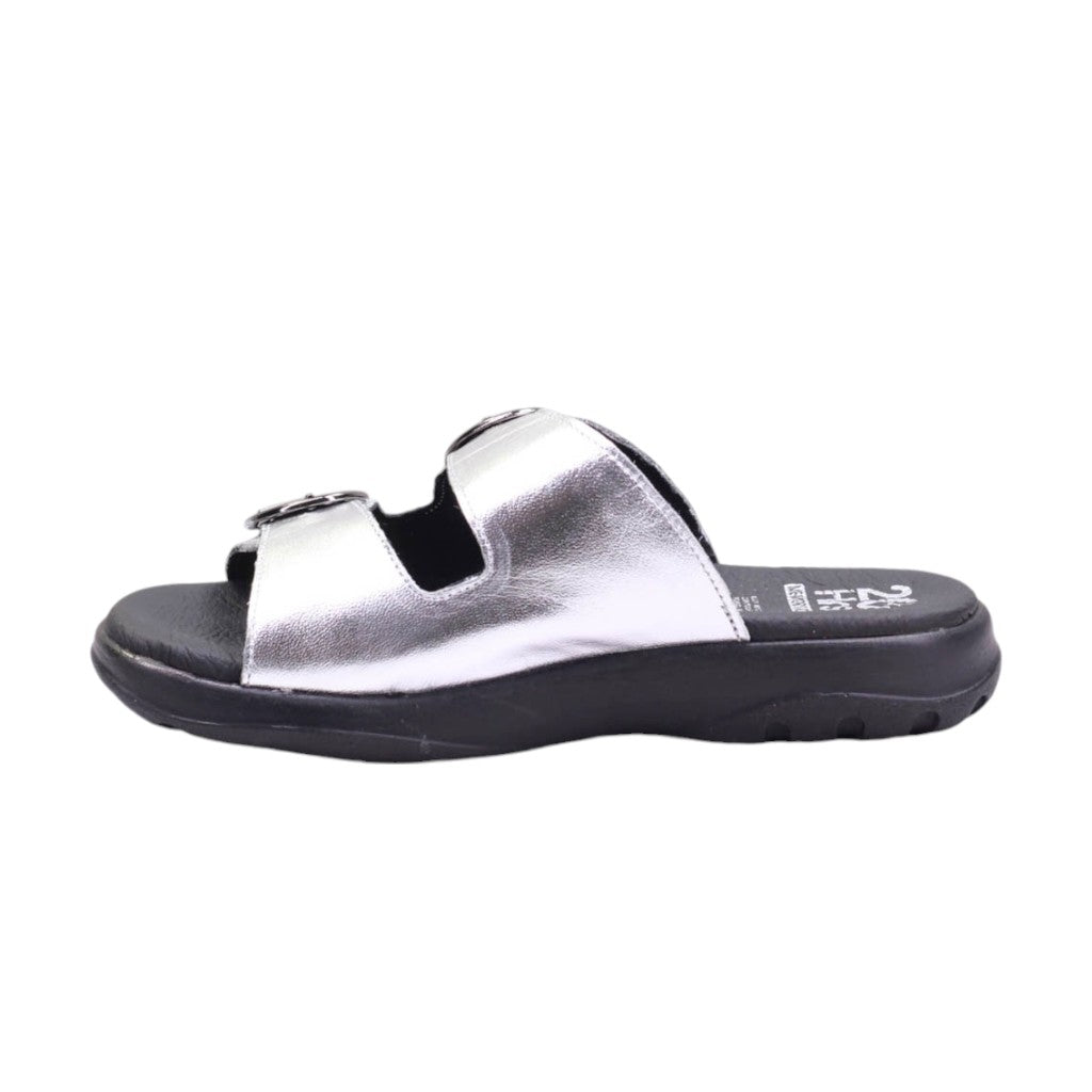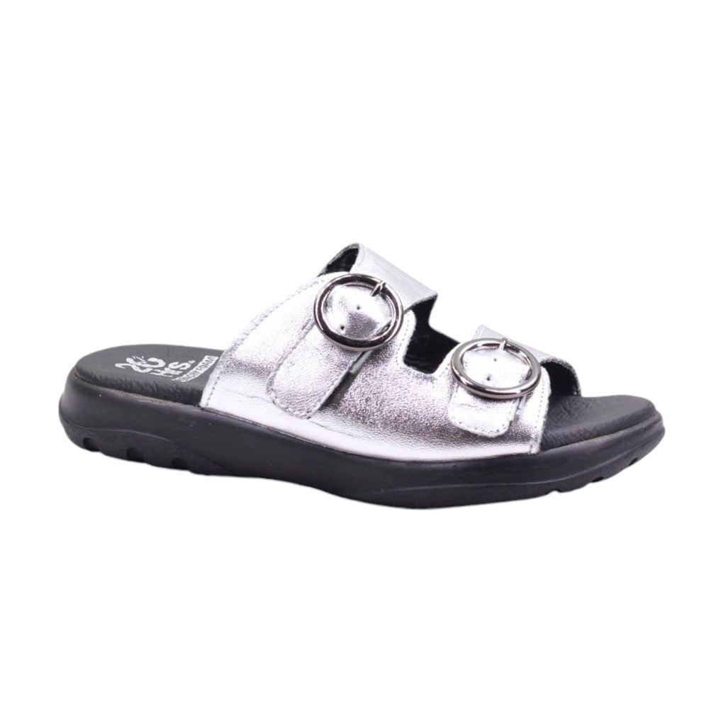 Sandalia para dama marca 20 Horas en colores plata y seda. Mejora tu comodidad con nuestro modelo de confort diseñado con cortes de piel caprina y una plantilla de confort. También cuenta con doble tira ajustable y una suela ligera para mayor ligereza