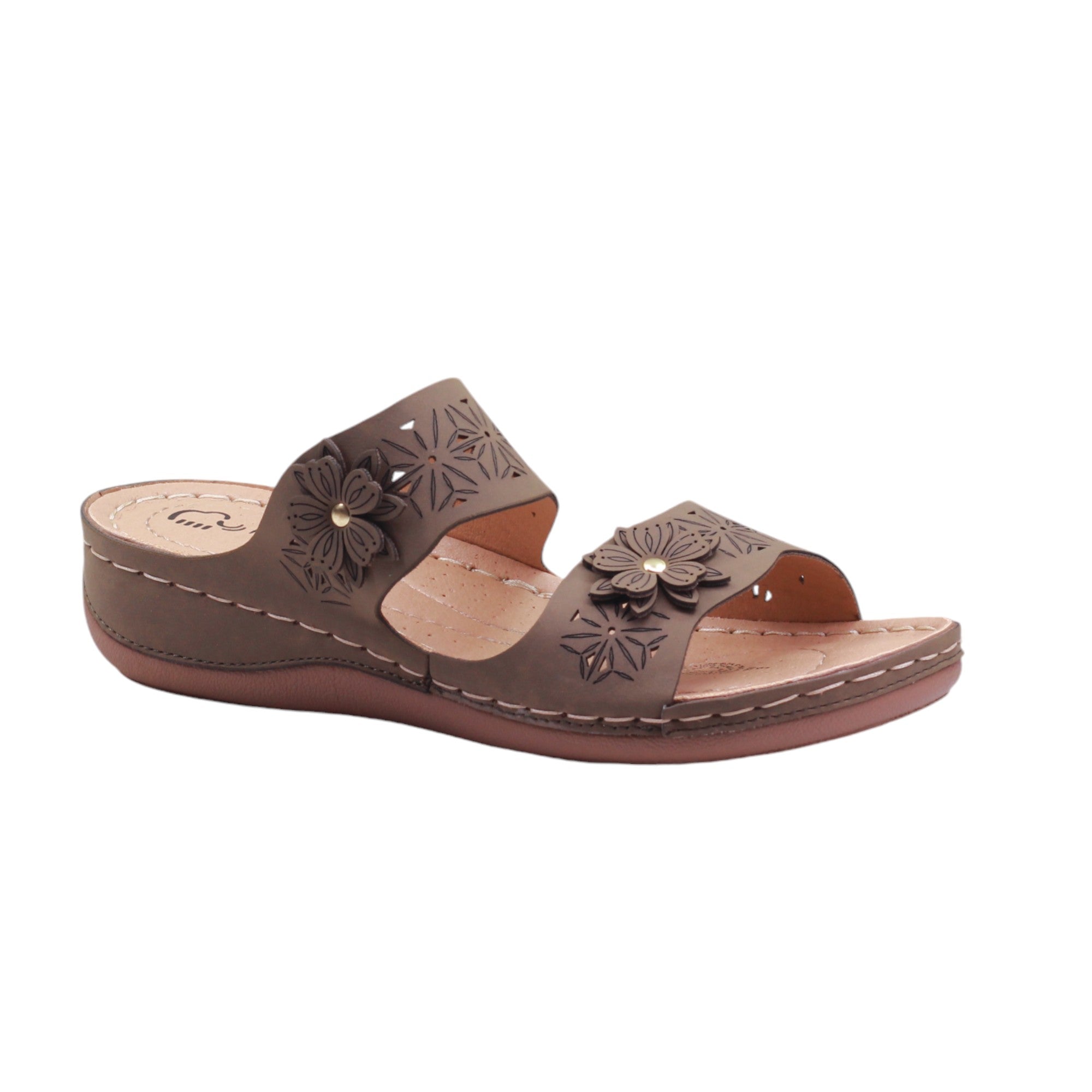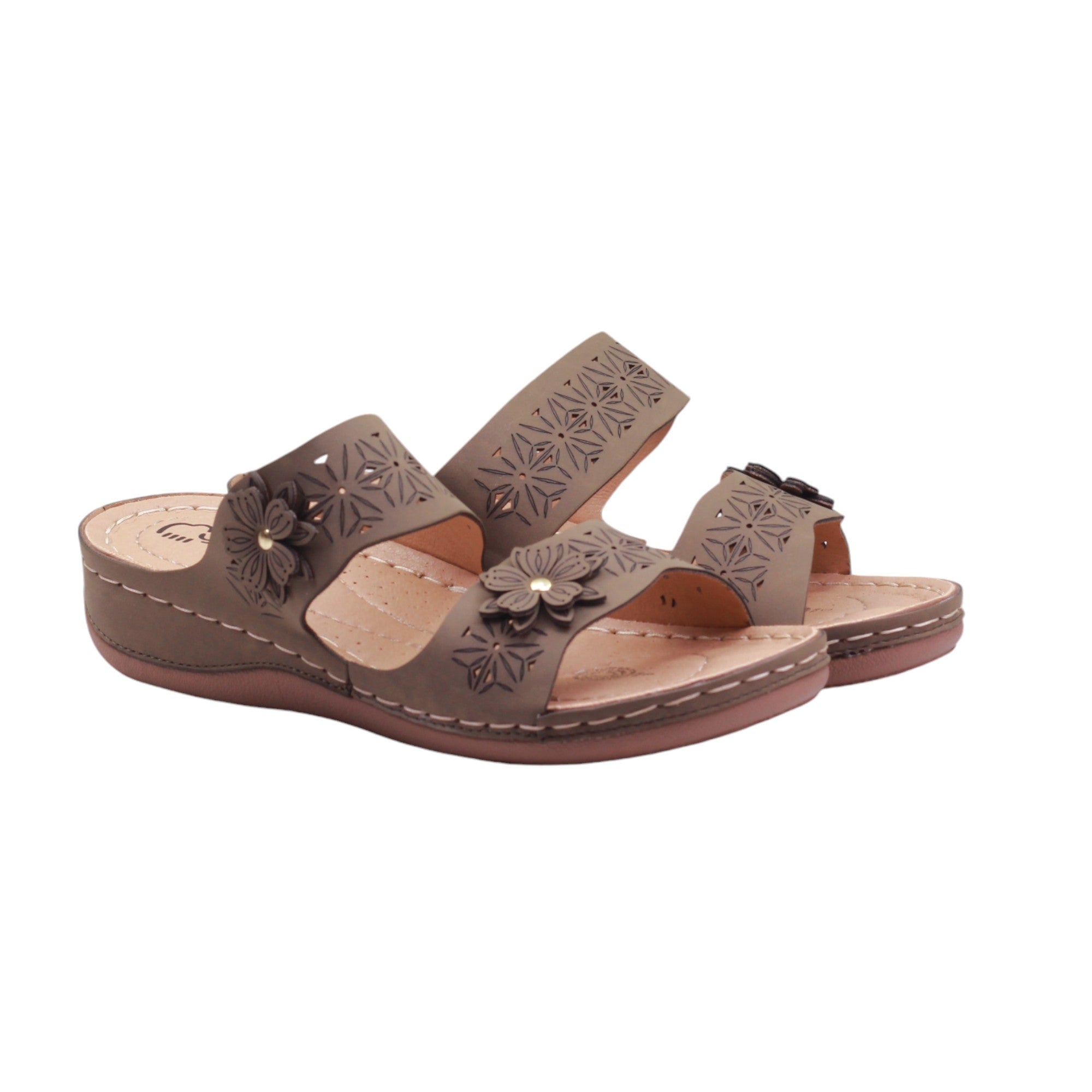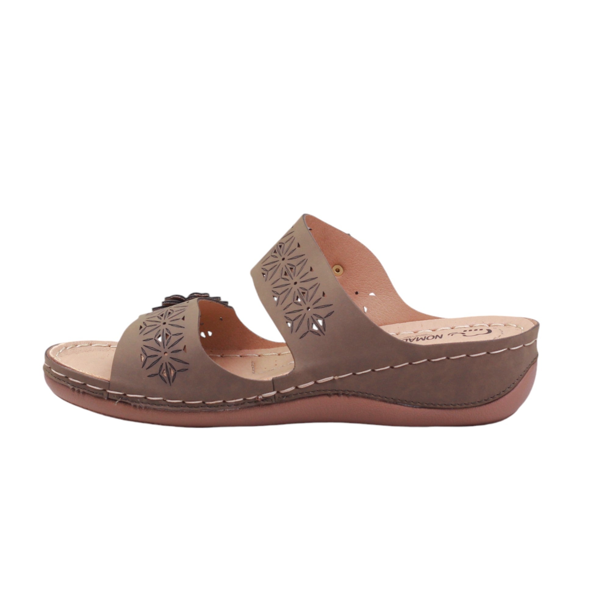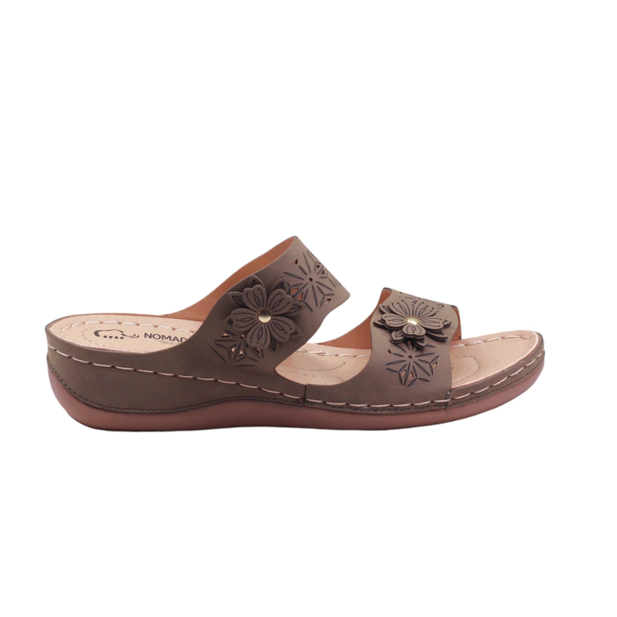 Sandalia para dama marca Nómadas en color musgo. Este modelo de plataforma cuenta con una altura de 4.00 cm, lo que proporciona una elevación cómoda y segura al caminar. Además, su doble tira ancha con flores de adorno le da un toque elegante y femenino, perfecto para cualquier ocasión. Experimente estilo y comodidad con esta plataforma única.