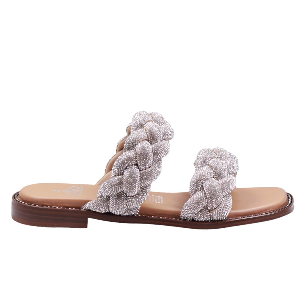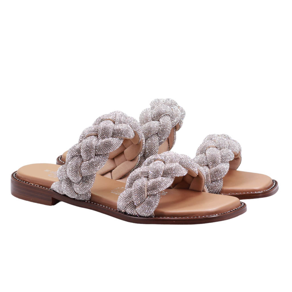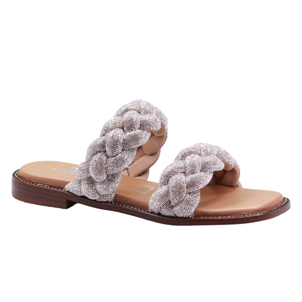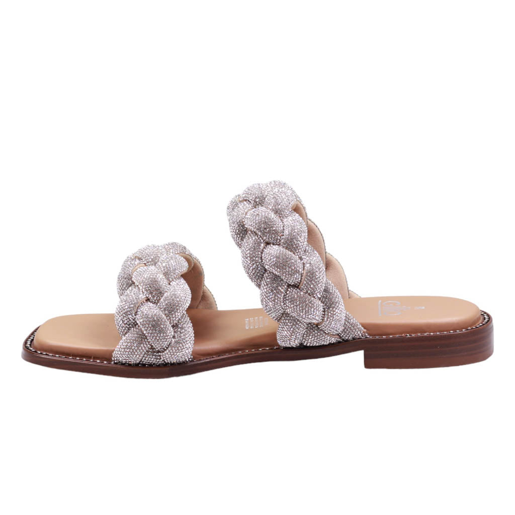 Sandalia para dama de la marca Gillio en color plata. Este modelo de plantilla de confort con doble tira trenzada cubierta en pedrería y tacón de 2.00 centímetros es el complemento perfecto para mantenerte cómodo y elegante. La plantilla brinda apoyo a tus pies, mientras que las tiras trenzadas y la pedrería añaden un toque de sofisticación. Ideal para cualquier ocasión.