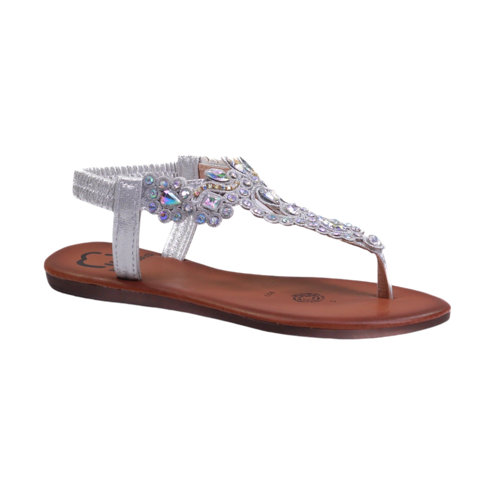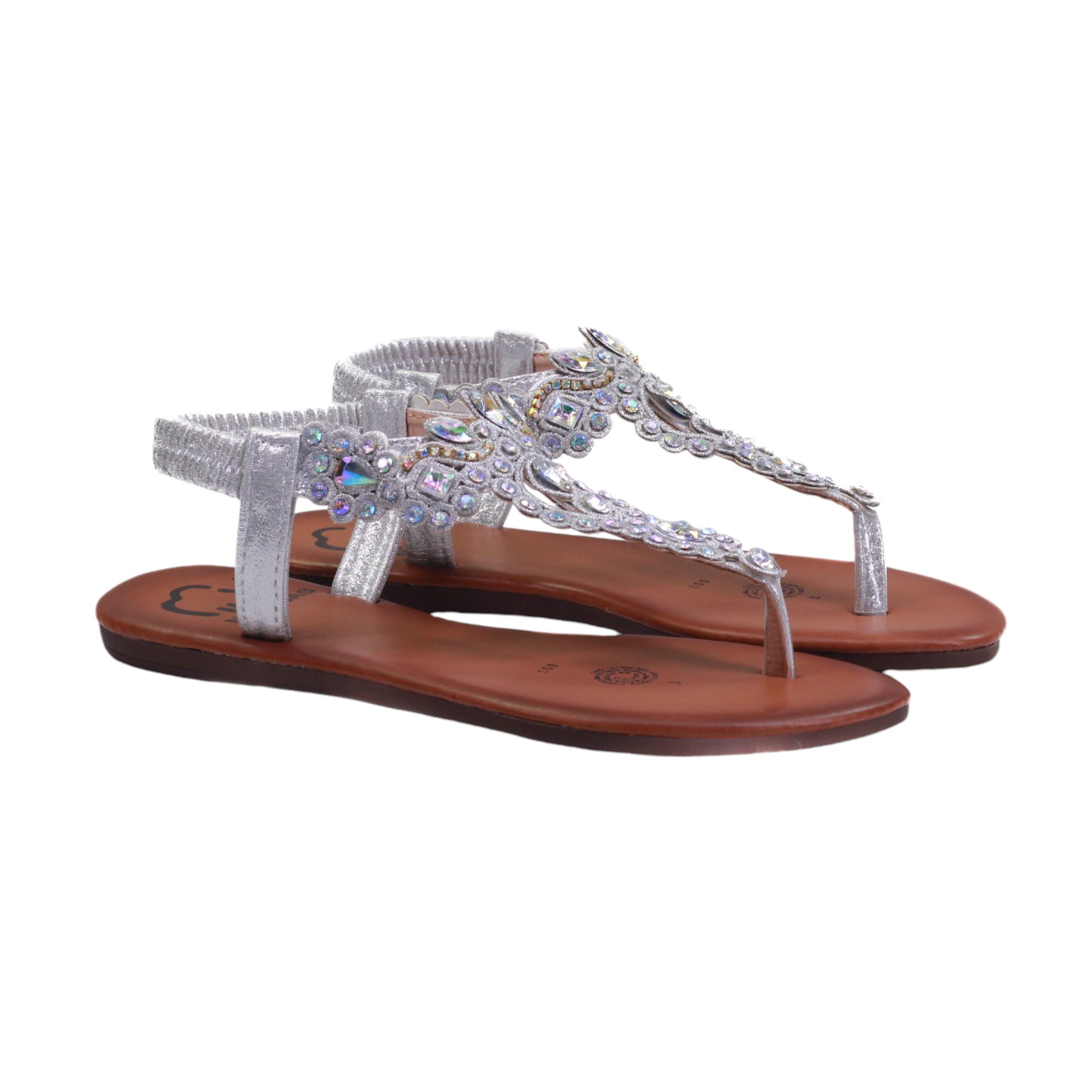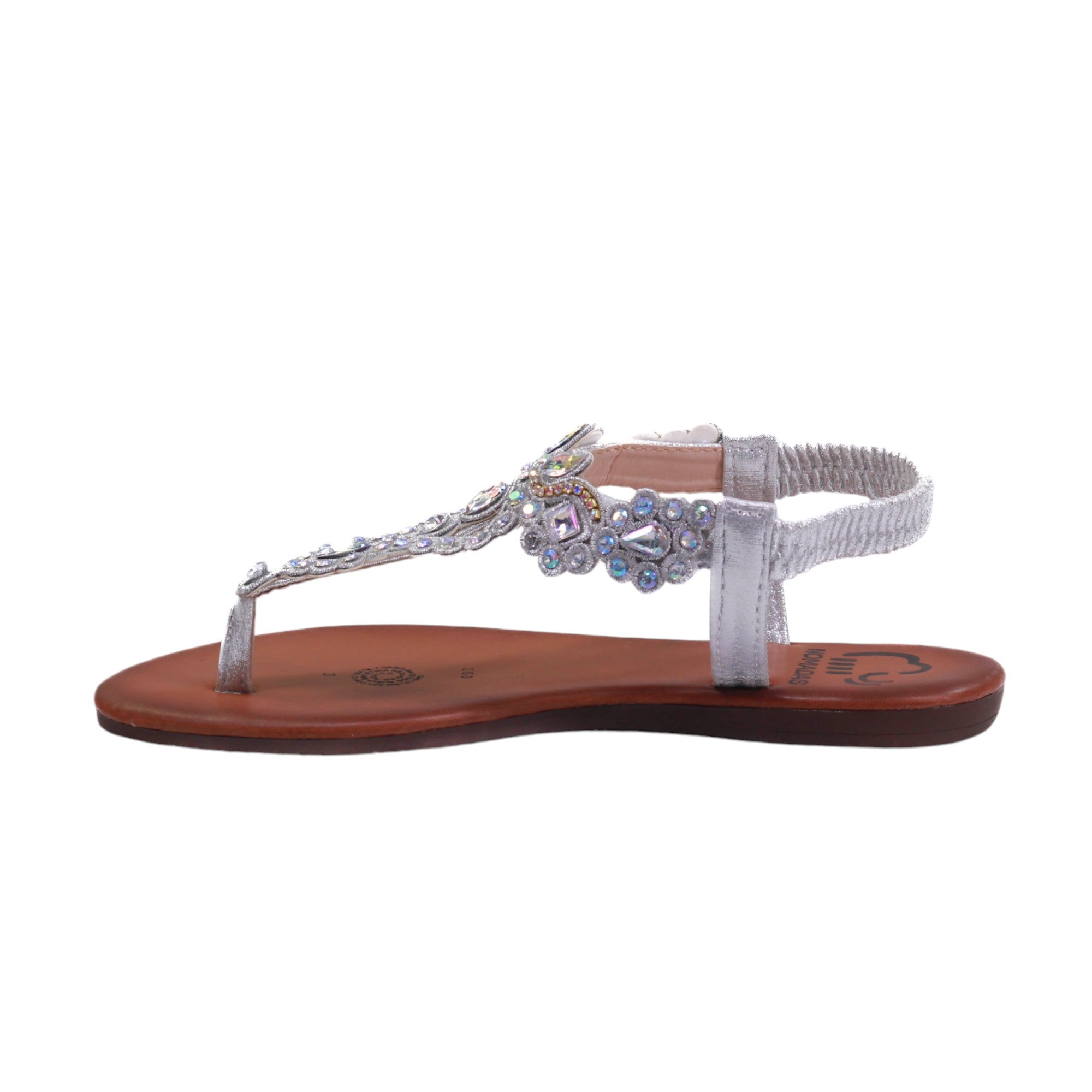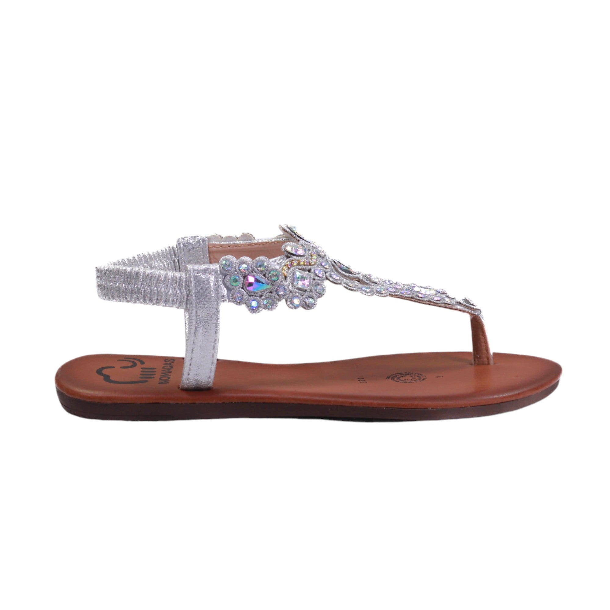 Sandalia para dama marca Nómadas en color plata. Este modelo es de horca pollo y cuenta con piedras varias, lo cual le da un estilo auténtico, su plantilla de confort es adecuada para el uso diario. Perfectas para casa o playa. Modelo que no puede faltar en tu guardarropa