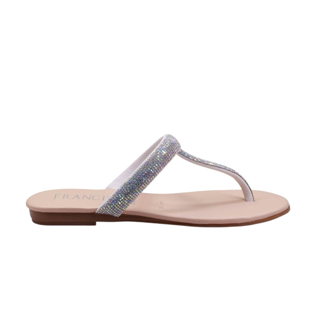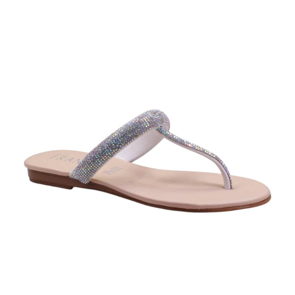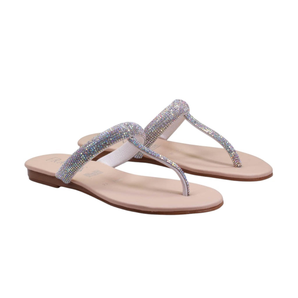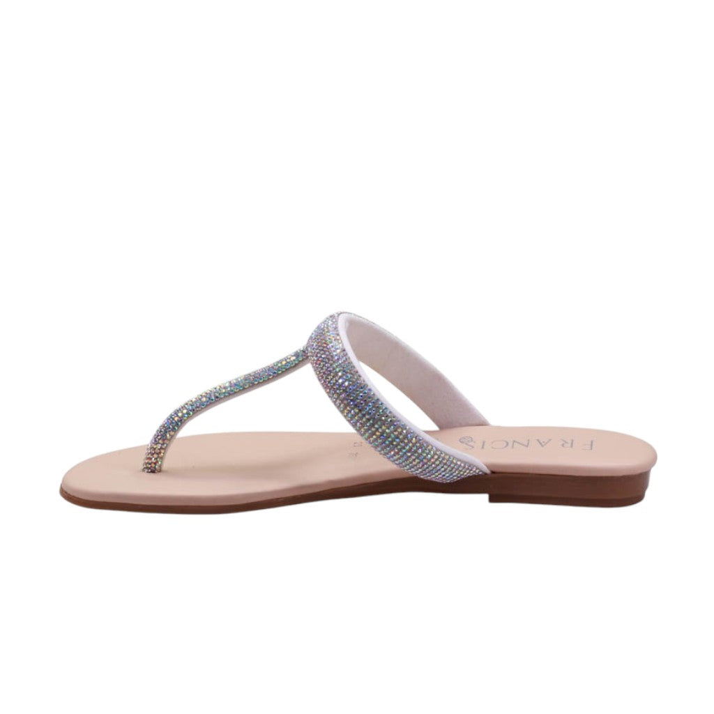 Sandalia para dama marca Francis en color plata. Este modelo cuenta con tira cubierta en pedrería, es una sandalia clásica, lo cual hace que no pase de moda, su tacón de 1.00 cm es adecuado para el uso diario. Perfectas para casa o playa. Modelo que no puede faltar en tu guardarropa.