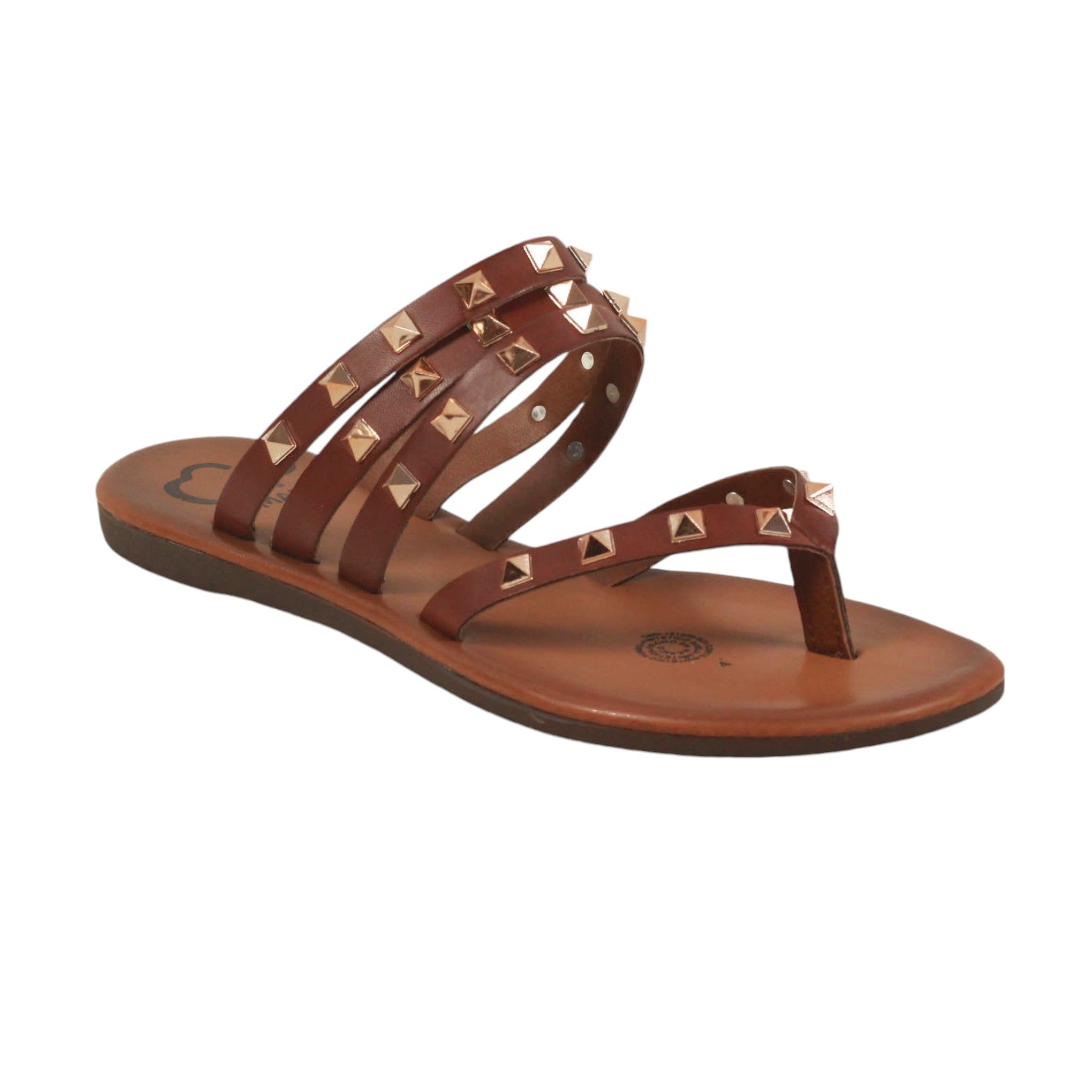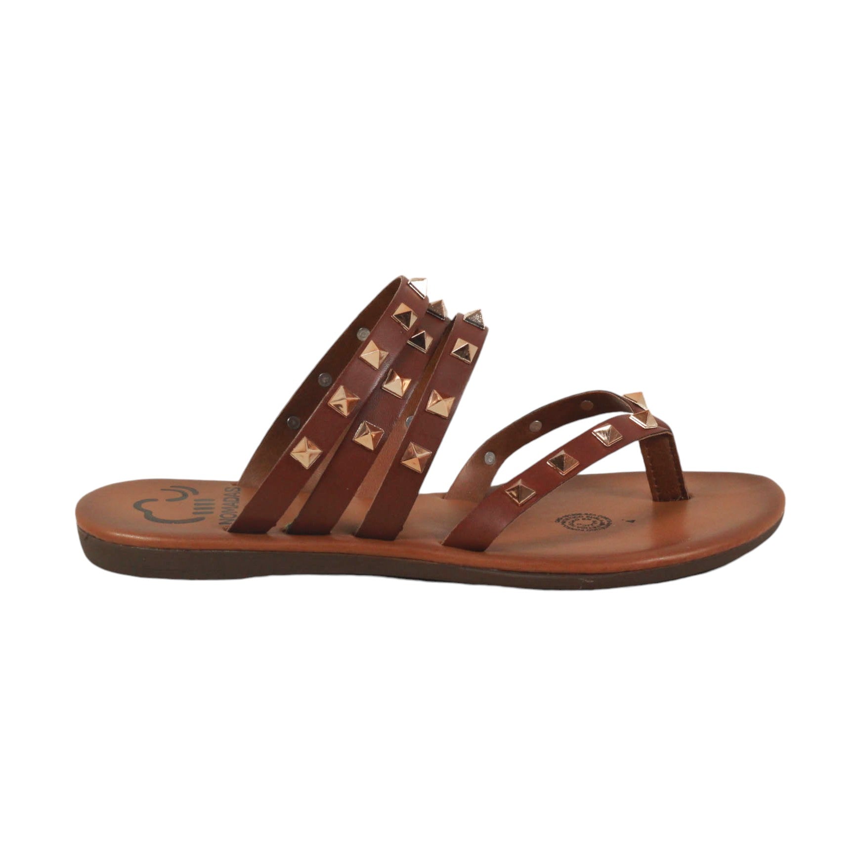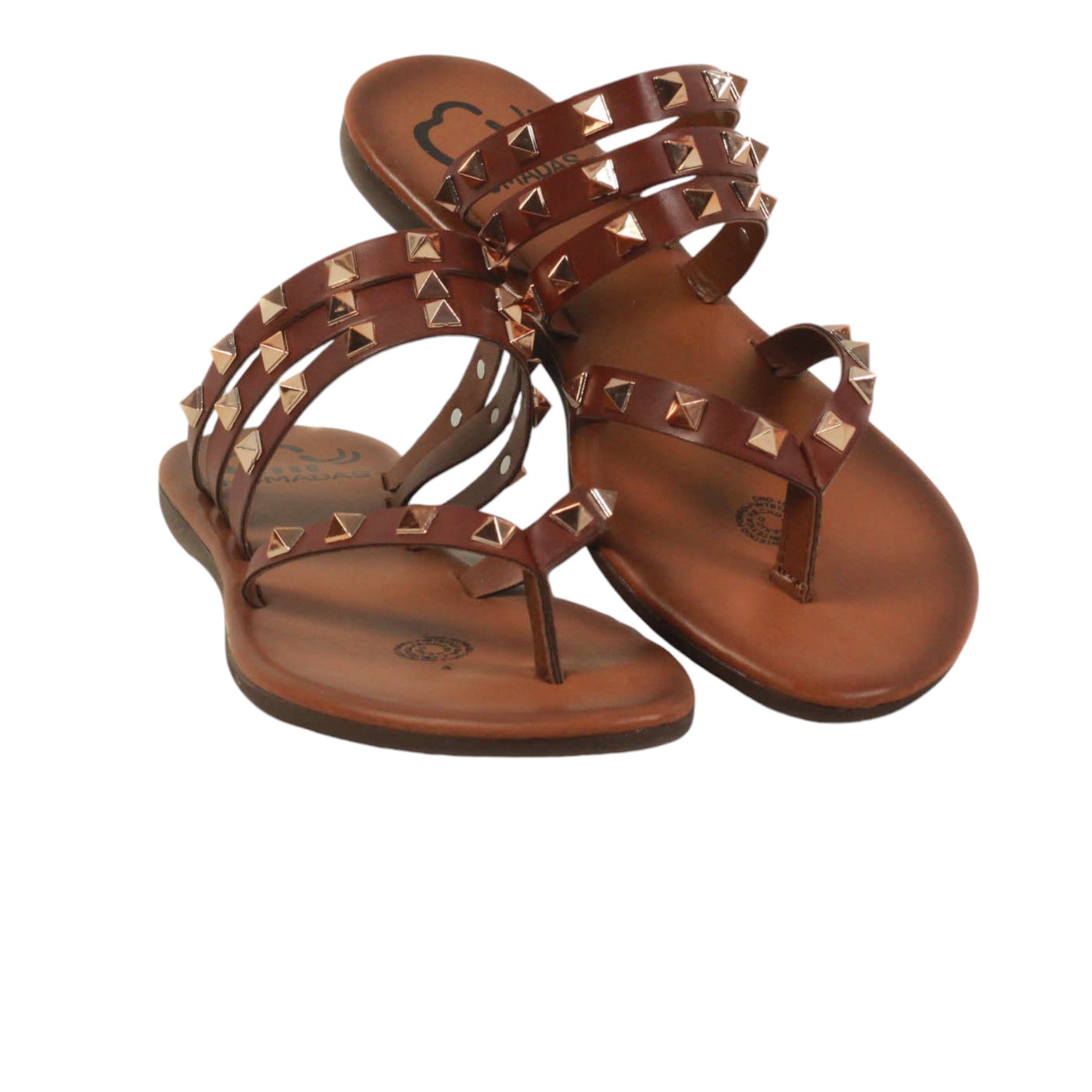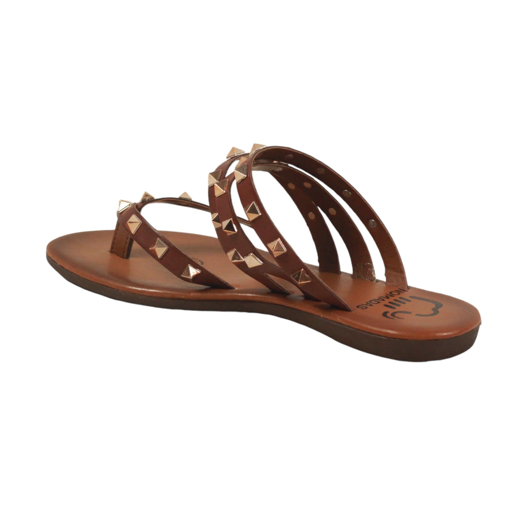 Sandalia para dama marca Nomadas en color tan. Diseño de horca pollo con cuatro tiras con estoperoles  que le da un toque atractivo, cuenta con plantilla de confort que facilita tus caminatas paso a paso.