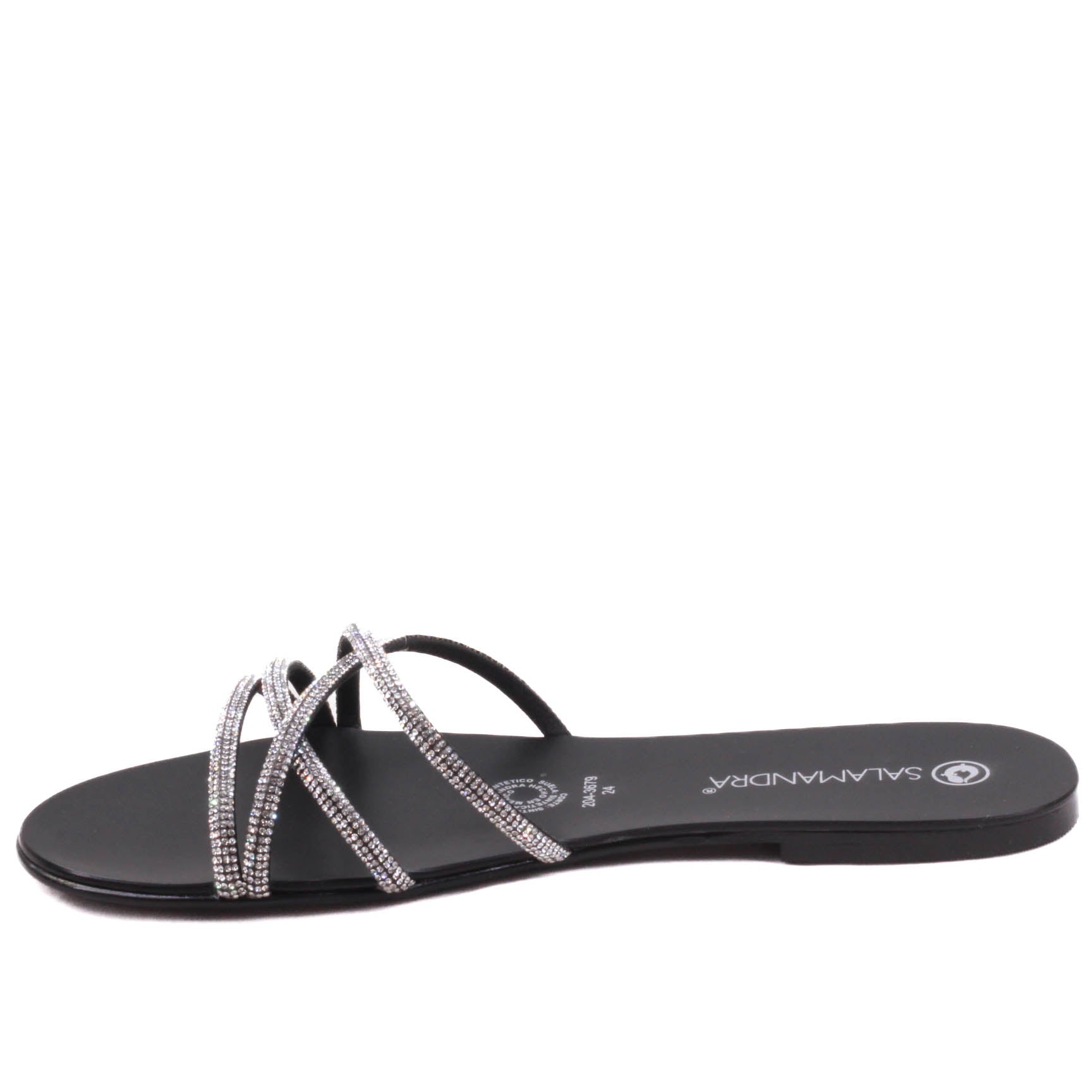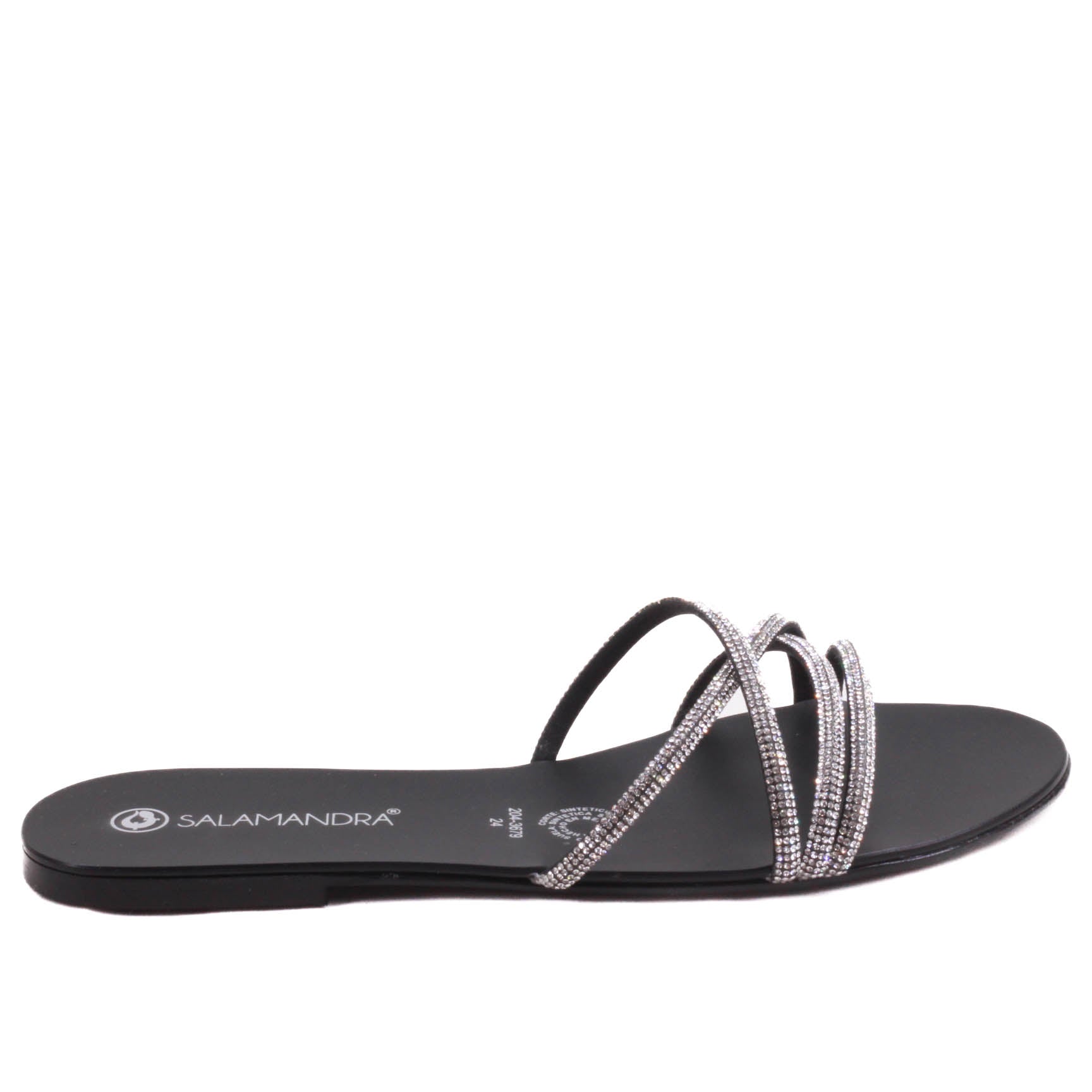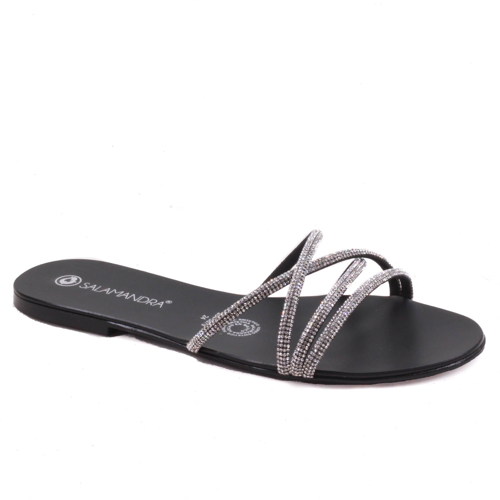 Sandalia para dama marca Salamandra en color negro. Esta bella sandalia, cuenta con terminado es piedras en las tiras, es de piso y metedera lo cual brinda una comodidad excepcional, fácil de combinar con casi cualquier tipo de prenda.