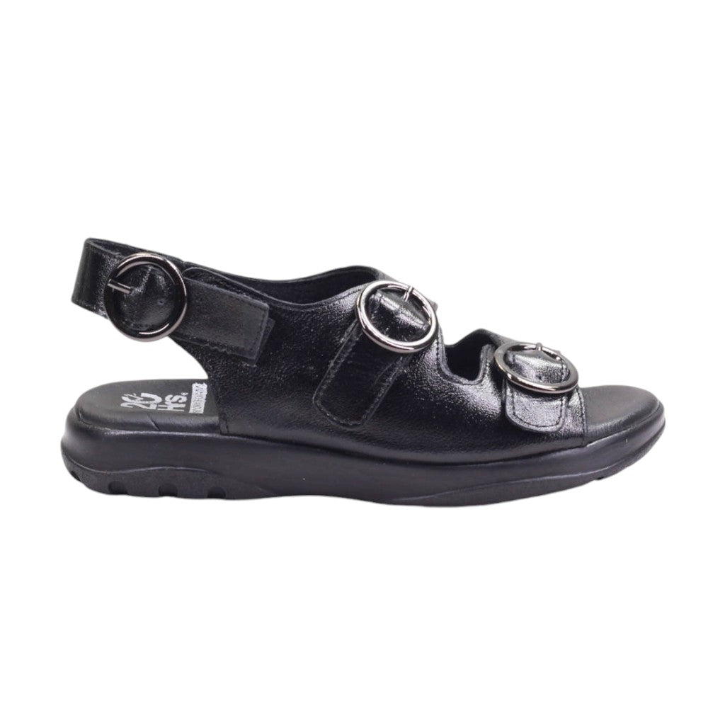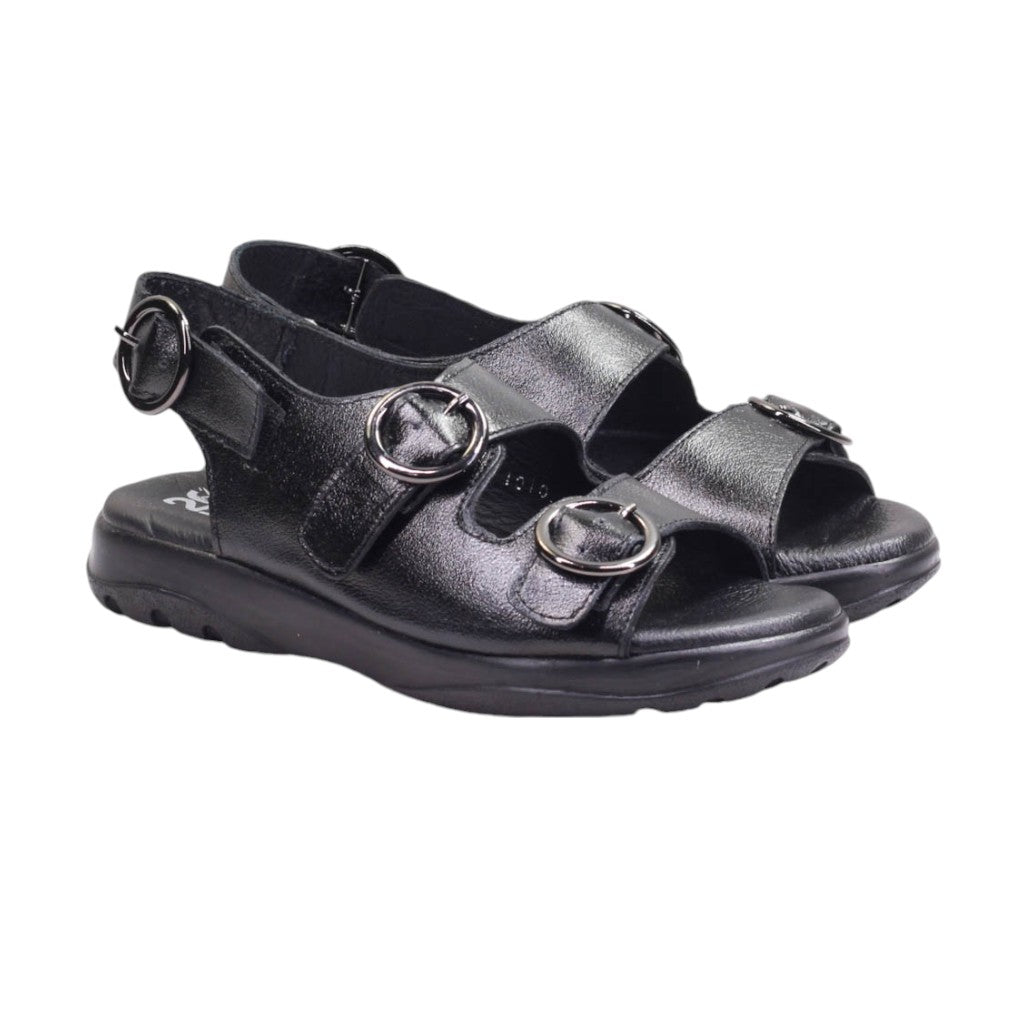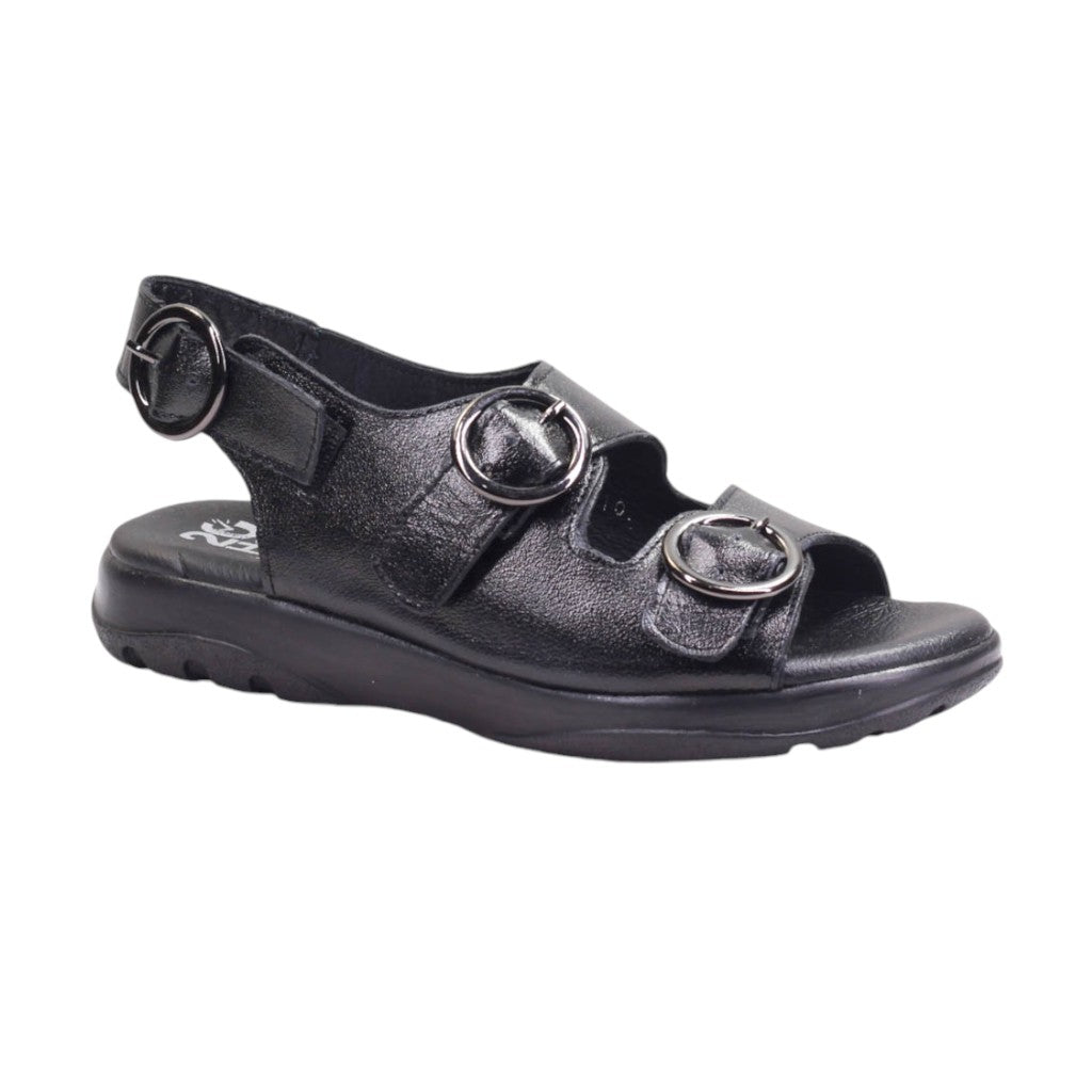 Sandalia para dama marca 20 Horas en colores negro, oro y vino. Diseñada con piel caprina, forro textil que brinda frescura y ligereza al caminar. Su diseño con tres tiras ajustables de velcro y apliques metálicos circulares le dan un toque moderno sin sacrificar funcionalidad. La suela tiene una altura de 2.5 cm, ideal para uso prolongado, y su plantilla de confort asegura pisadas suaves todo el día.