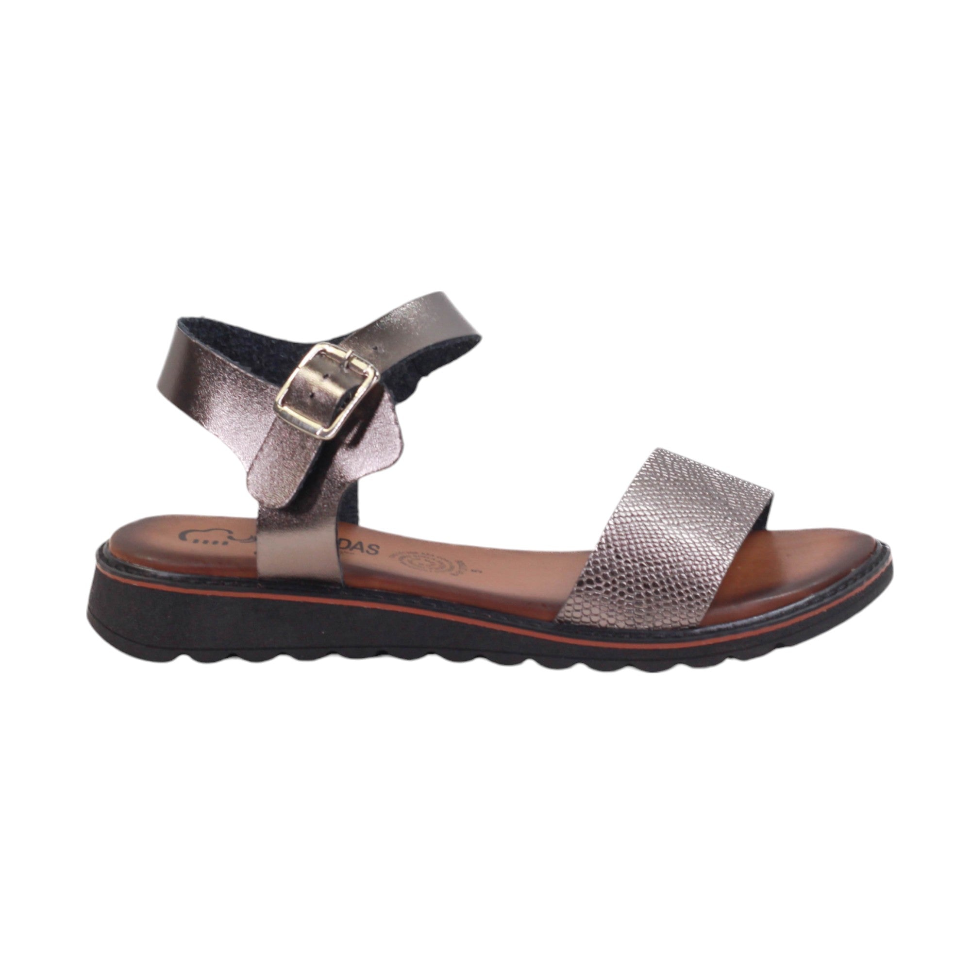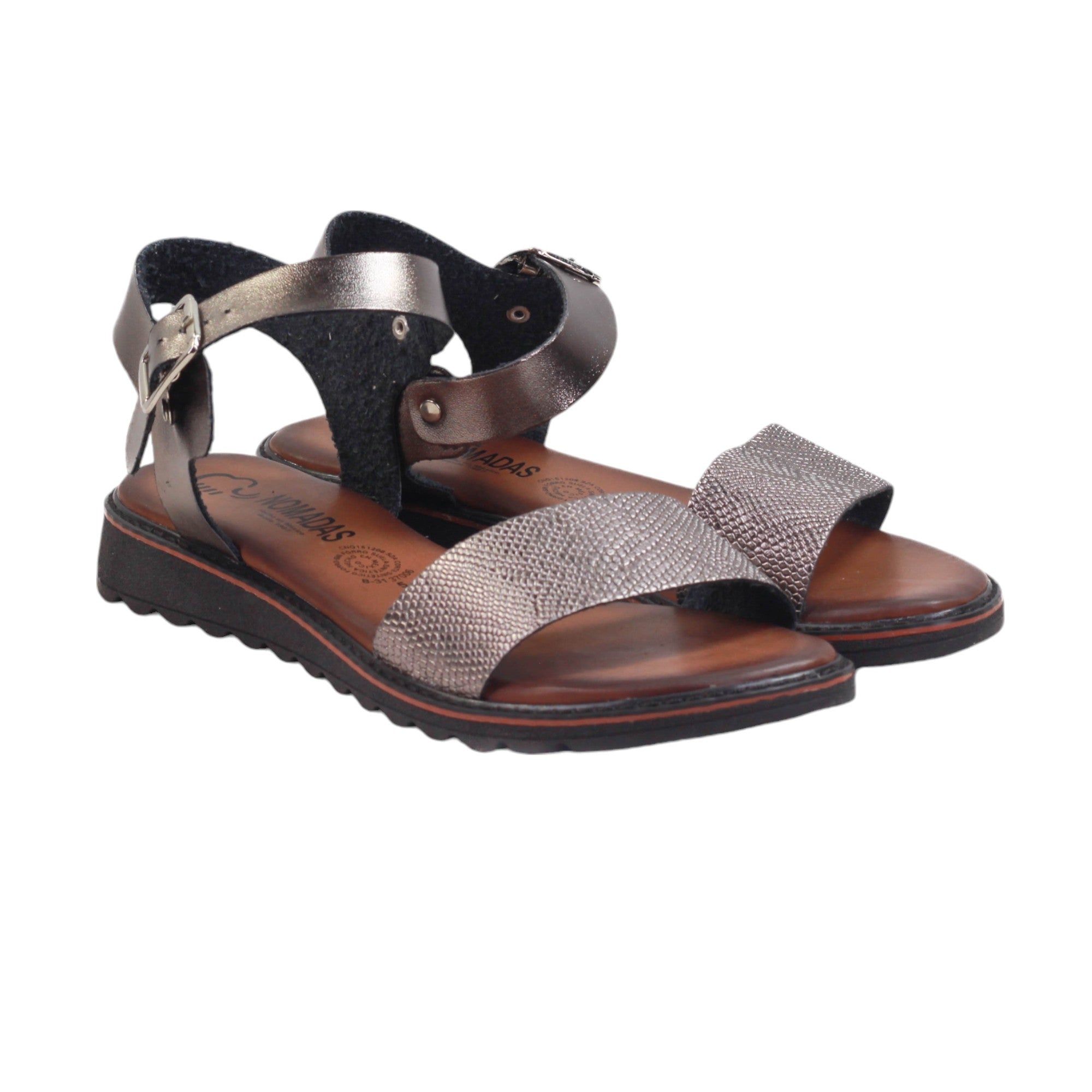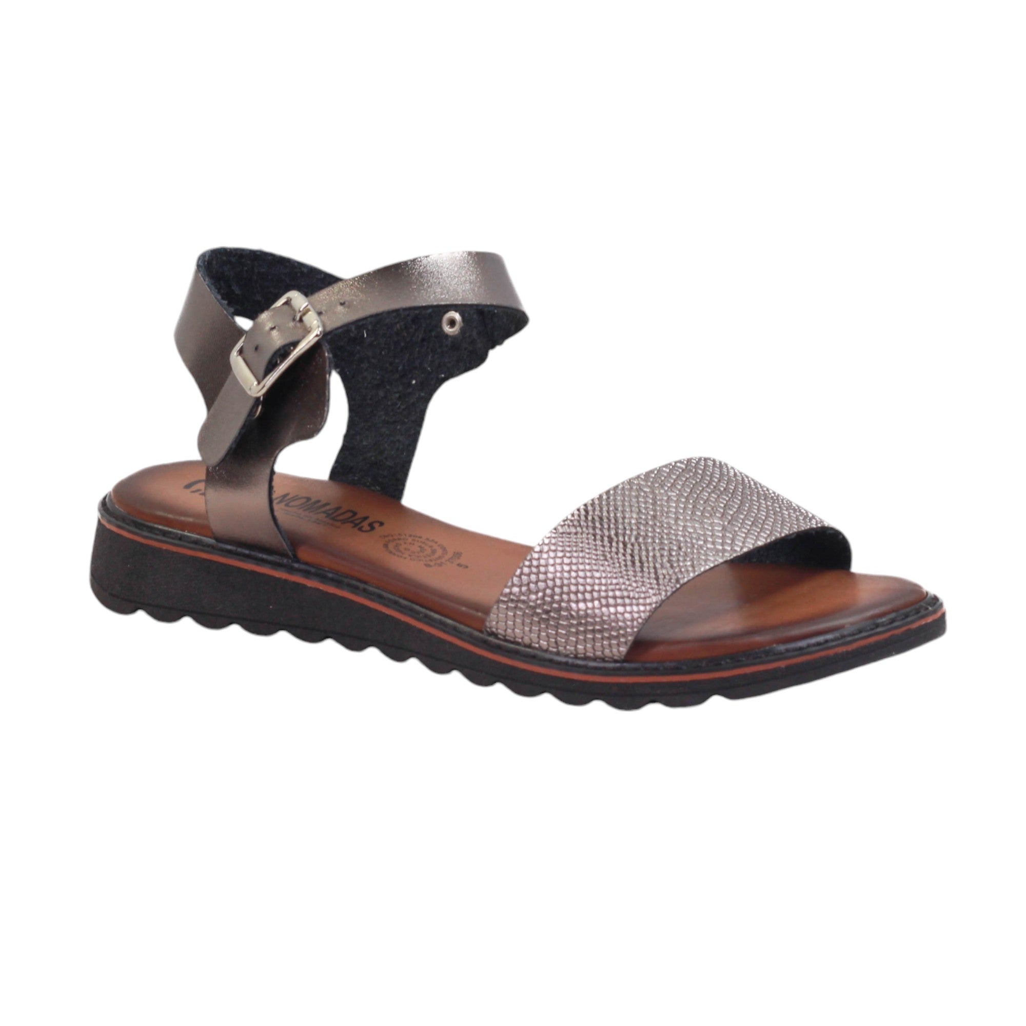 Sandalia para dama marca Nómadas en color inox. Cuenta con plantilla confortable para una comodidad absoluta. Son ligeras y prácticas para el día a día, corte en yute para una atractiva vista.