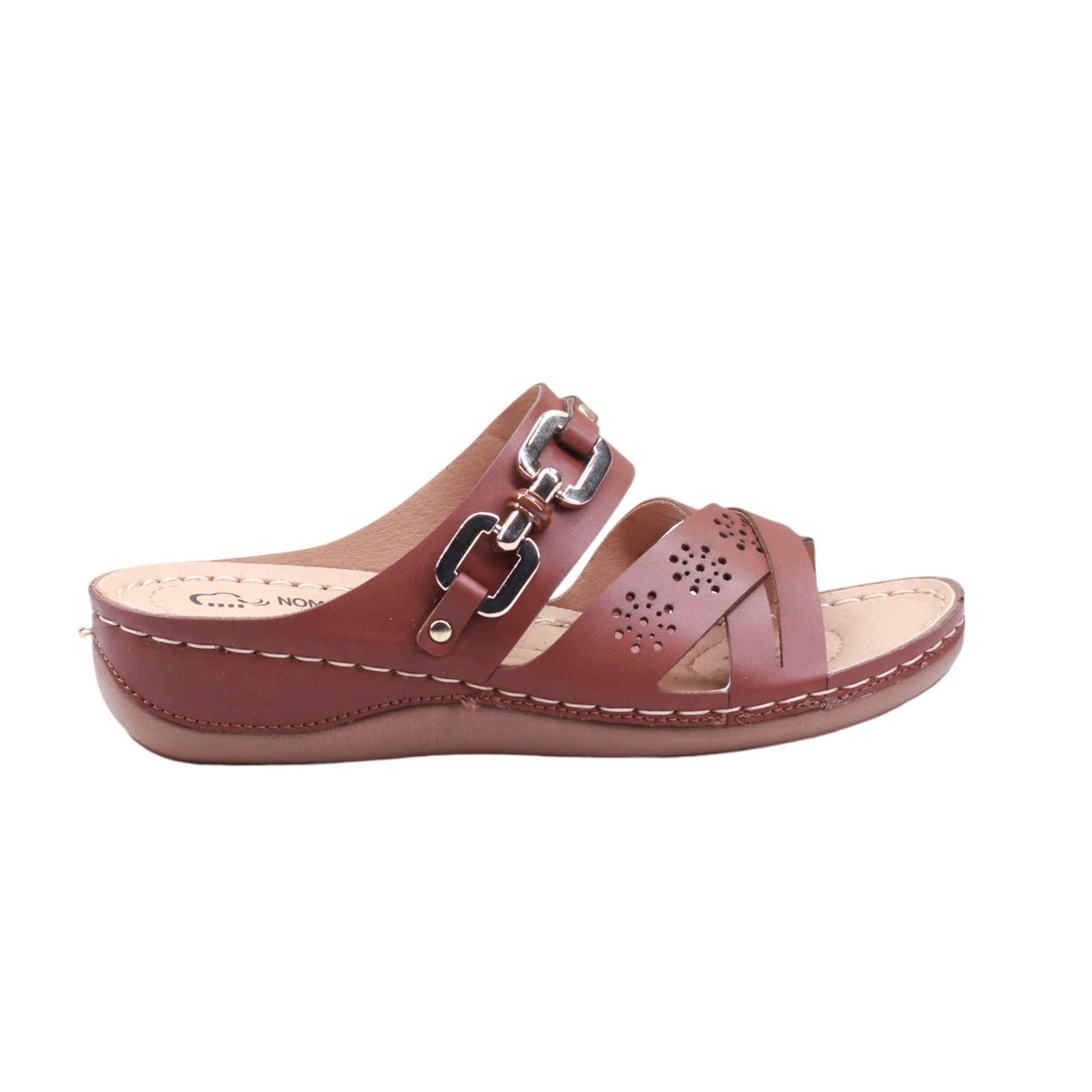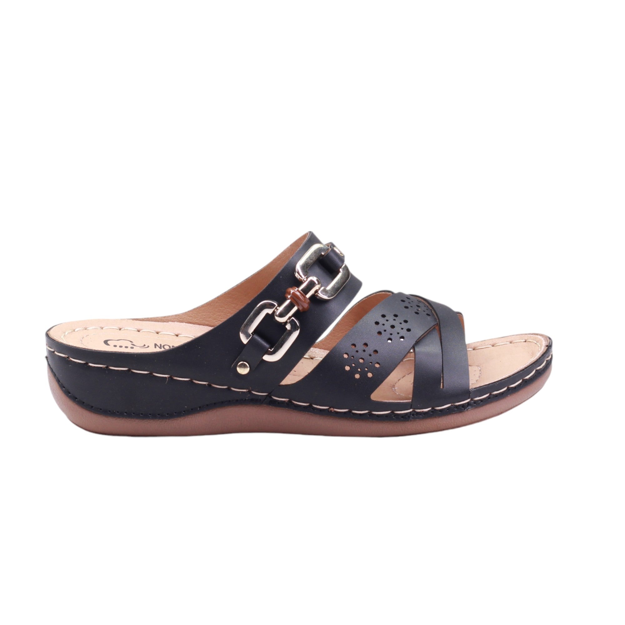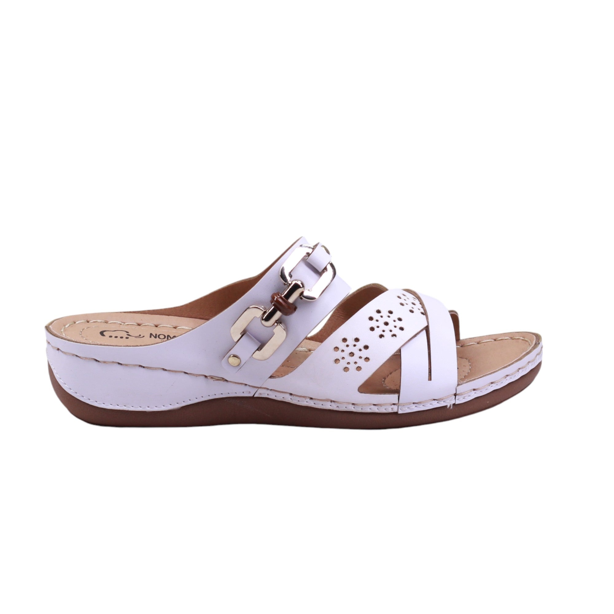 Sandalia para dama marca Nómadas en colores blanco, negro y tan. Este modelo de plataforma cuenta con una altura de 4.00 cm, lo que proporciona una elevación cómoda y segura al caminar. Además, su tira ancha con adorno metálico le da un toque femenino, perfecto para cualquier ocasión. Experimente estilo y comodidad con esta plataforma única.