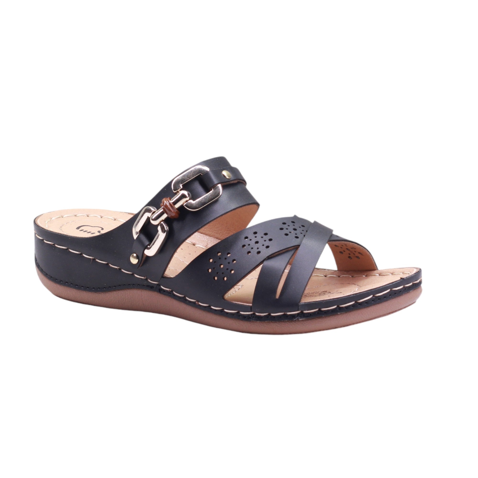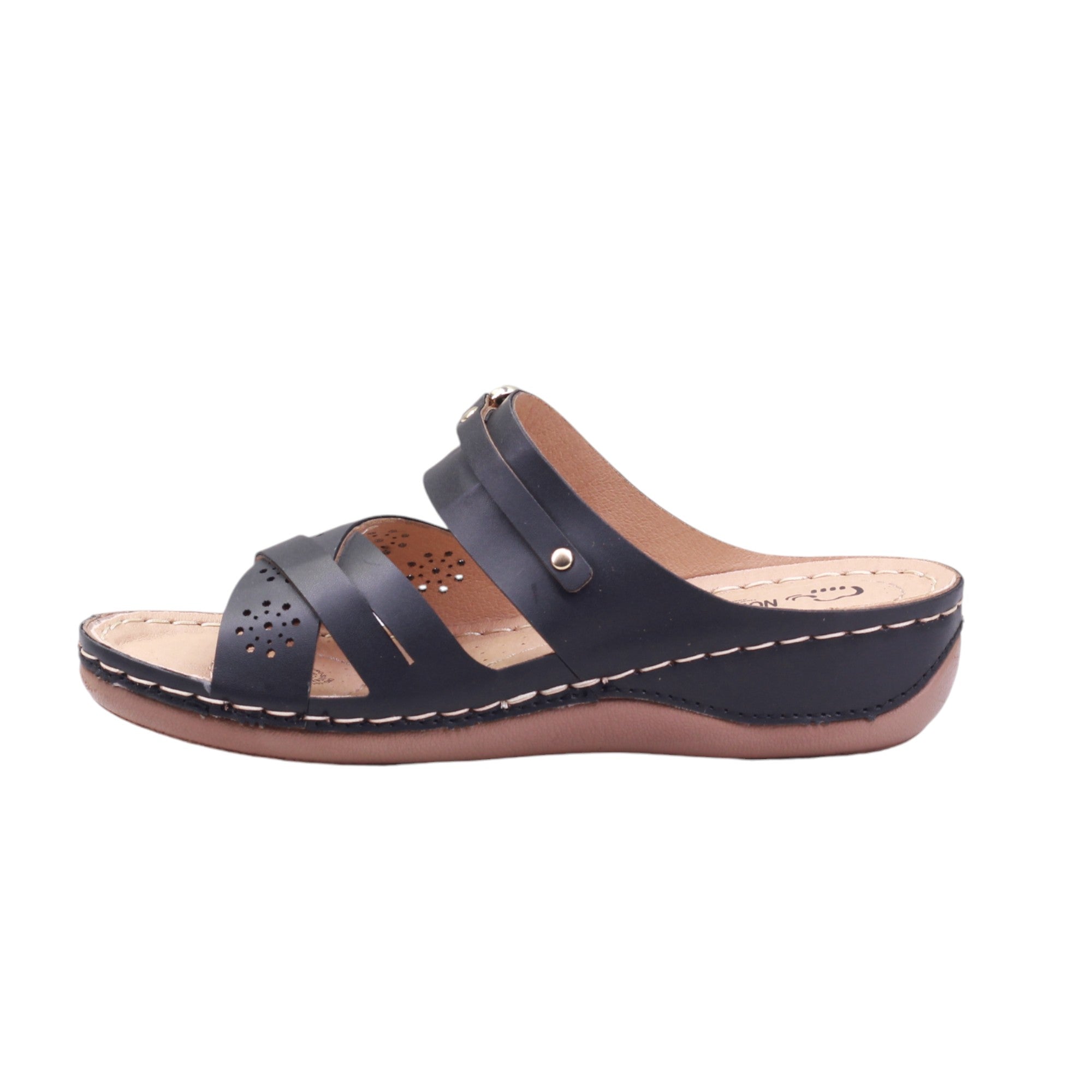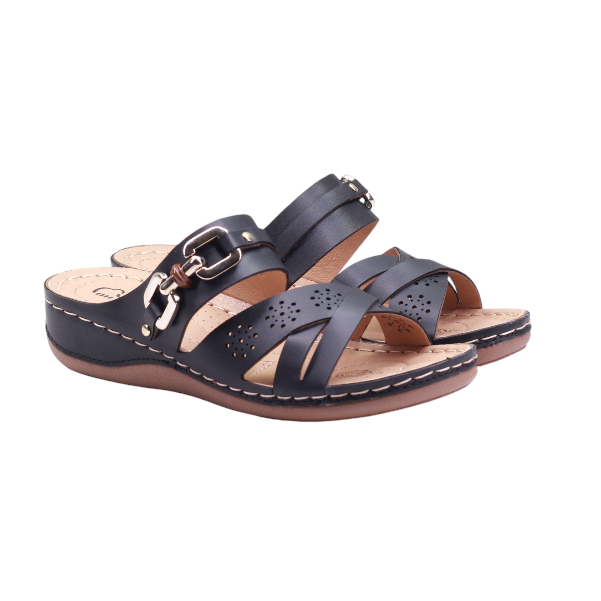 Sandalia para dama marca Nómadas en colores blanco, negro y tan. Este modelo de plataforma cuenta con una altura de 4.00 cm, lo que proporciona una elevación cómoda y segura al caminar. Además, su tira ancha con adorno metálico le da un toque femenino, perfecto para cualquier ocasión. Experimente estilo y comodidad con esta plataforma única.