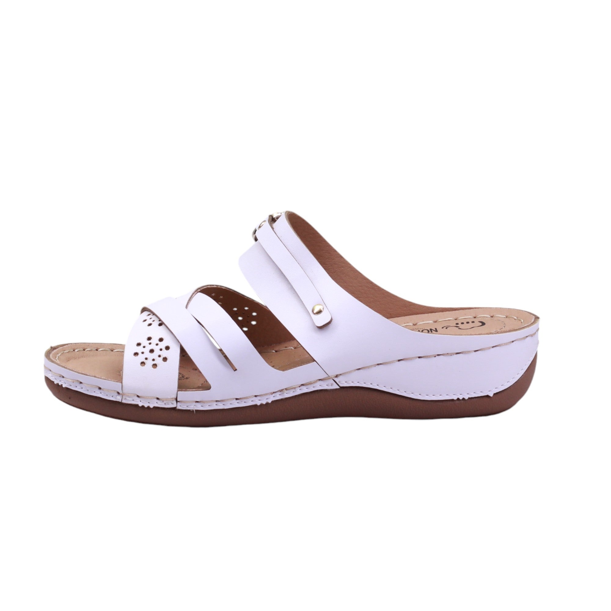 Sandalias cómodas, se ven muy bien. El color es como un beige muy sutil casi blanco, pero no es blanco.