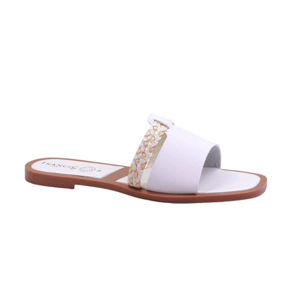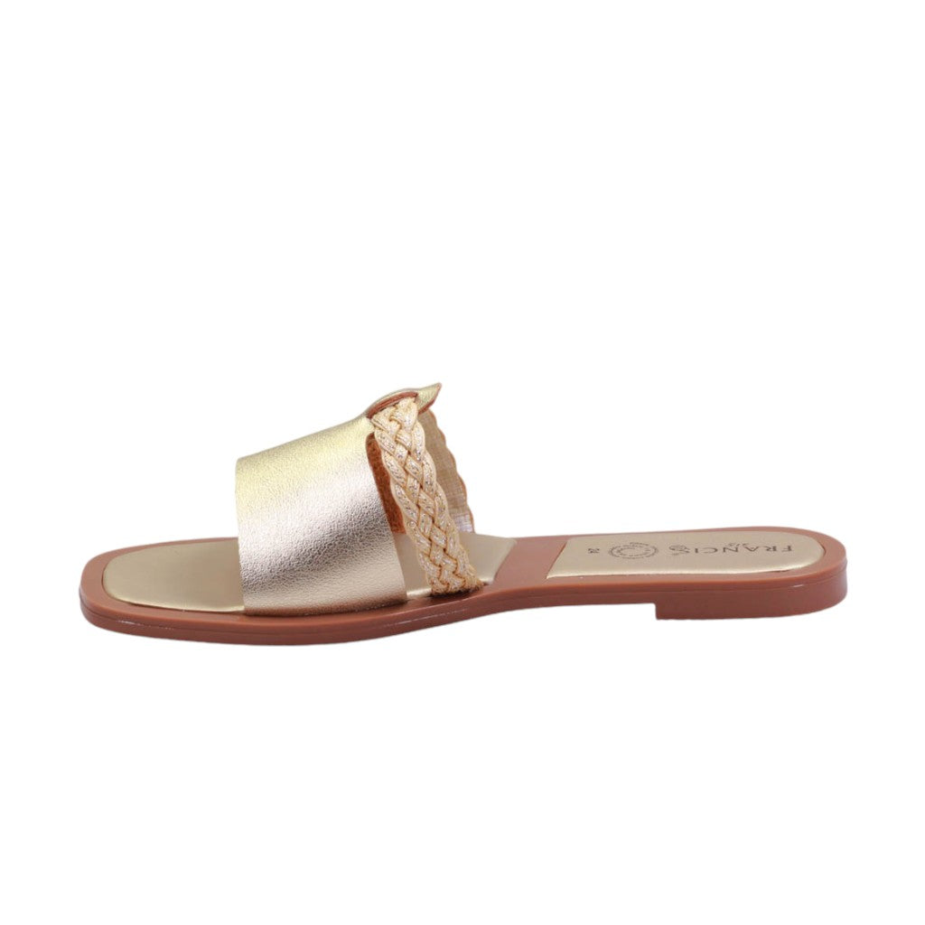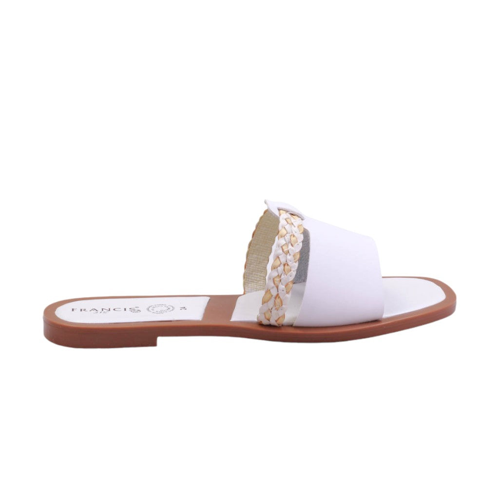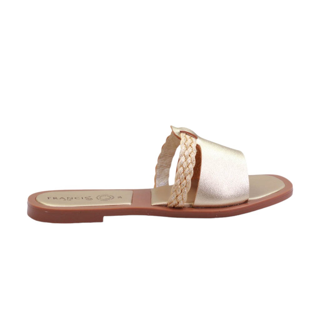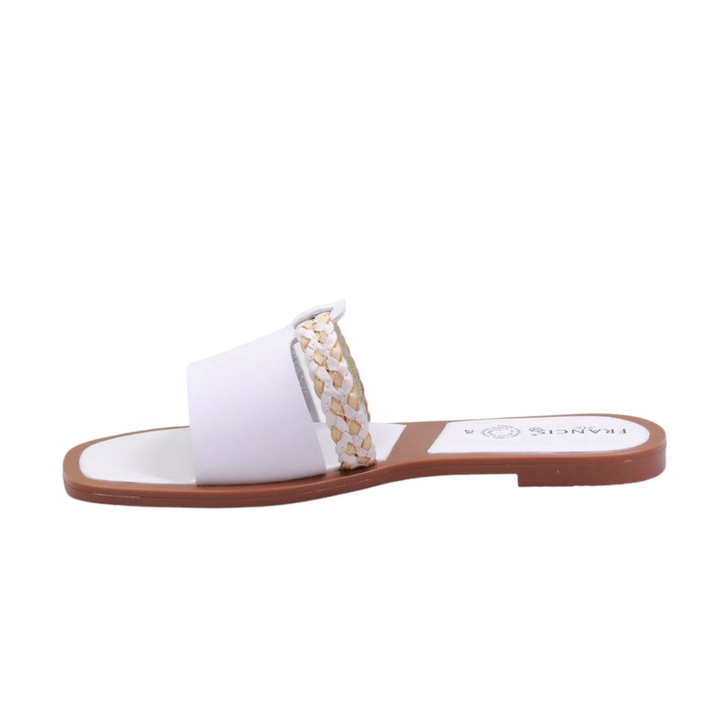 Sandalia para dama marca Francis en colores blanco, café y oro. Este modelo cuenta con un tacón bajo y tira trenzada unida al corte, lo que lo hace perfecto para un look casual en casa o en la playa. Con su diseño de dedo, brinda comodidad y estilo para cualquier ocasión.