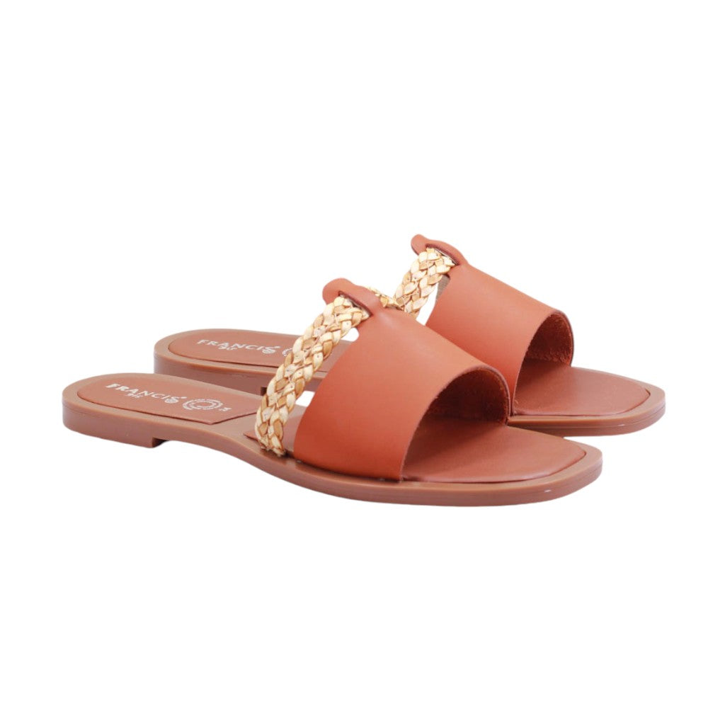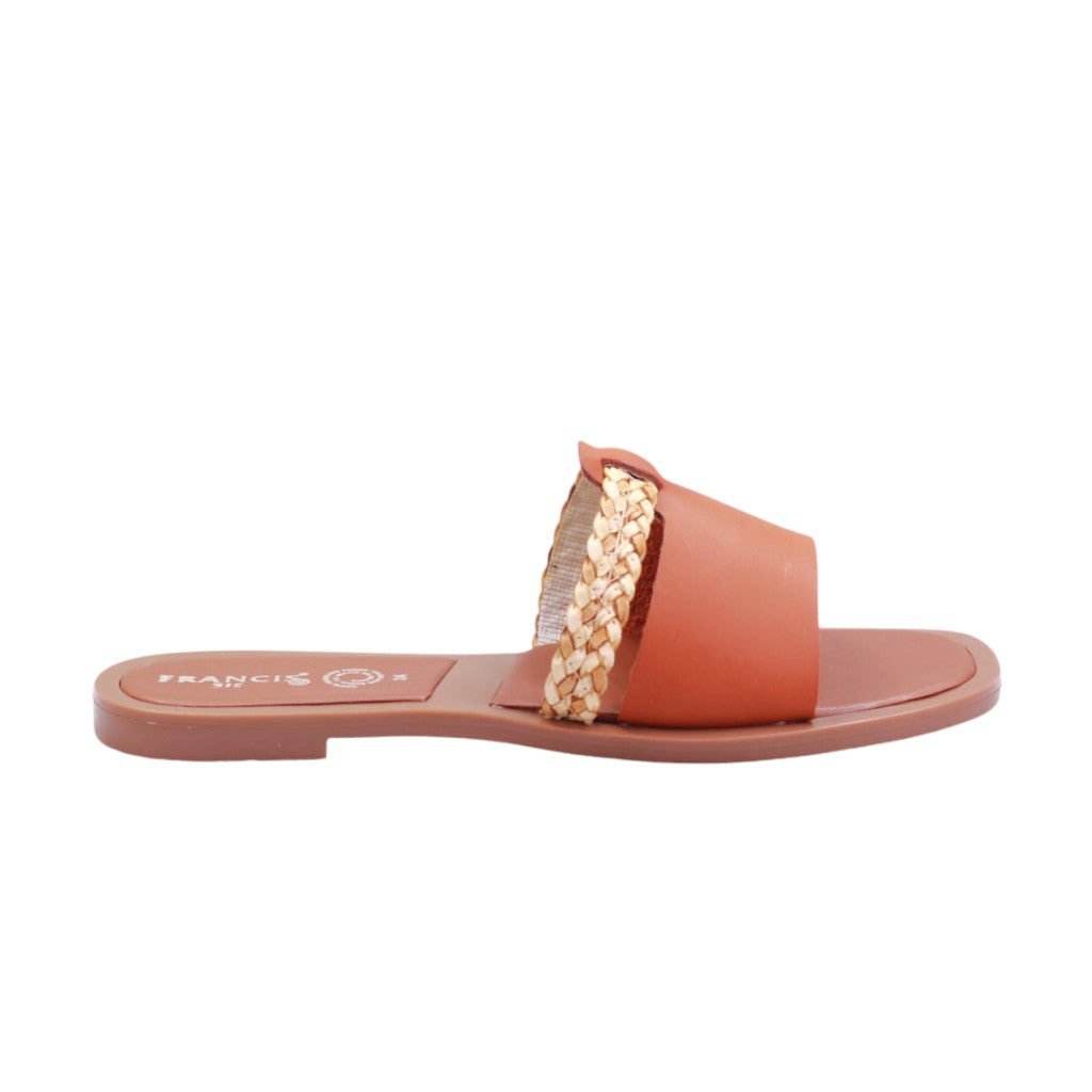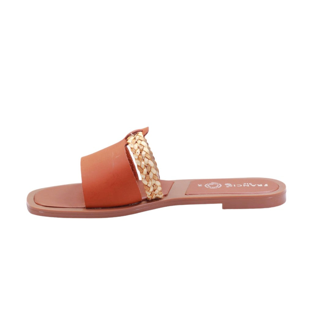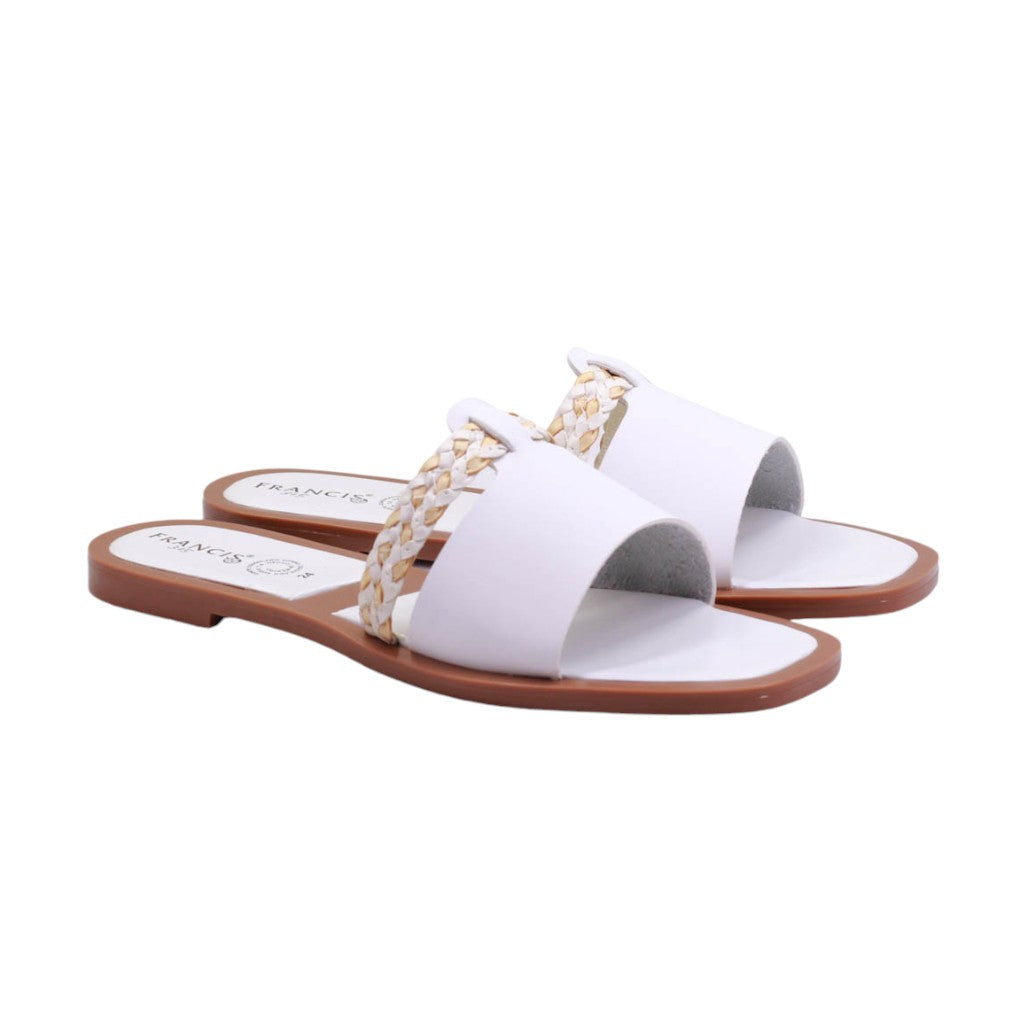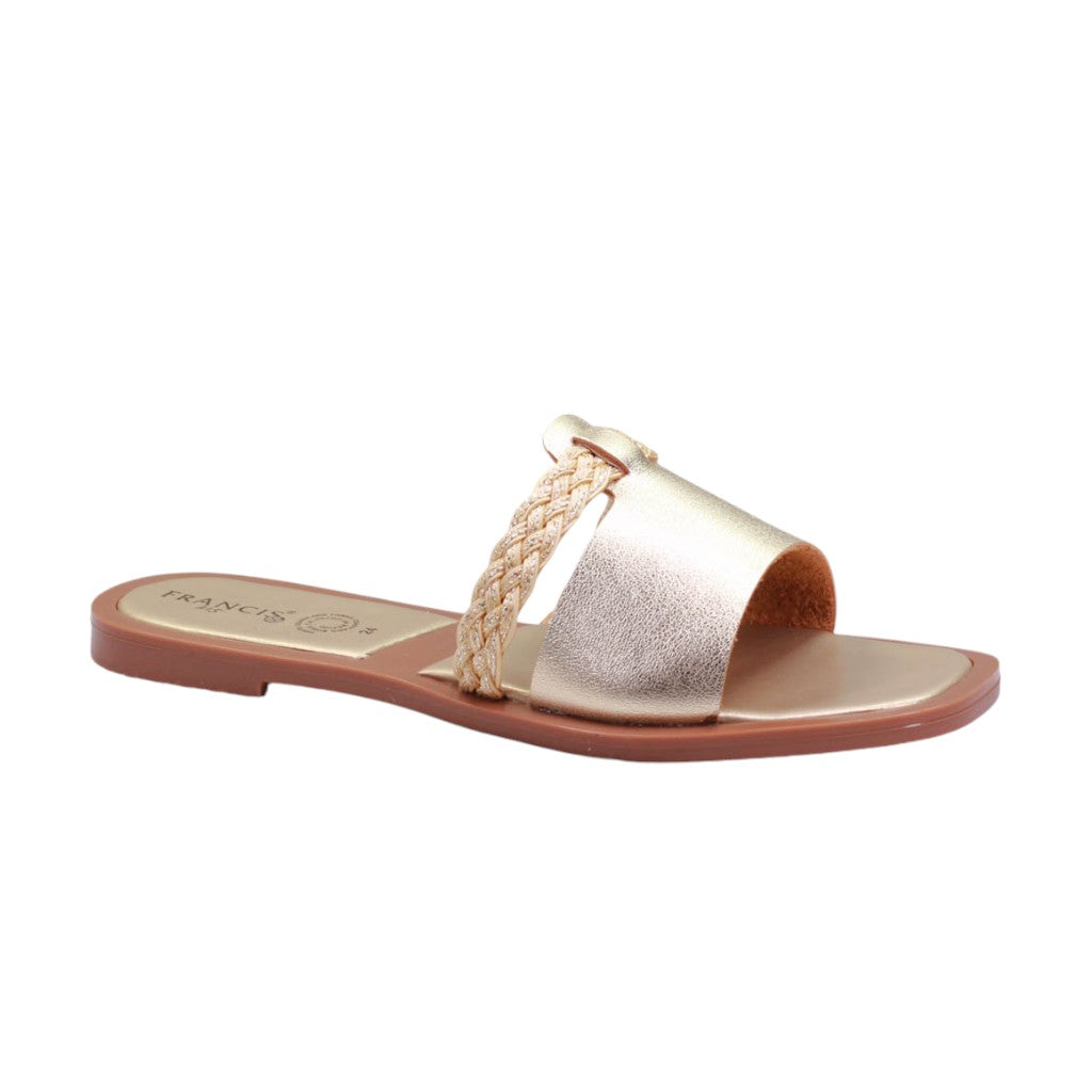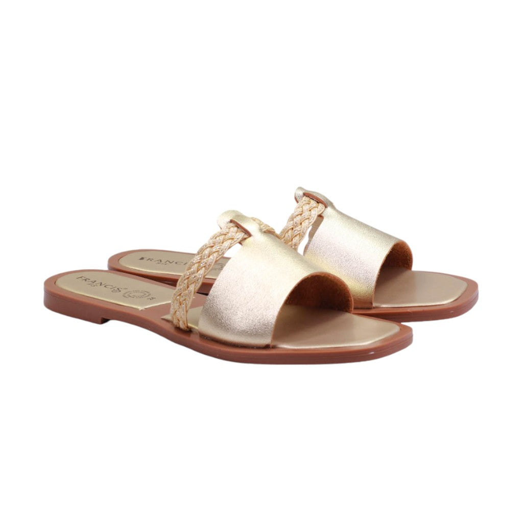 Sandalia para dama marca Francis en colores blanco, café y oro. Este modelo cuenta con un tacón bajo y tira trenzada unida al corte, lo que lo hace perfecto para un look casual en casa o en la playa. Con su diseño de dedo, brinda comodidad y estilo para cualquier ocasión.