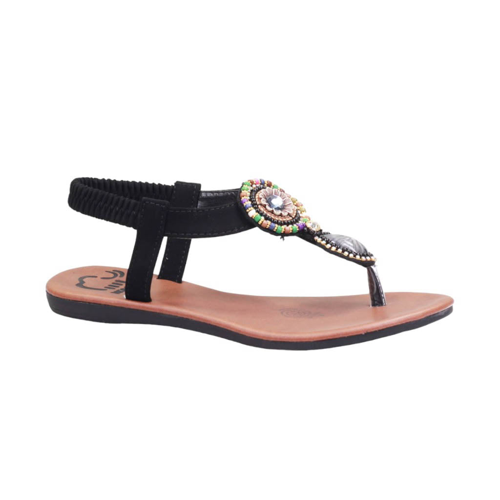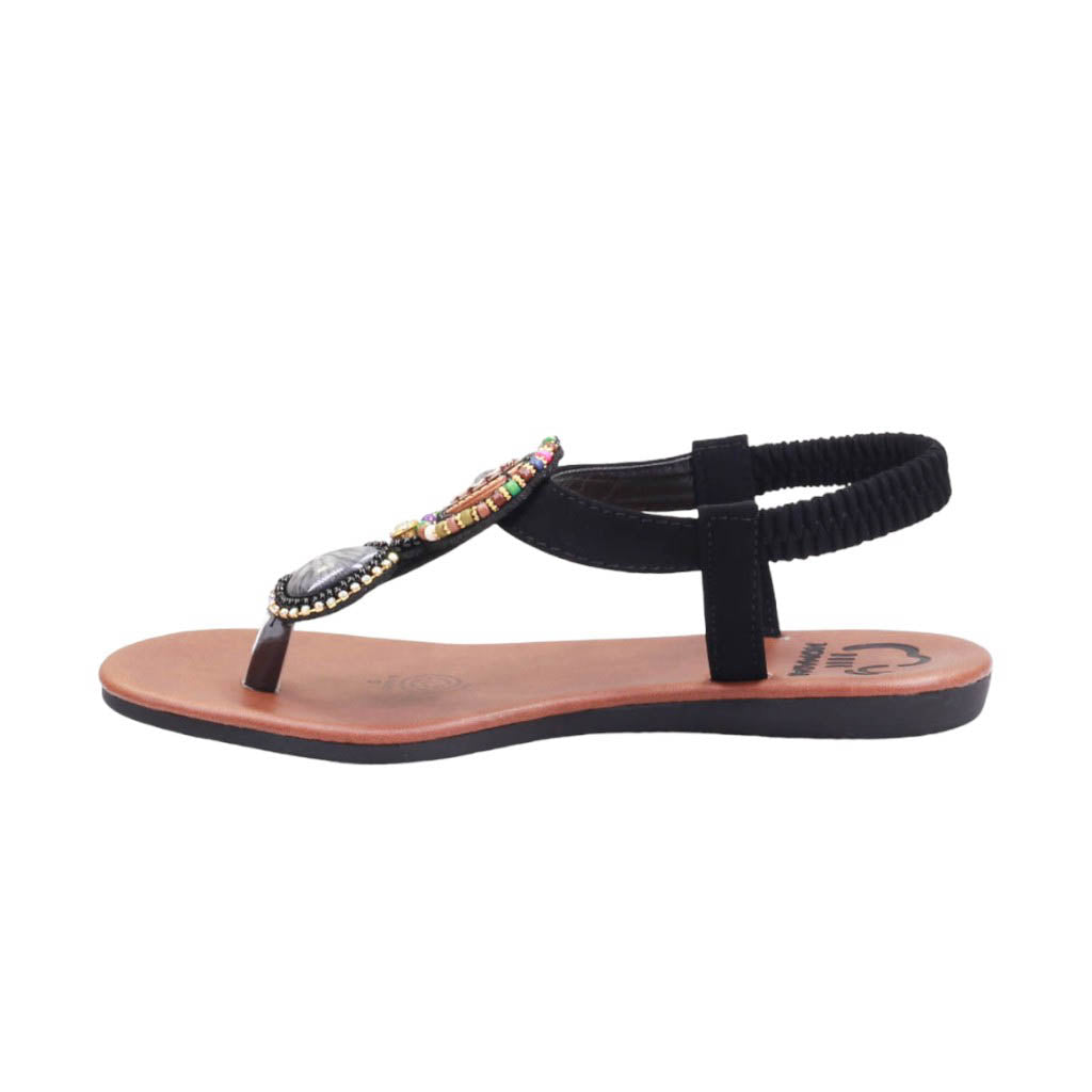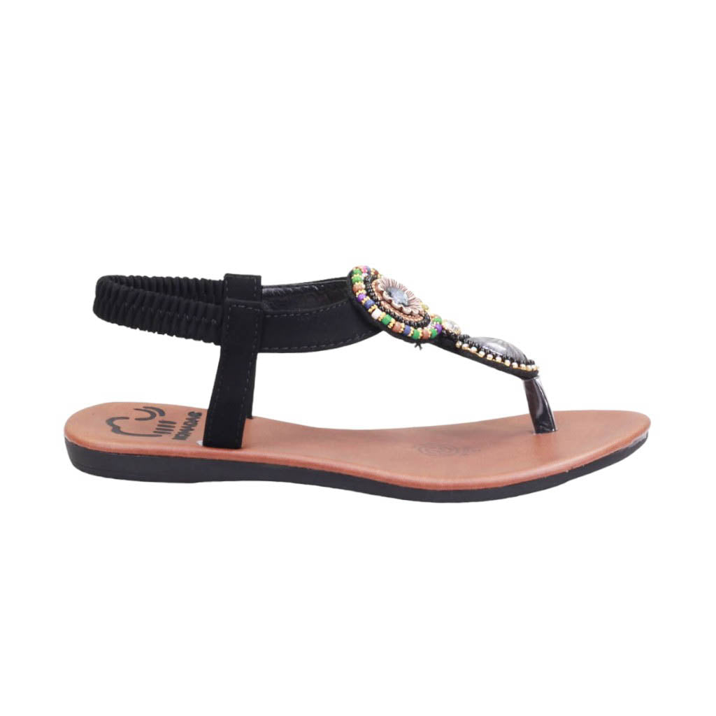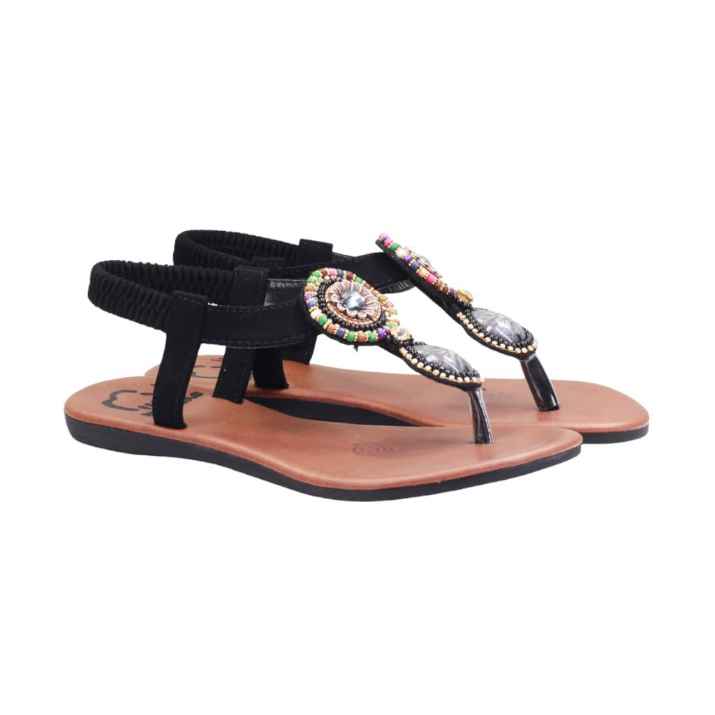 Sandalia para dama marca Nómadas en color negro. Disfruta de un estilo elegante y cómodo con nuestro bonito modelo con tira trasera elástica. Con un detalle de flor adornada con piedras de colores y una plantilla de confort, este modelo es perfecto para cualquier ocasión. Diseñado para brindar comodidad y sofisticación a tus pies.