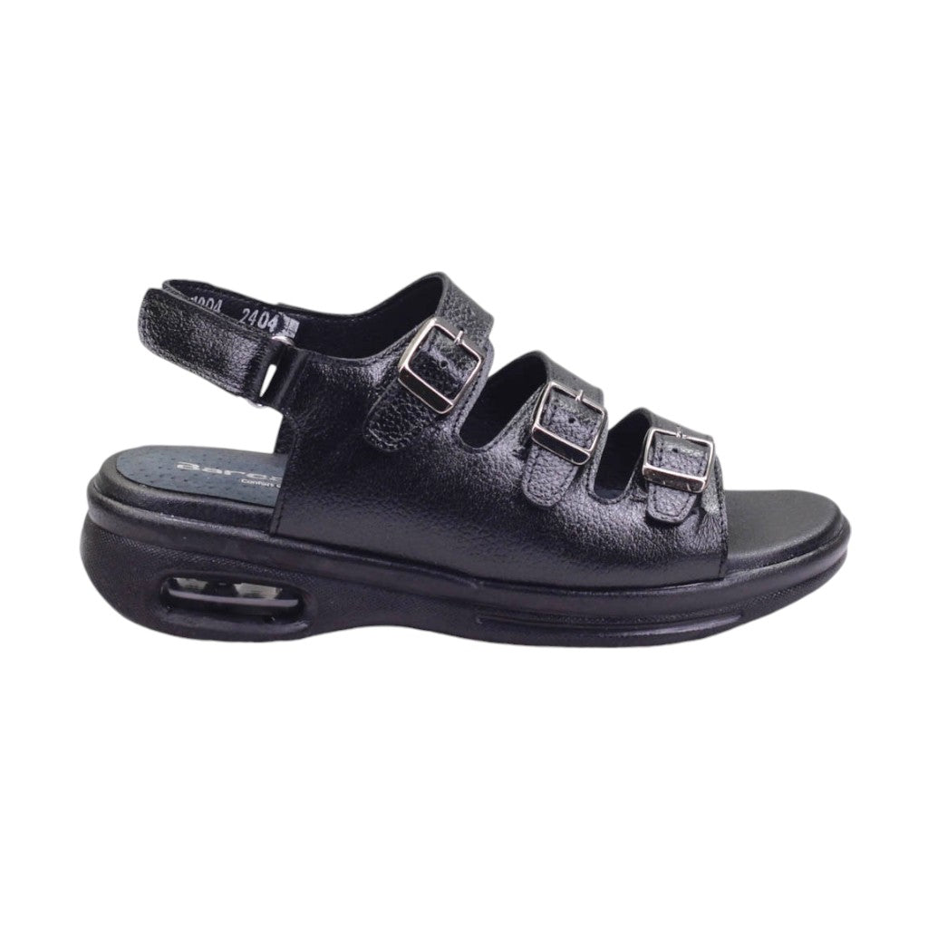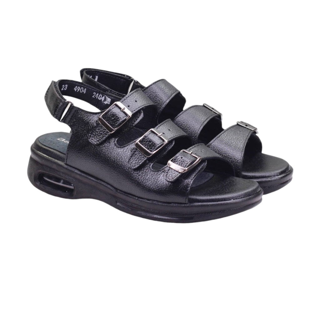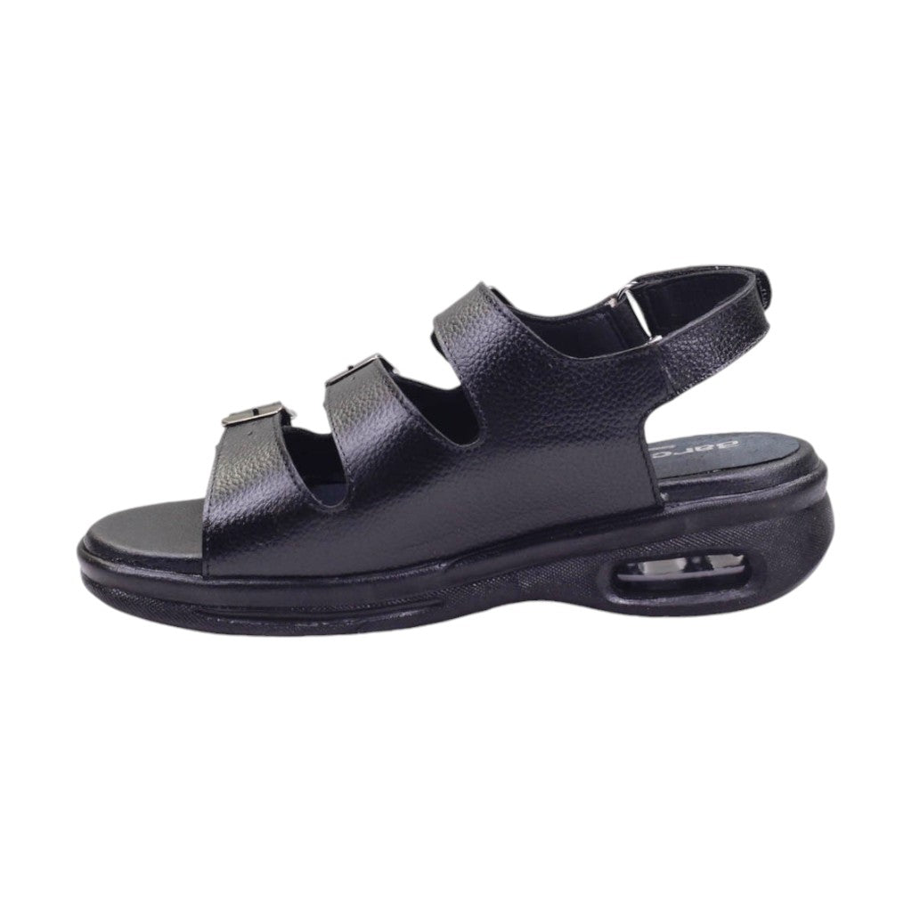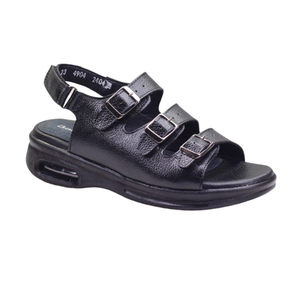 Sandalia para dama marca Barcassi en color negro. Experimenta confort y estilo con nuestro modelo de triple tira con hebilla. Con una plantilla de confort, soporte trasero y suela de 4.5 centímetros, brinda una comodidad incomparable. Además, su válvula de aire garantiza una pisada suave y amortiguada. ¡Descubre el calzado perfecto para tus caminatas diarias!