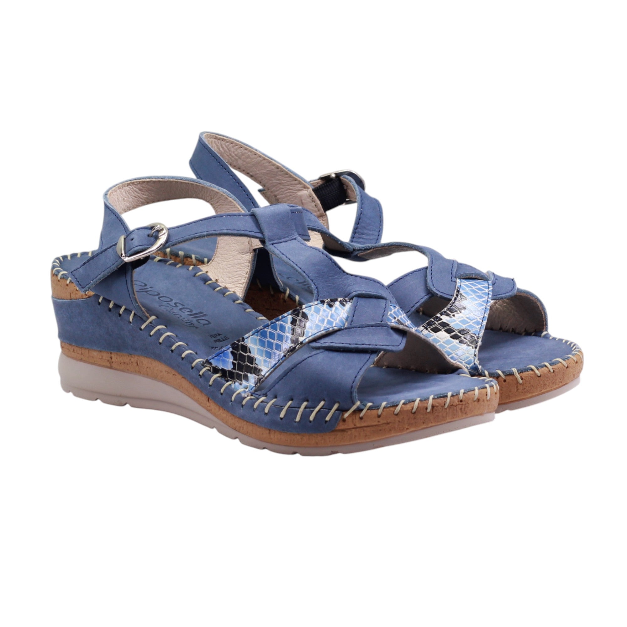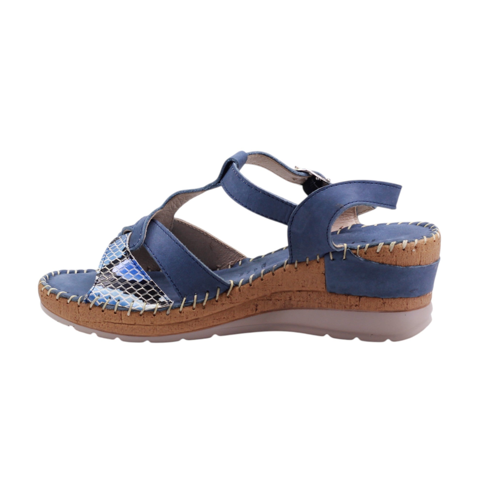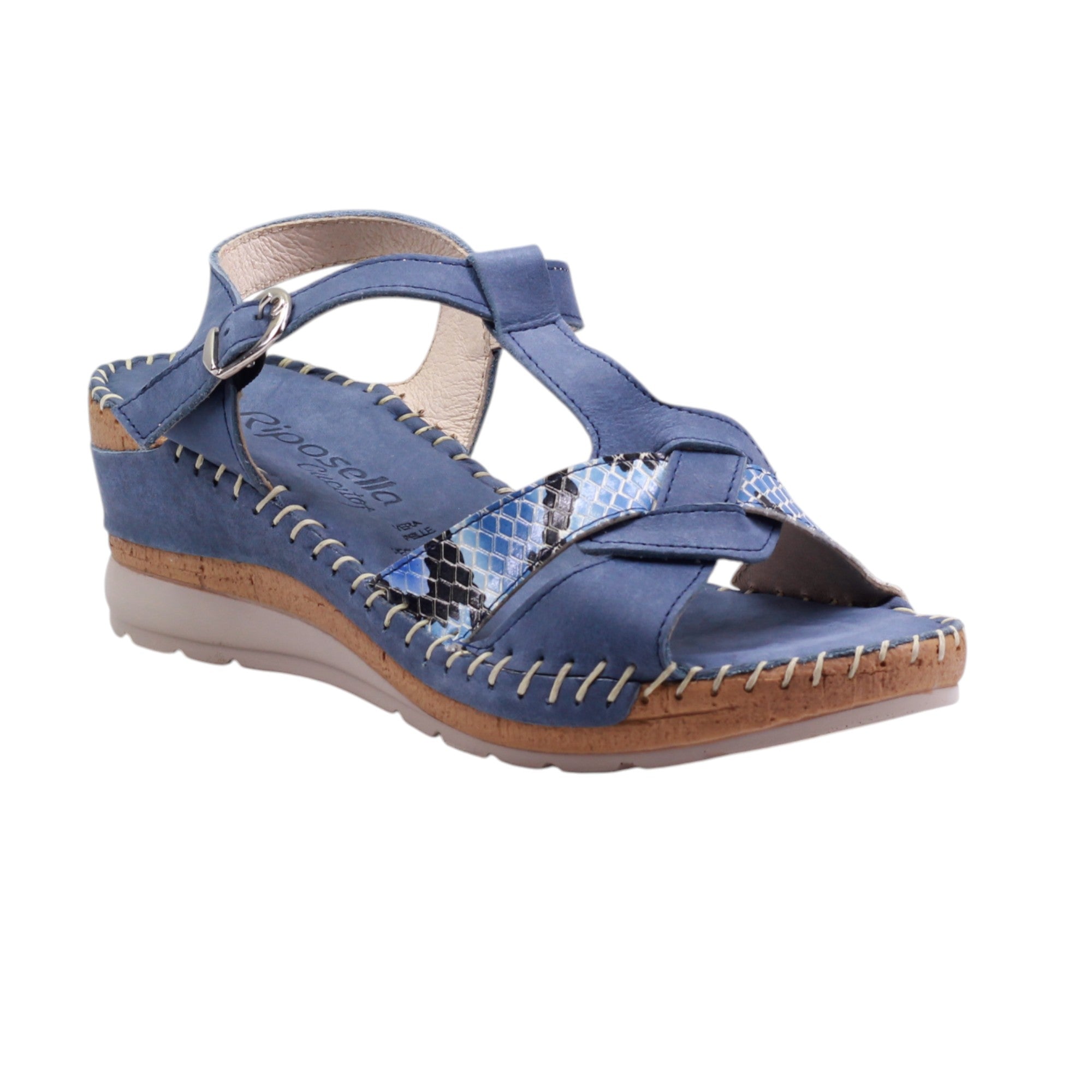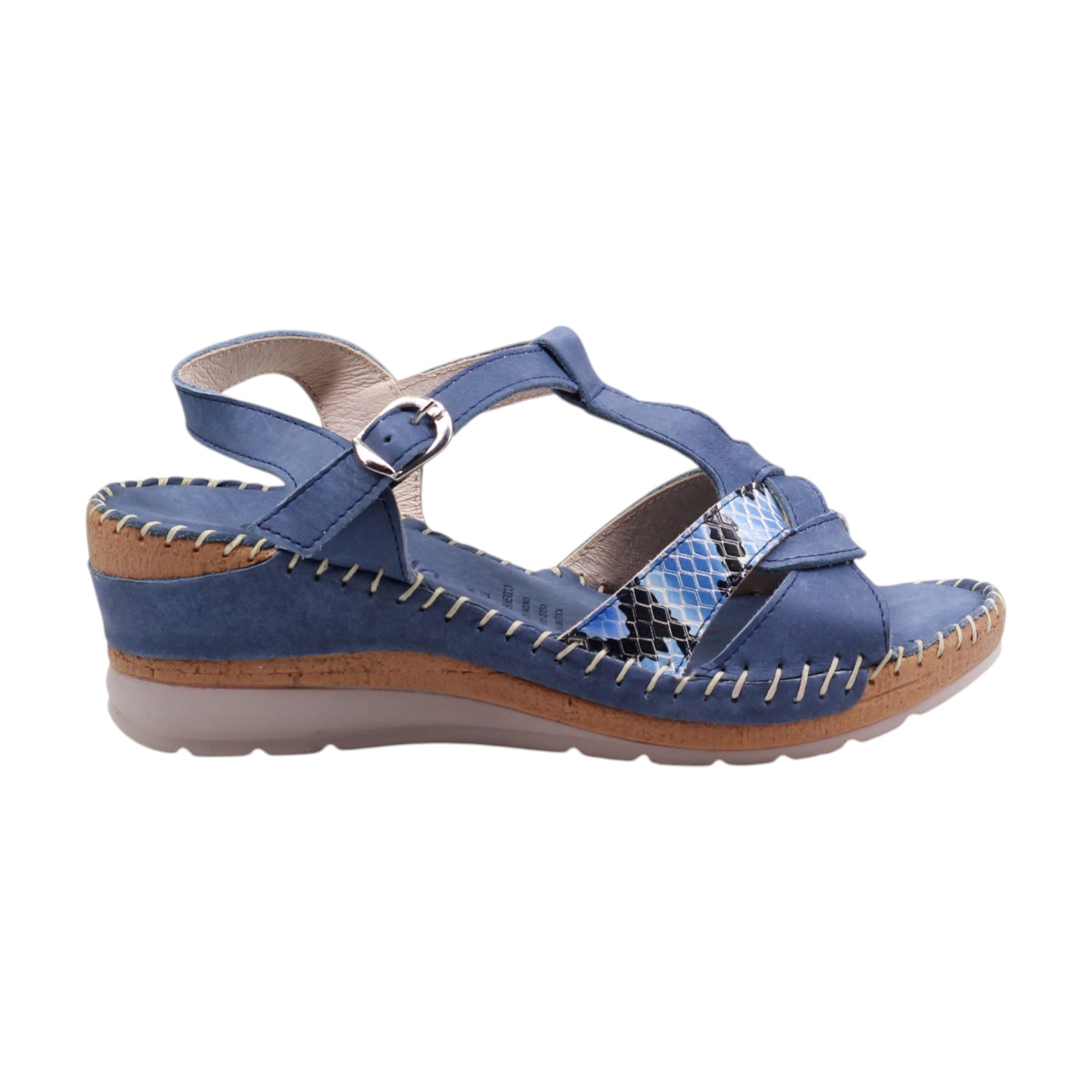 El frente está compuesto por tiras cruzadas en combinación de materiales: una en piel lisa azul y otra en acabado tipo serpiente con tonos azul, blanco y negro. Este contraste de texturas y colores aporta dinamismo visual y un toque moderno al diseño. El ajuste se realiza mediante una tira al tobillo con hebilla metálica, que permite un calce seguro y estilizado.