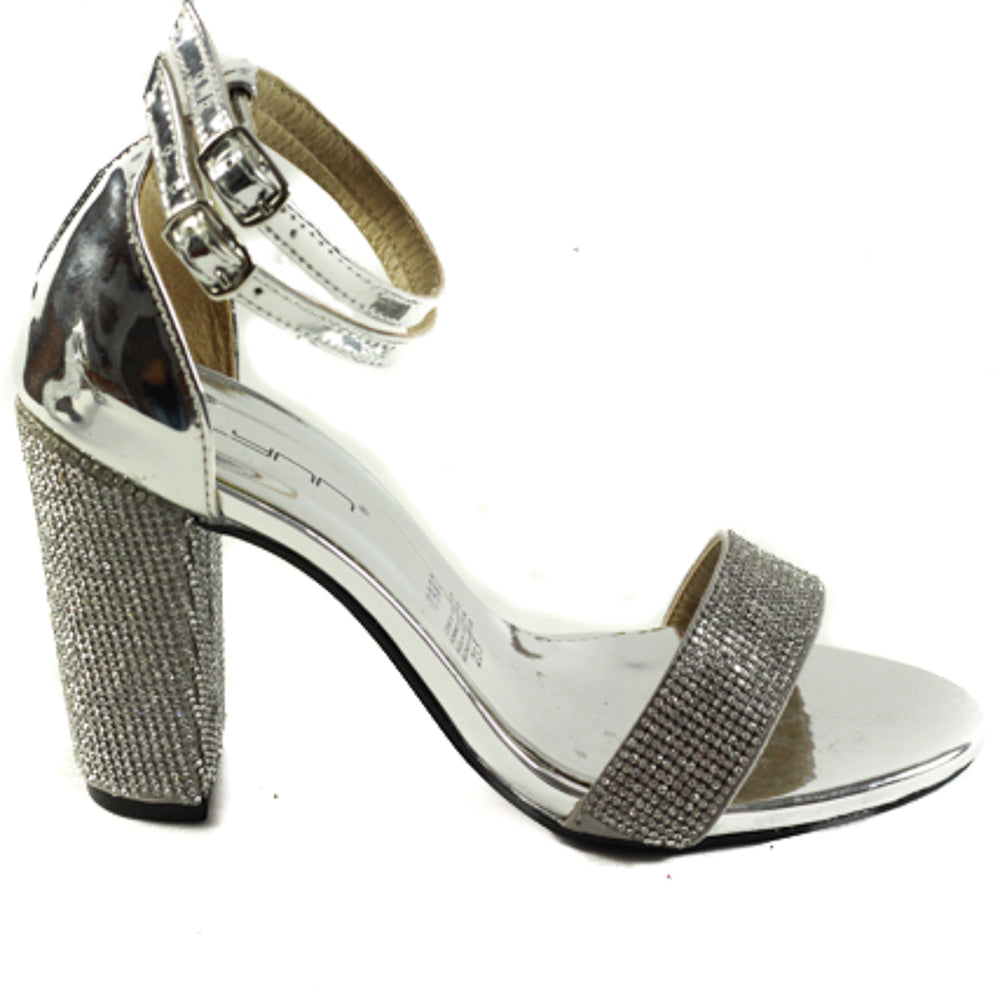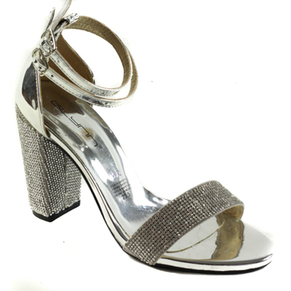 Zapatilla para dama marca Glynn en color plata, Tiene un diseño con tira adornada de pedrería al igual que el tacón, lo cual, hace este modelo lucidor y listo para toda ocasión, sus tiras delgadas del tobillo y su terminado en tono metálico le dan un toque extra para estar en tendencia esta temporada.