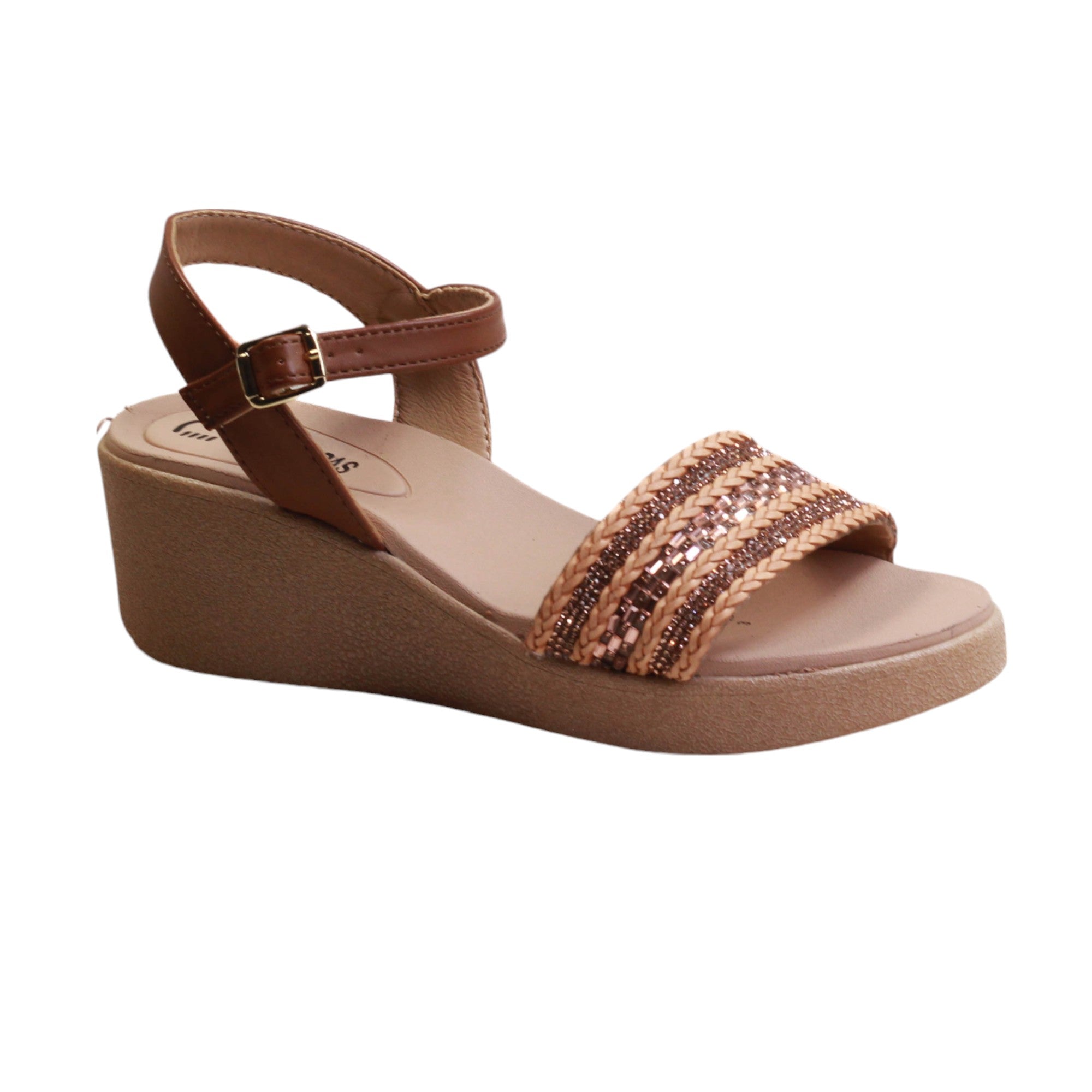Sandalia para dama de plataforma y tiras entrelazadas con pedrería