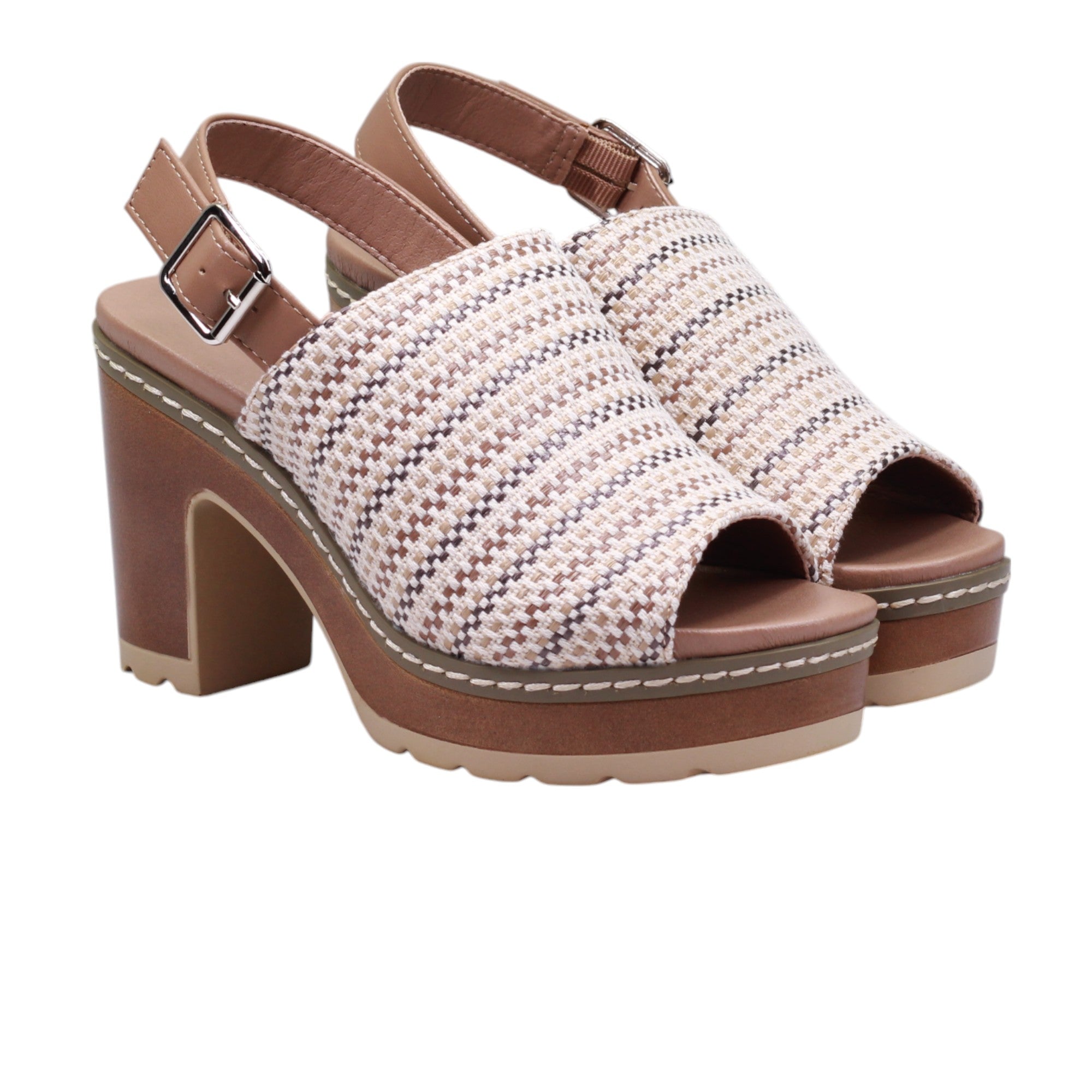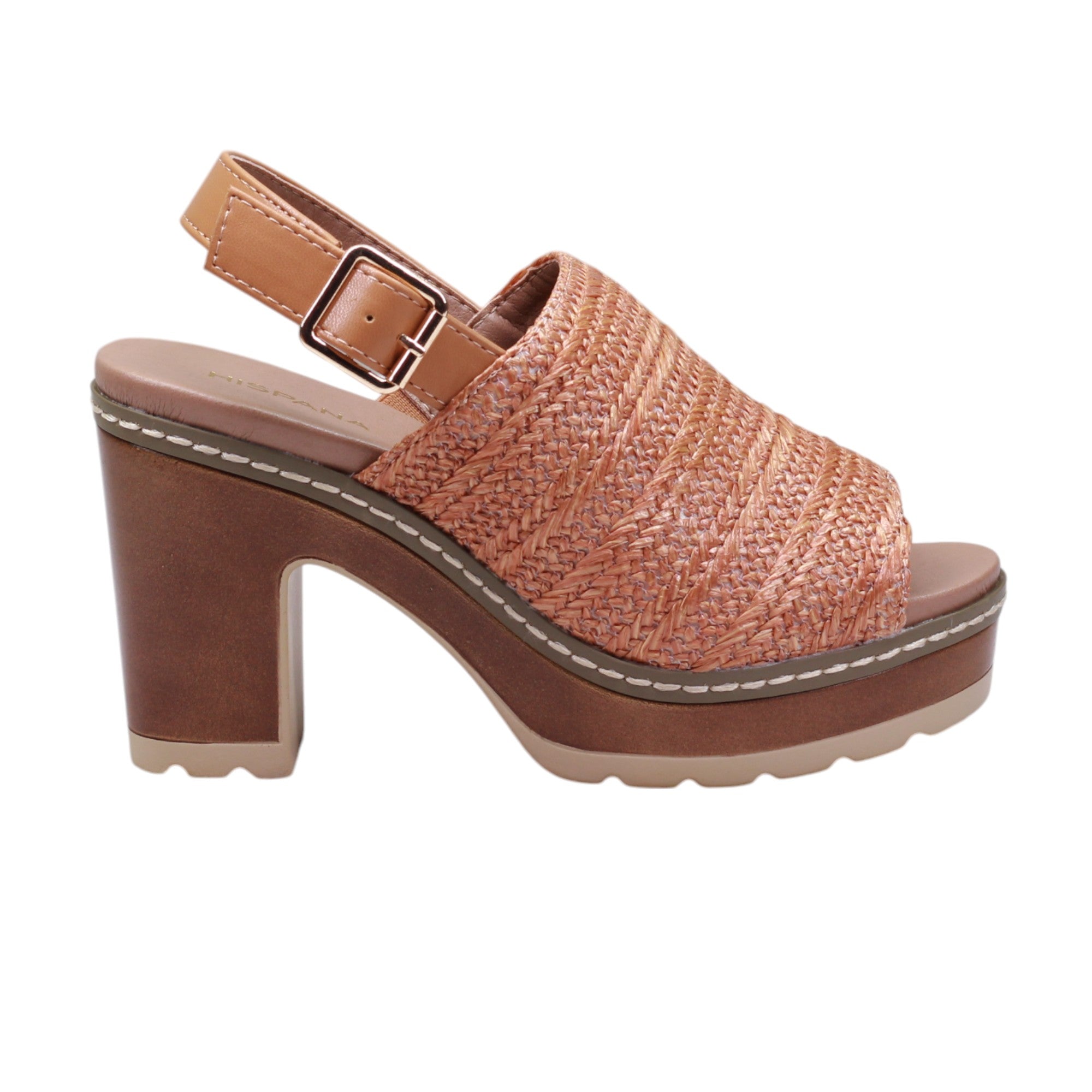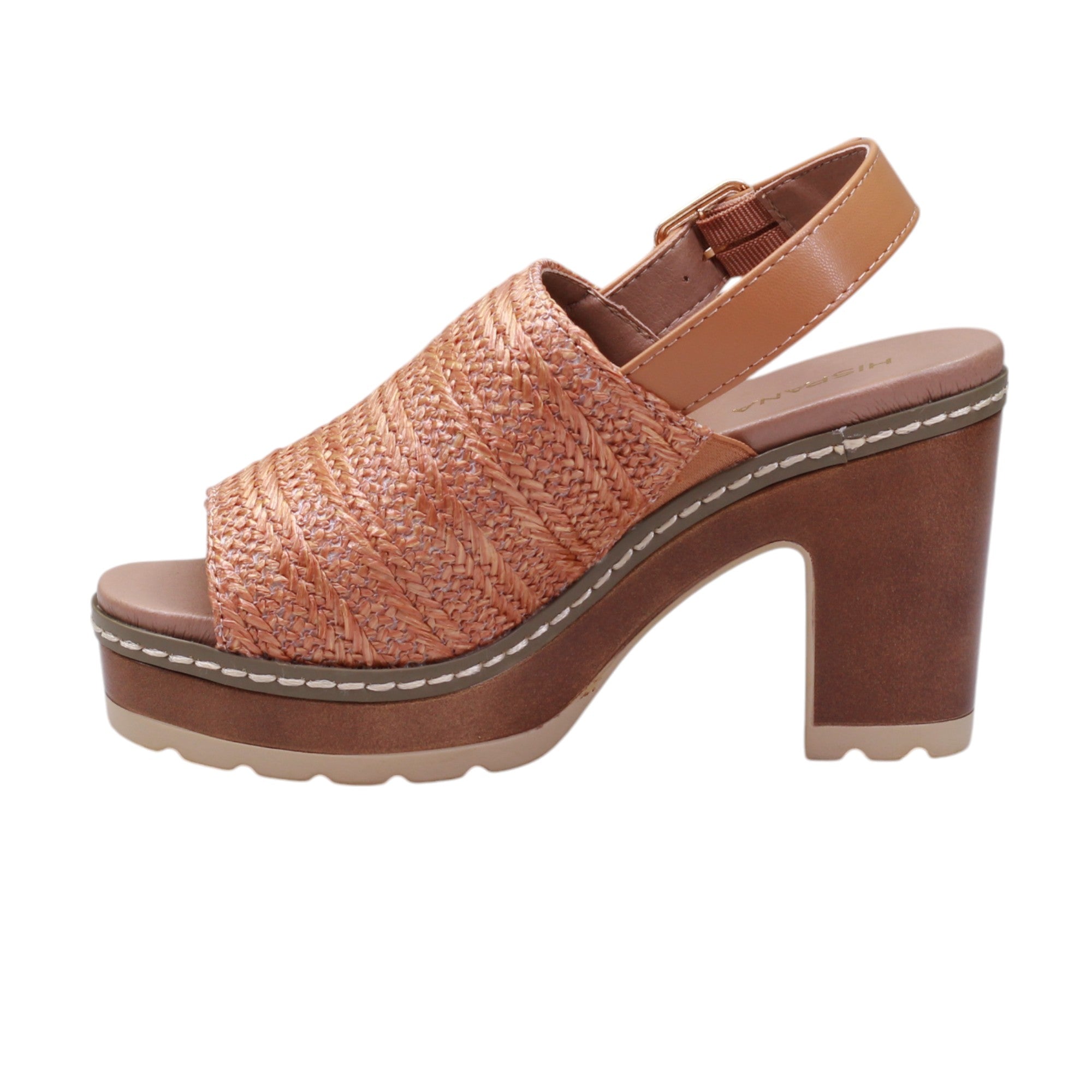 Calzado para dama marca Hispana en colores camel y café. Descubre el modelo con ajuste trasero con hebilla, tacón ancho de 8.5 cm y plataforma de 3.00 cm. Versátil y cómodo, perfecto para tus salidas casuales.