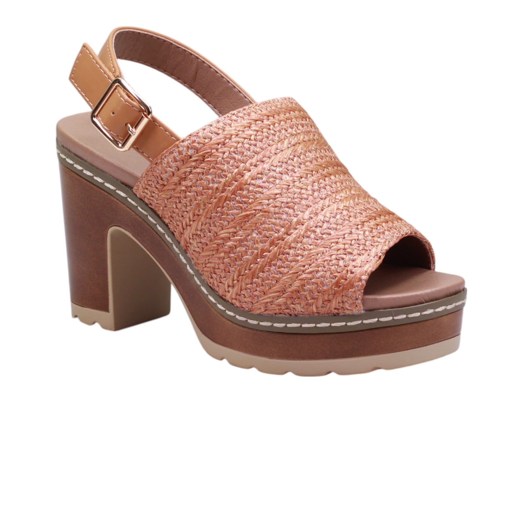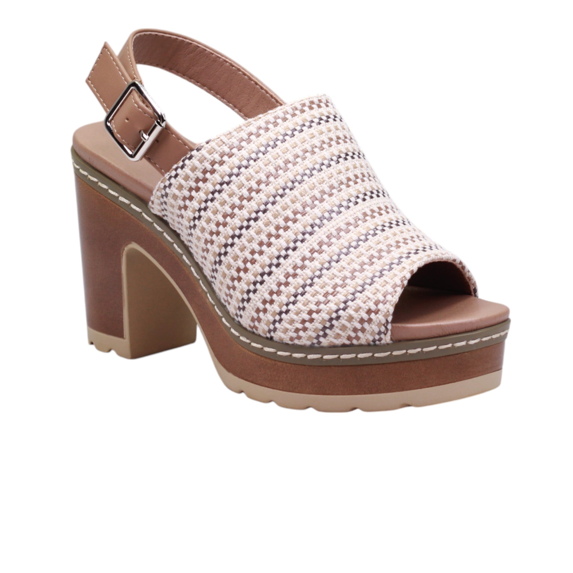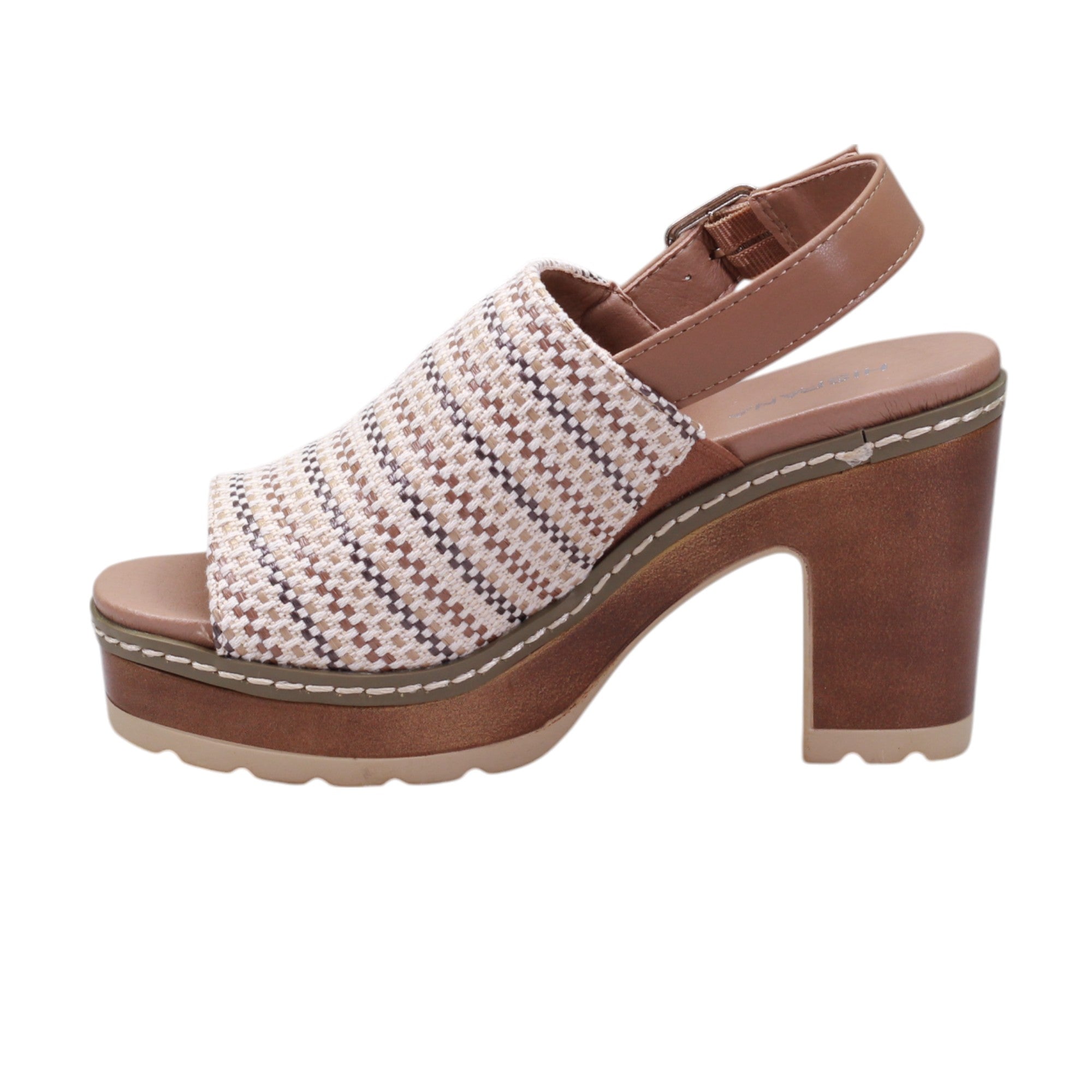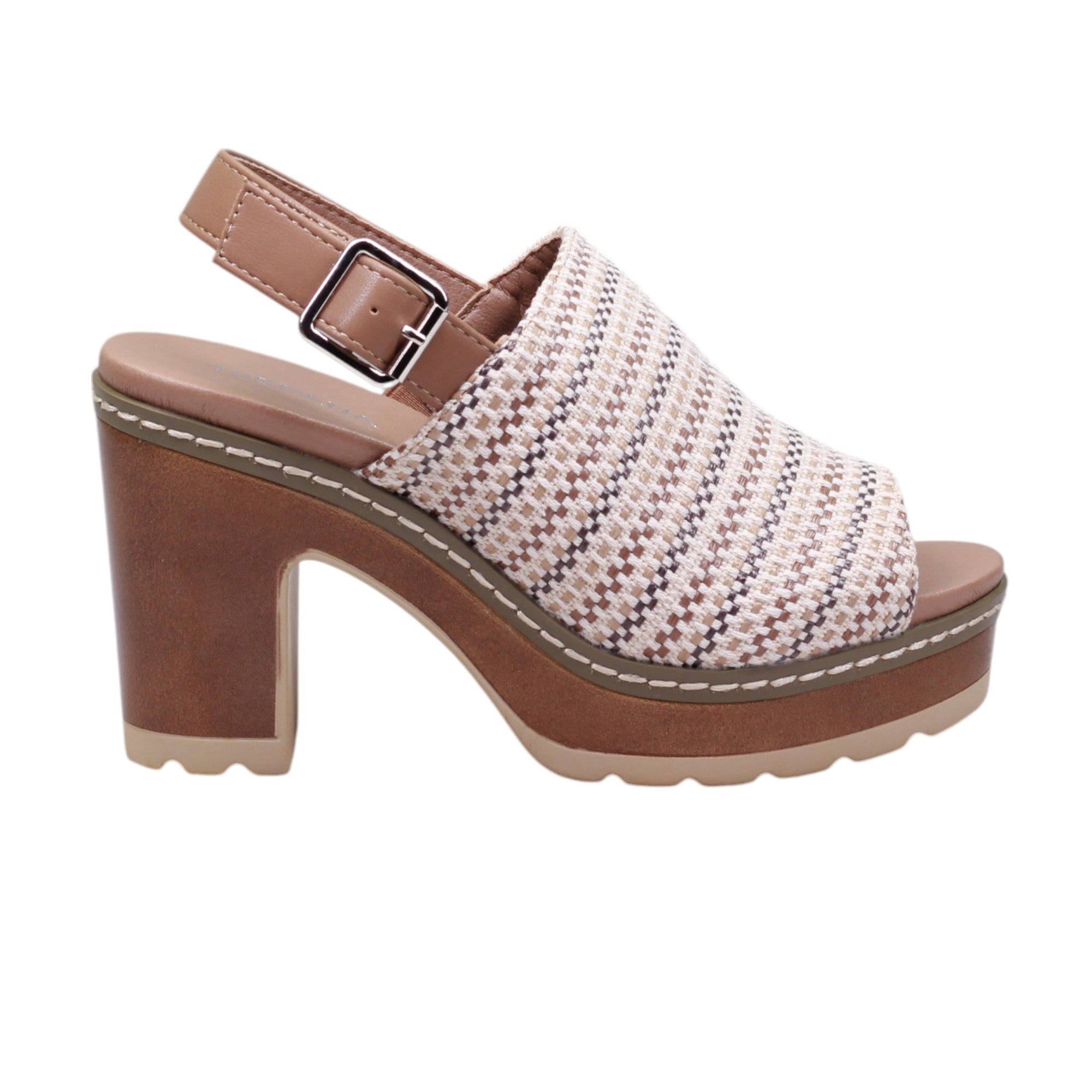 Calzado para dama marca Hispana en colores camel y café. Descubre el modelo con ajuste trasero con hebilla, tacón ancho de 8.5 cm y plataforma de 3.00 cm. Versátil y cómodo, perfecto para tus salidas casuales.