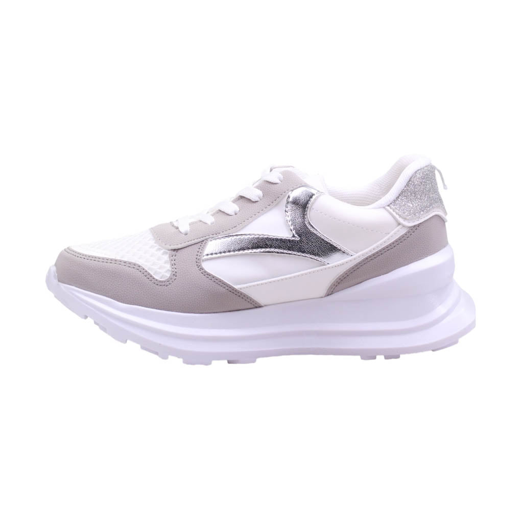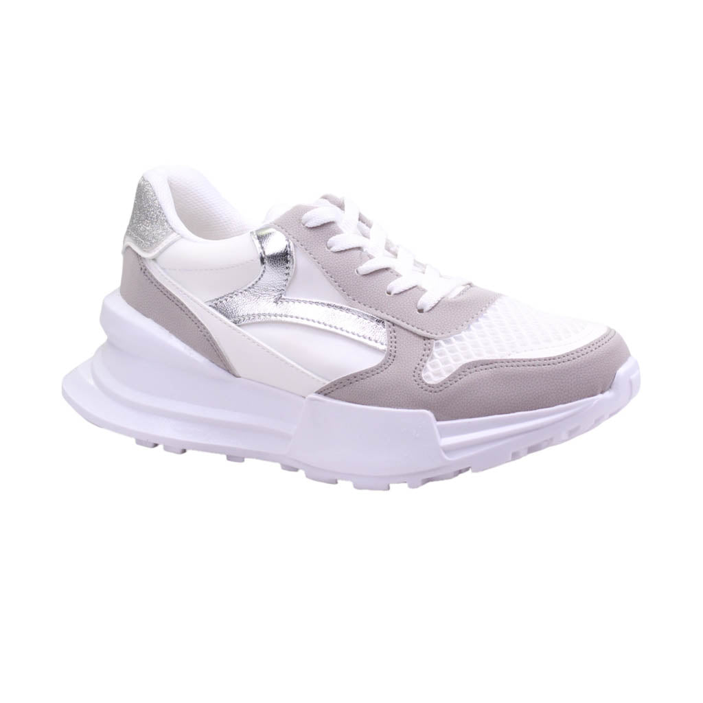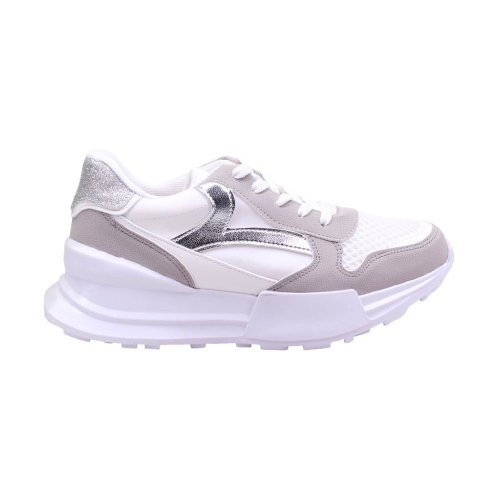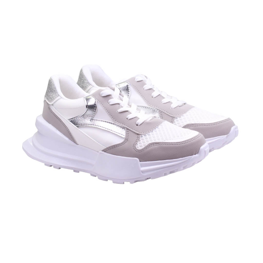 Tenis para dama marca Trending Shoes en colores blanco y gris. Este modelo casual es perfecto para cualquier ocasión, su atractivo diseño te llevará a cualquier lugar con estilo. Con una plataforma de 5.5 cm de altura, ofrece un ajuste en agujetas y una plantilla acojinada para mayor comodidad. ¡Caminar nunca había sido tan cómodo y elegante al mismo tiempo!