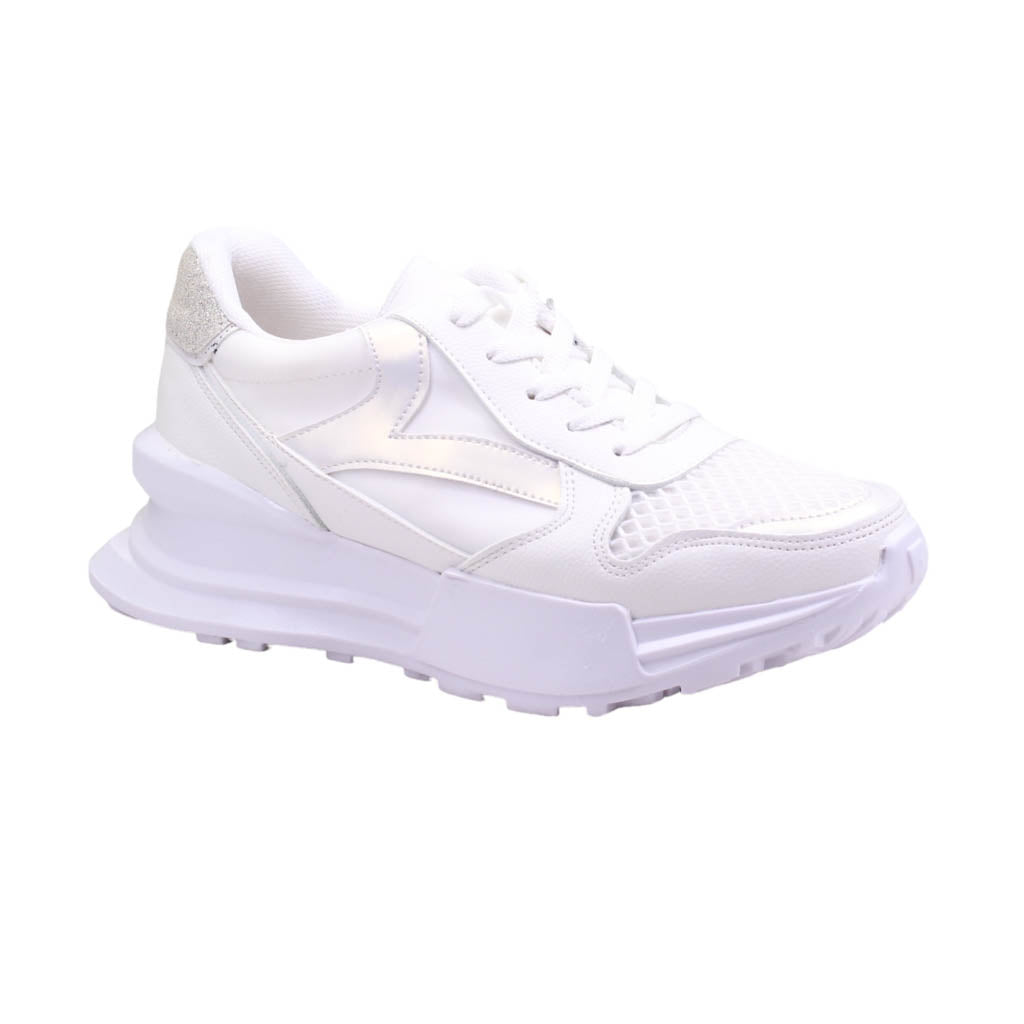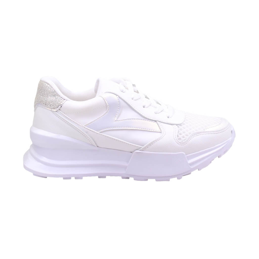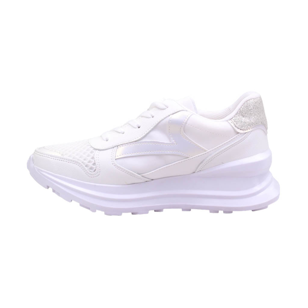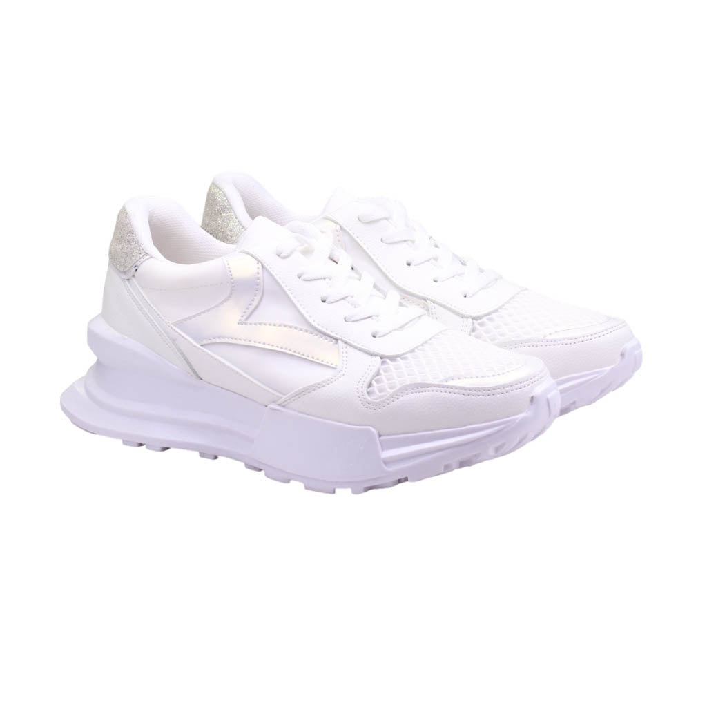 Tenis para dama marca Trending Shoes en colores blanco y gris. Este modelo casual es perfecto para cualquier ocasión, su atractivo diseño te llevará a cualquier lugar con estilo. Con una plataforma de 5.5 cm de altura, ofrece un ajuste en agujetas y una plantilla acojinada para mayor comodidad. ¡Caminar nunca había sido tan cómodo y elegante al mismo tiempo!