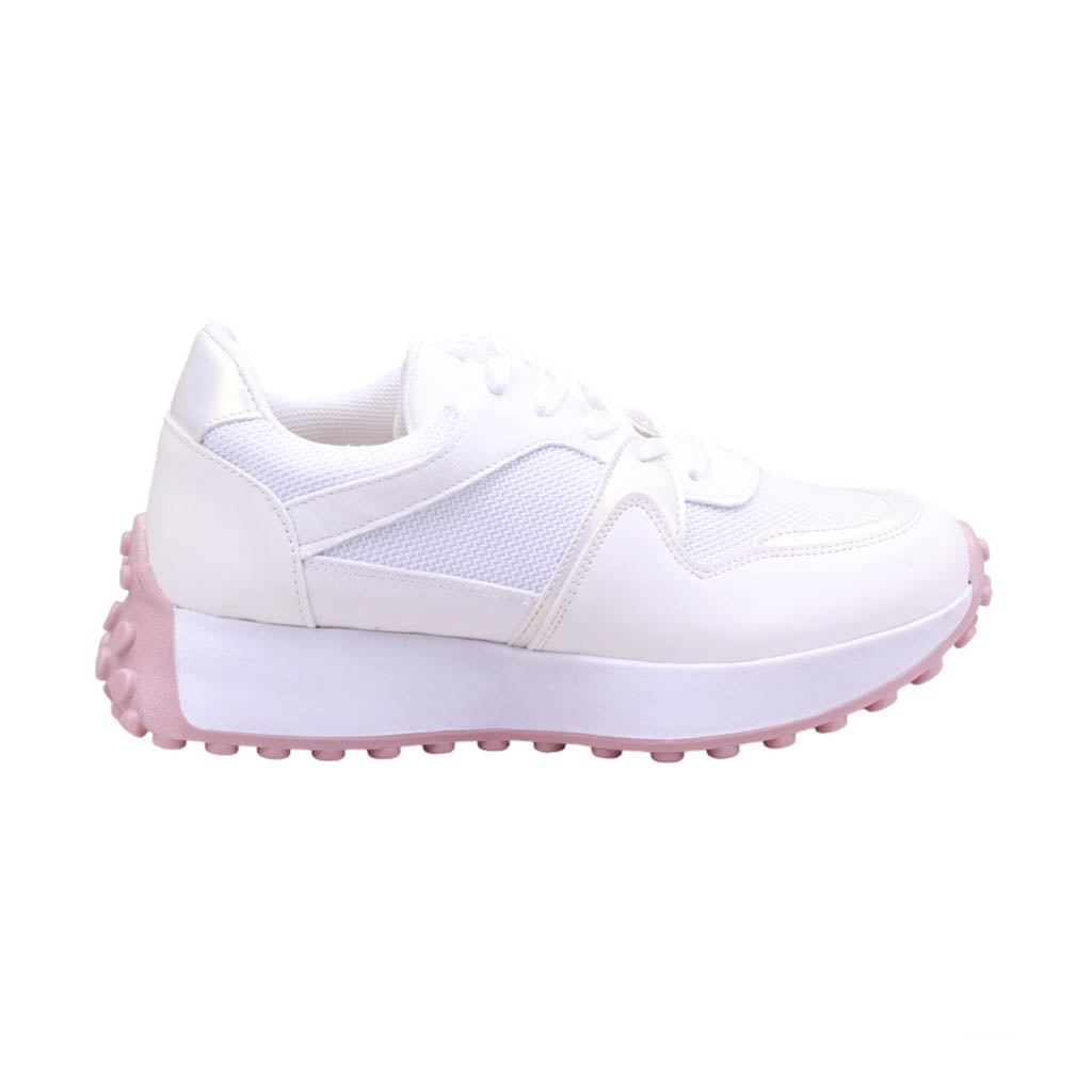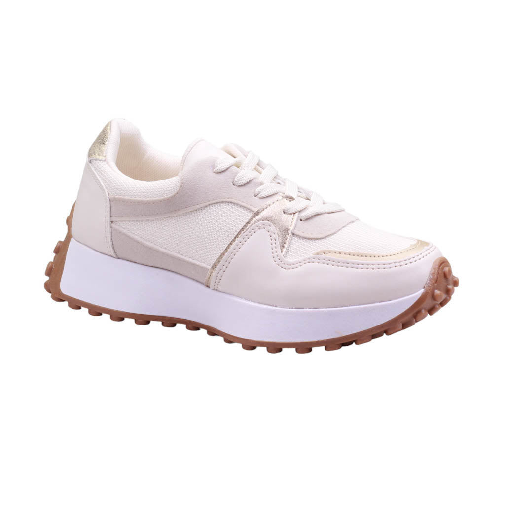 Tenis para dama marca Trending Shoes en colores blanco, late y negro. Este modelo de plataforma cuenta con una altura de 4.00 cm y está diseñado con ajuste en agujetas para brindar soporte extra al caminar. Además, cuenta con malla en el corte que permite una mejor ventilación del pie y una plantilla acojinada que garantiza comodidad durante todo el día.