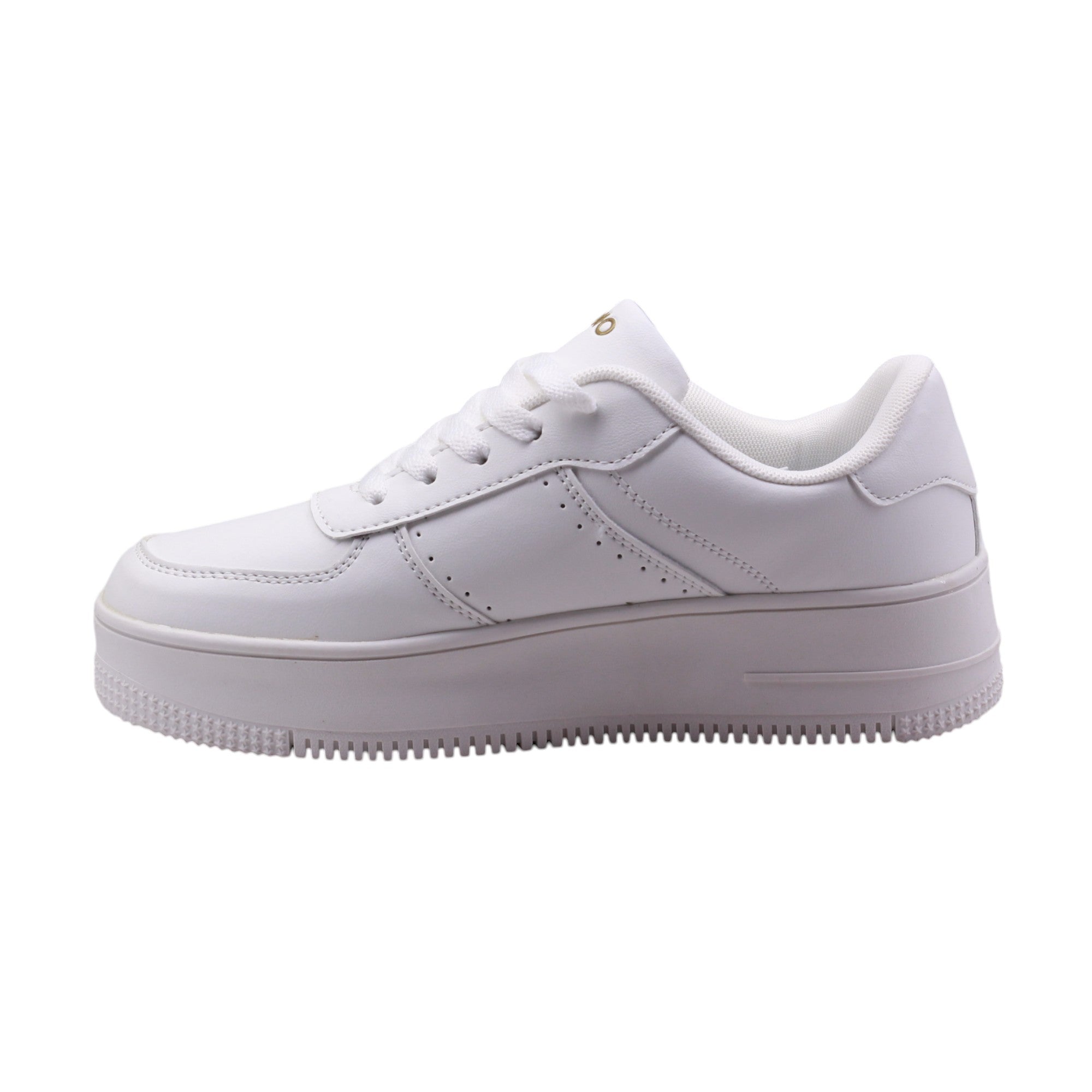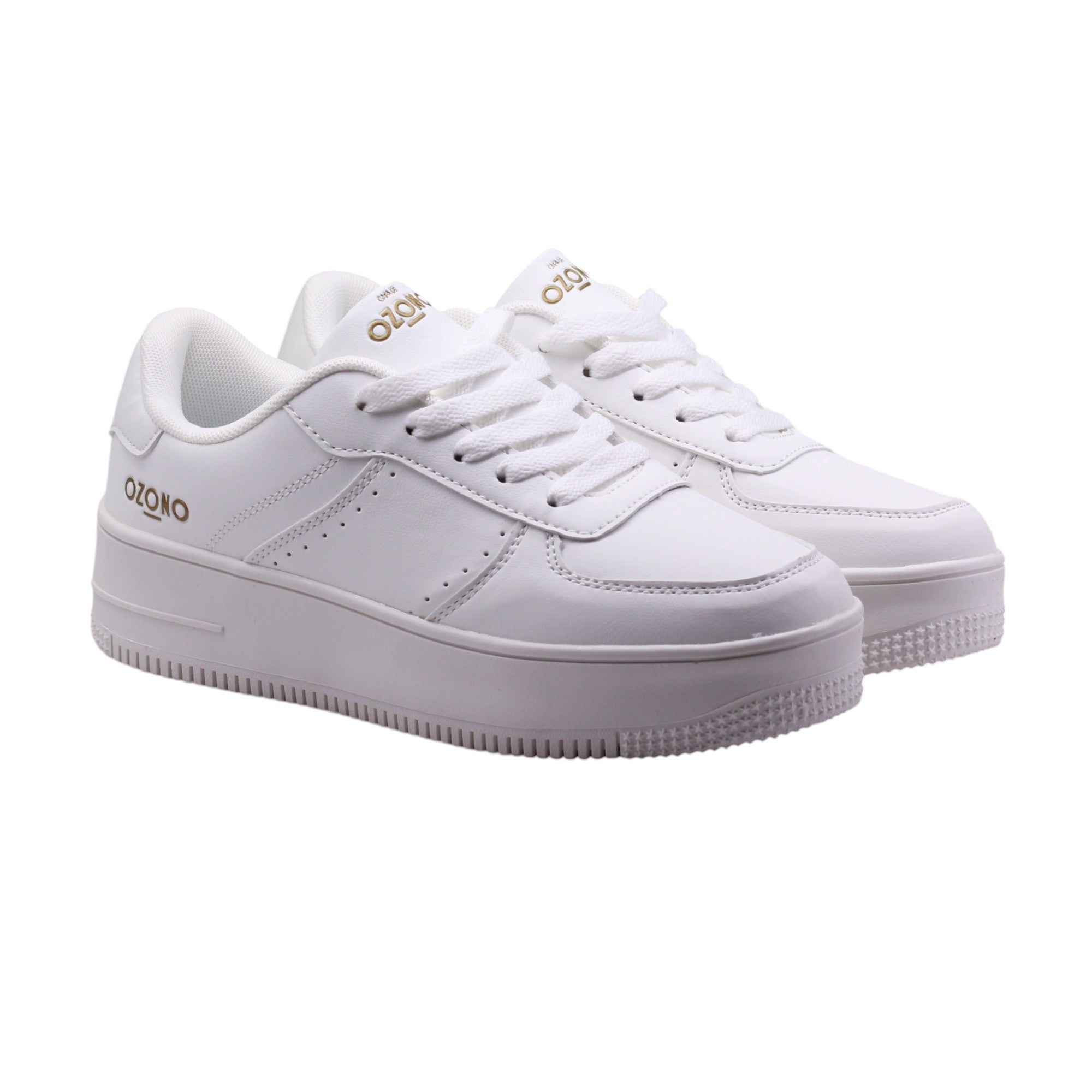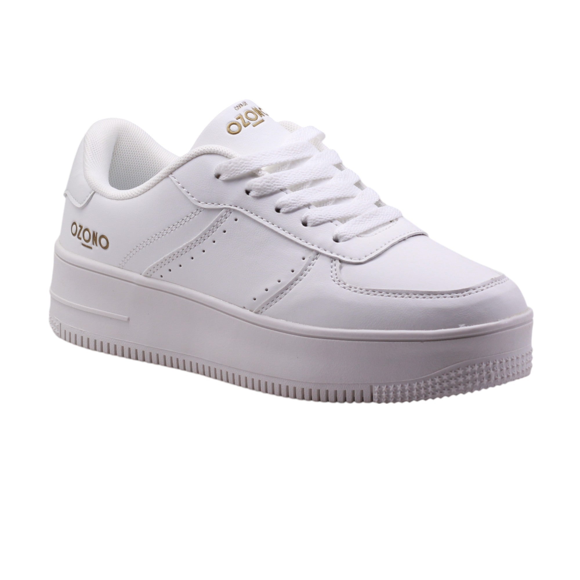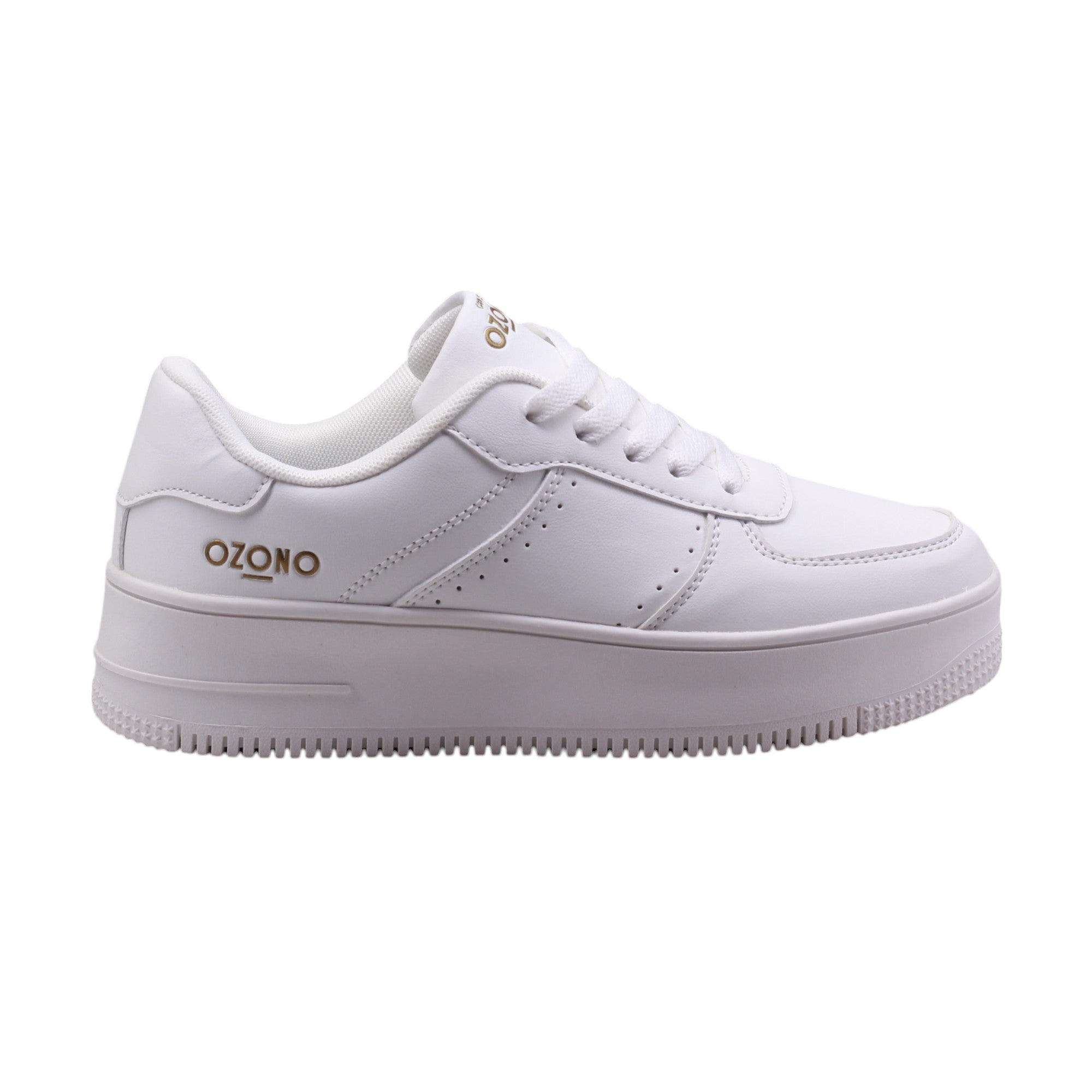Tenis para dama marca Ozono en color blanco. Este modelo cuenta con una suela corrida de 4.5 cm de altura que proporciona un mayor soporte y comodidad al caminar. Su ajuste en agujetas permite un perfecto ajuste al pie, mientras que su plantilla de confort y su interior amplio ofrecen una sensación de suavidad y espacio adicional para los dedos.