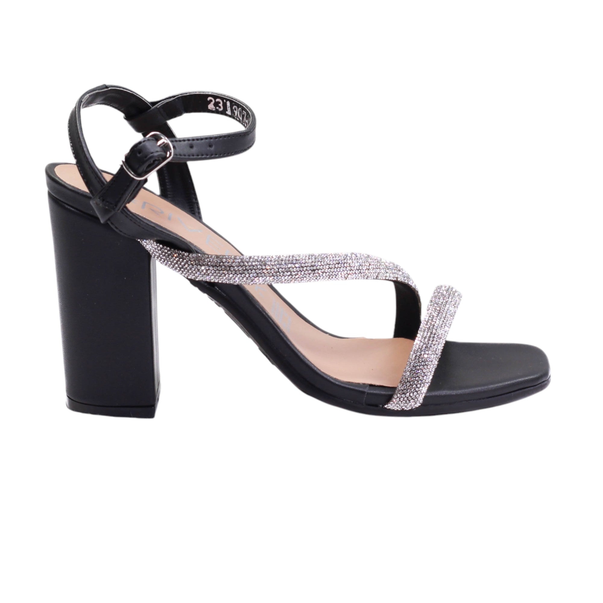 Zapatilla para dama con tacón alto y doble tira de pedrería, ajuste al talón