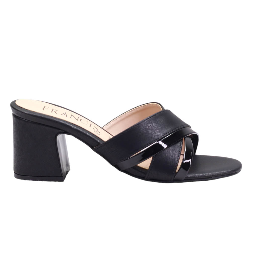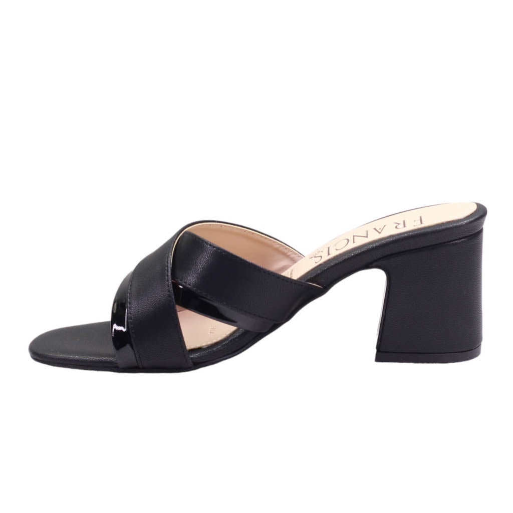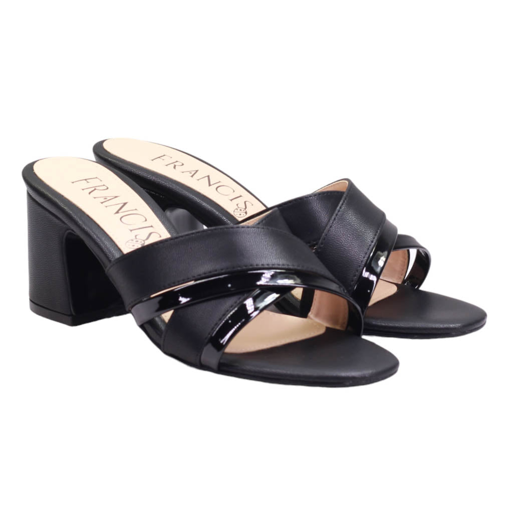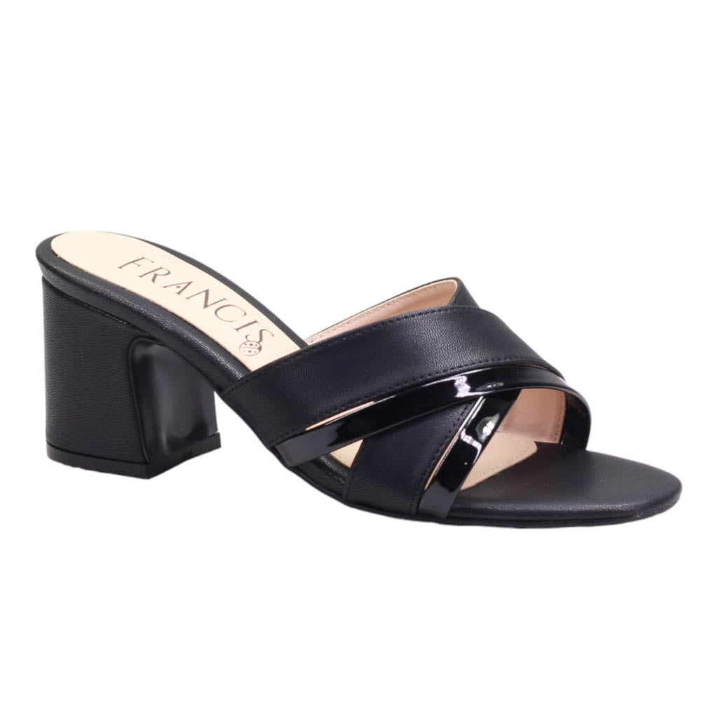Zapatilla para dama marca Francis en color negro. Este modelo de tacón de 6.00 cm ofrece comodidad gracias a su plantilla de confort. Sus tiras anchas en cruce y tiras delgadas también en cruce con acabado en charol le dan un toque elegante y moderno. Ideal para lucir un look sofisticado.
