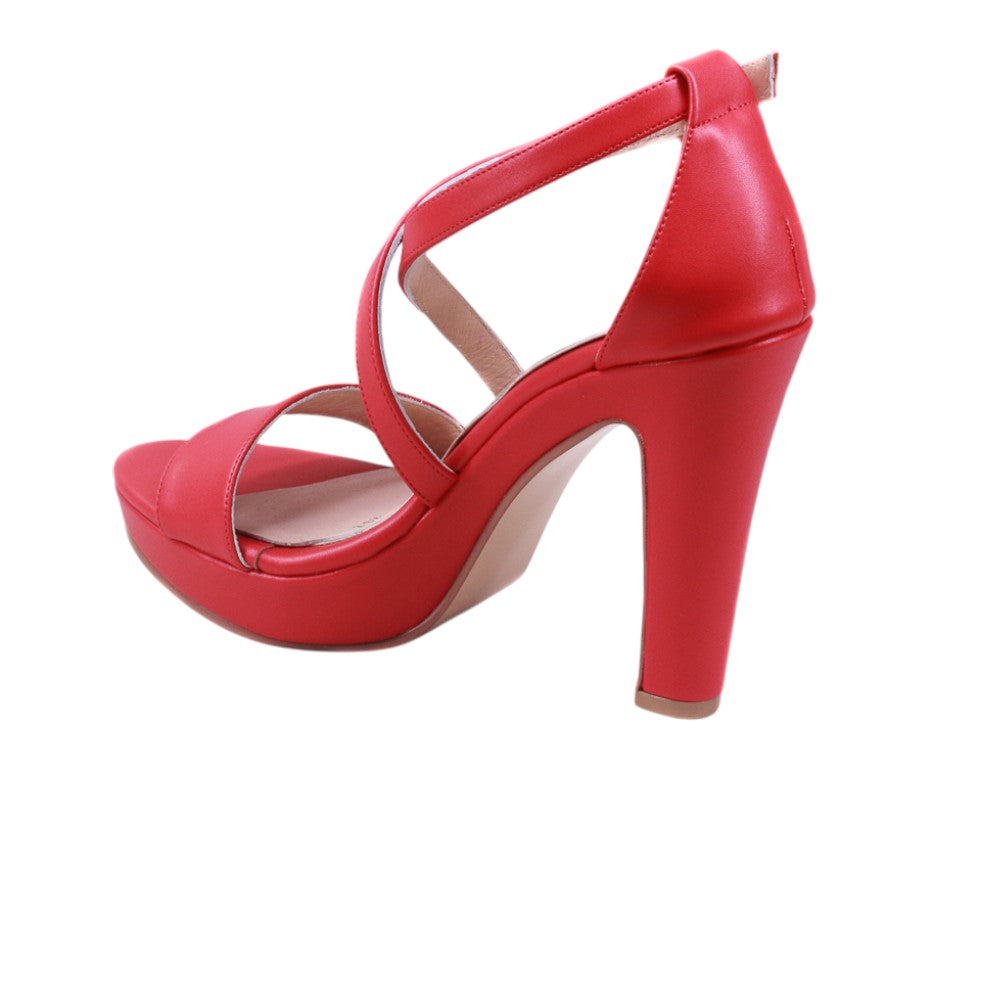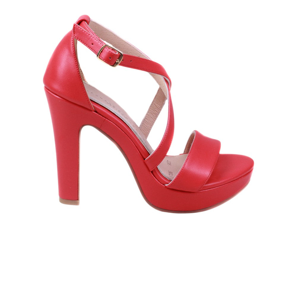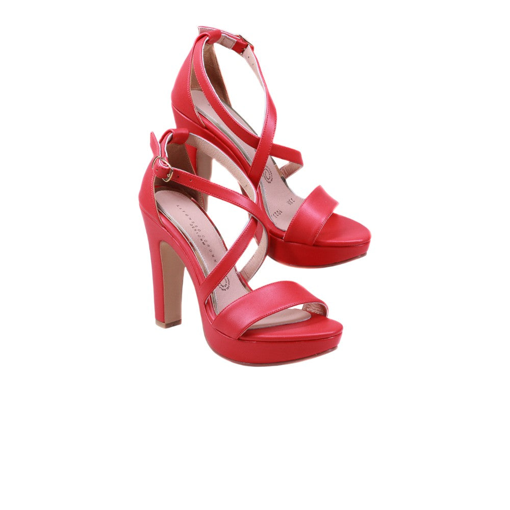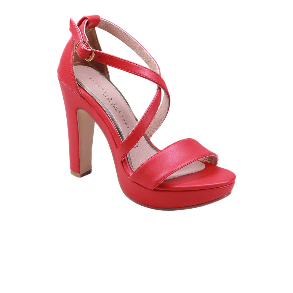 Zapatilla para dama marca Alfonso Coronna en color rojo. Elegante modelo que cuenta con un tacón alto y de 11.00 centímetros mas plataforma de 2.00 centímetros para contrastar la altura. Cuenta doble tira en cruce al tobillo más una tira de soporte a la altura de los dedos para un ajuste perfecto al pie.