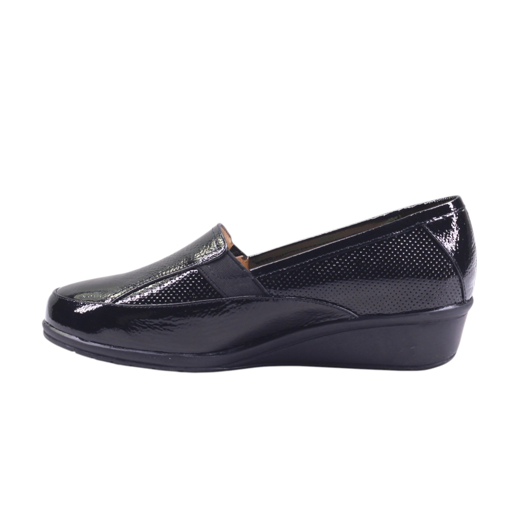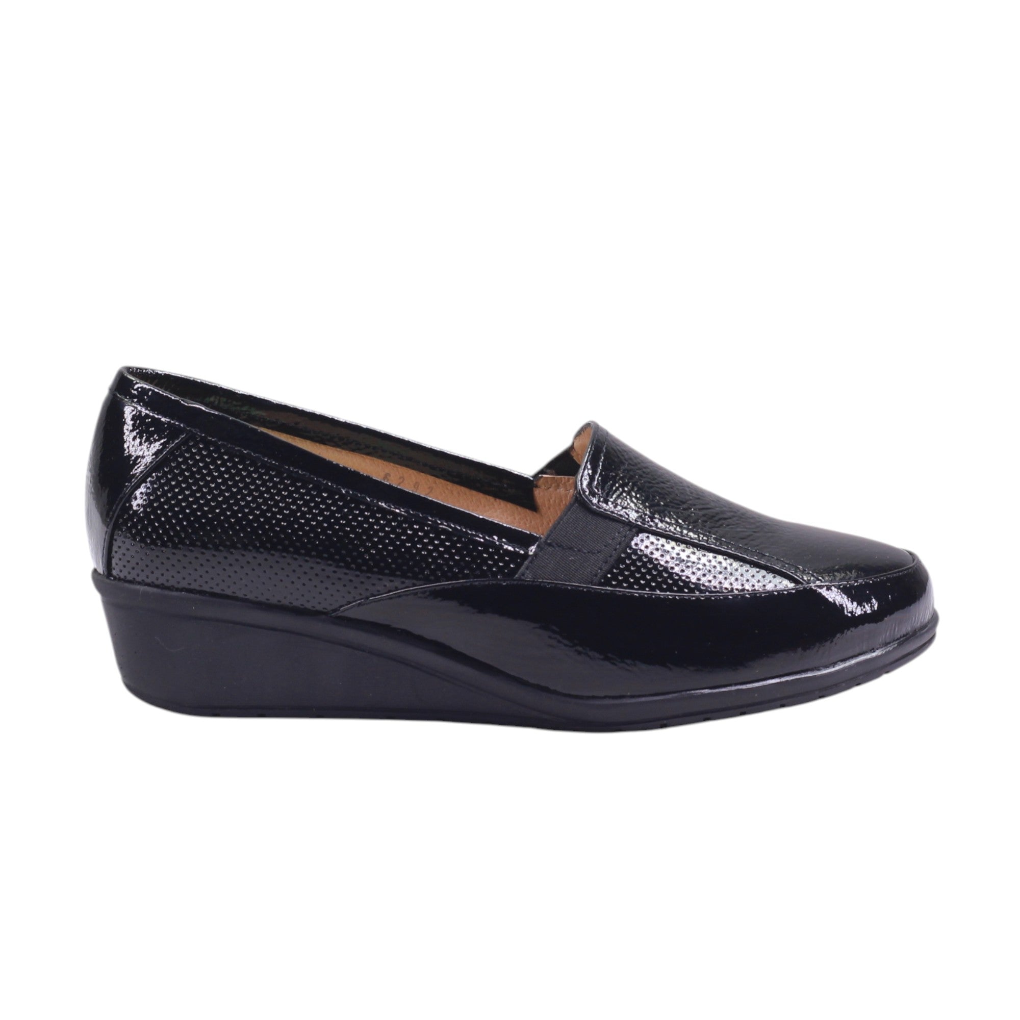 Calzado para dama marca Capricho en color negro. Este zapato combina elegancia discreta y funcionalidad. Confeccionado en piel vacuna, su diseño destaca por el contraste entre el charol brillante y una sección texturizada con patrón de puntos, que aporta un toque moderno y sofisticado.