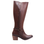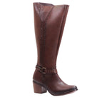 Bota para dama marca Maquech en color moka. Este modelo de bota presenta un tubo largo con elegantes perforaciones, un tacón ancho de 5.5 cm para mayor comodidad, y un cierre lateral para un ajuste perfecto. La plantilla de confort y el fajillo con argolla de adorno lo hacen ideal para cualquier ocasión.