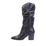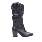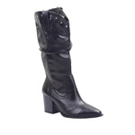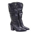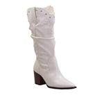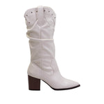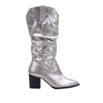 Bota de tubo largo estilo vaquera para dama marca Nomadas en color plata. Es el complemento perfecto para cualquier atuendo. Con un diseño de piel corrugada y remaches en el tubo, esta bota no solo es grandiosa sino también duradera y cómoda. Además, cuenta con una plantilla de confort y un cierre lateral para mayor comodidad. El tacón de 7.00 cm te brindará altura y elegancia en cada paso. ¡Haz de esta bota tu nueva favorita!