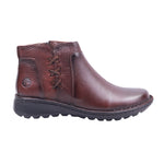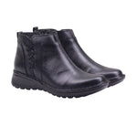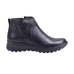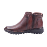 El modelo incluye un cierre lateral que facilita el calce rápido y seguro, complementado por costuras decorativas que aportan textura y carácter visual. La suela de goma con acabado robusto proporciona tracción y resistencia, mientras que la puntera redonda y el perfil medio del tubo lo hacen versátil para múltiples estilos.