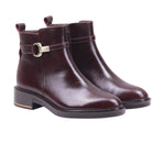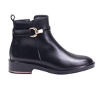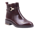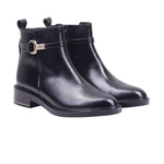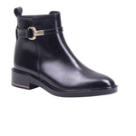 El diseño incluye un cierre lateral que facilita el calce, mientras que el tubo está adornado con un fajillo decorativo que rodea el tobillo, rematado con un herraje metálico tipo hebilla que aporta carácter y sofisticación. El tacón presenta un detalle decorativo sutil: una línea de color contrastante en la base que añade un toque refinado al perfil del calzado.
