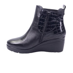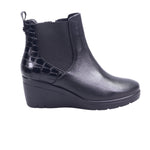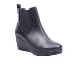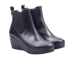 Bota para dama marca Manet Moda en color negro. Diseño robusto con acento sofisticado. Este botín está confeccionado en piel porcina en el corte, con forro textil que aporta suavidad y transpiración al interior. La silueta presenta una punta redondeada y un tubo al tobillo con estructura firme, ideal para climas frescos o atuendos urbanos con carácter.