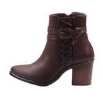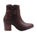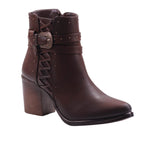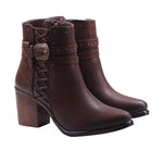 Botín para dama marca Maquech en color moka. Este modelo estilo vaquero te brinda un estilo único y moderno con su tacón ancho de 7.00 cm y plantilla de confort para mayor comodidad. Las tiras delgadas en diagonal y la hebilla de adorno lateral añaden un toque de elegancia a tu look.