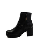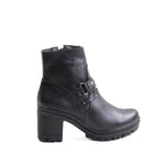Descubre la sofisticación y el encanto rebelde de nuestro botín de tacón cuadrado medio en color negro con doble fajillo al tobillo adornados con estoperoles. Este botín combina estilo y actitud en una combinación de colores clásicos.