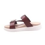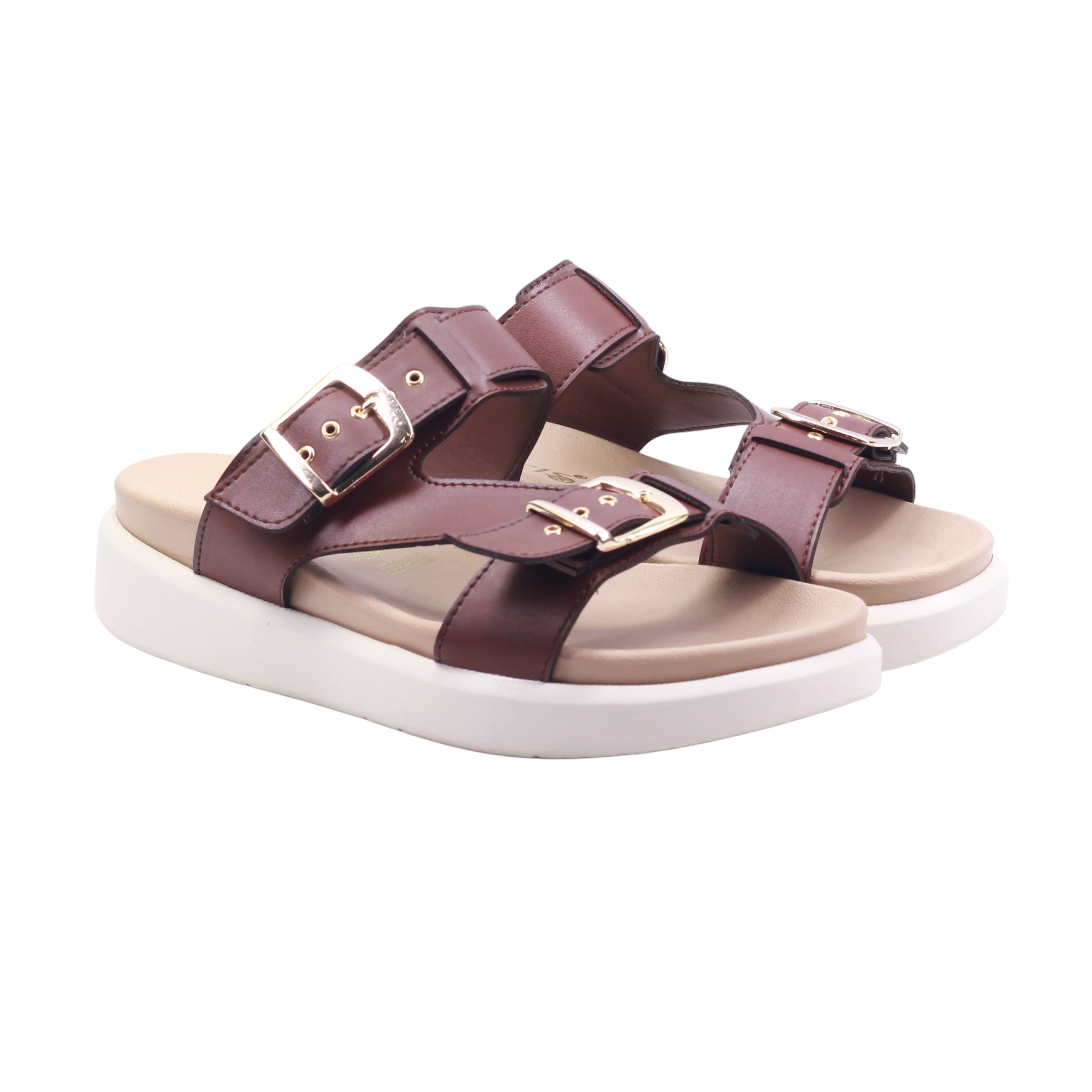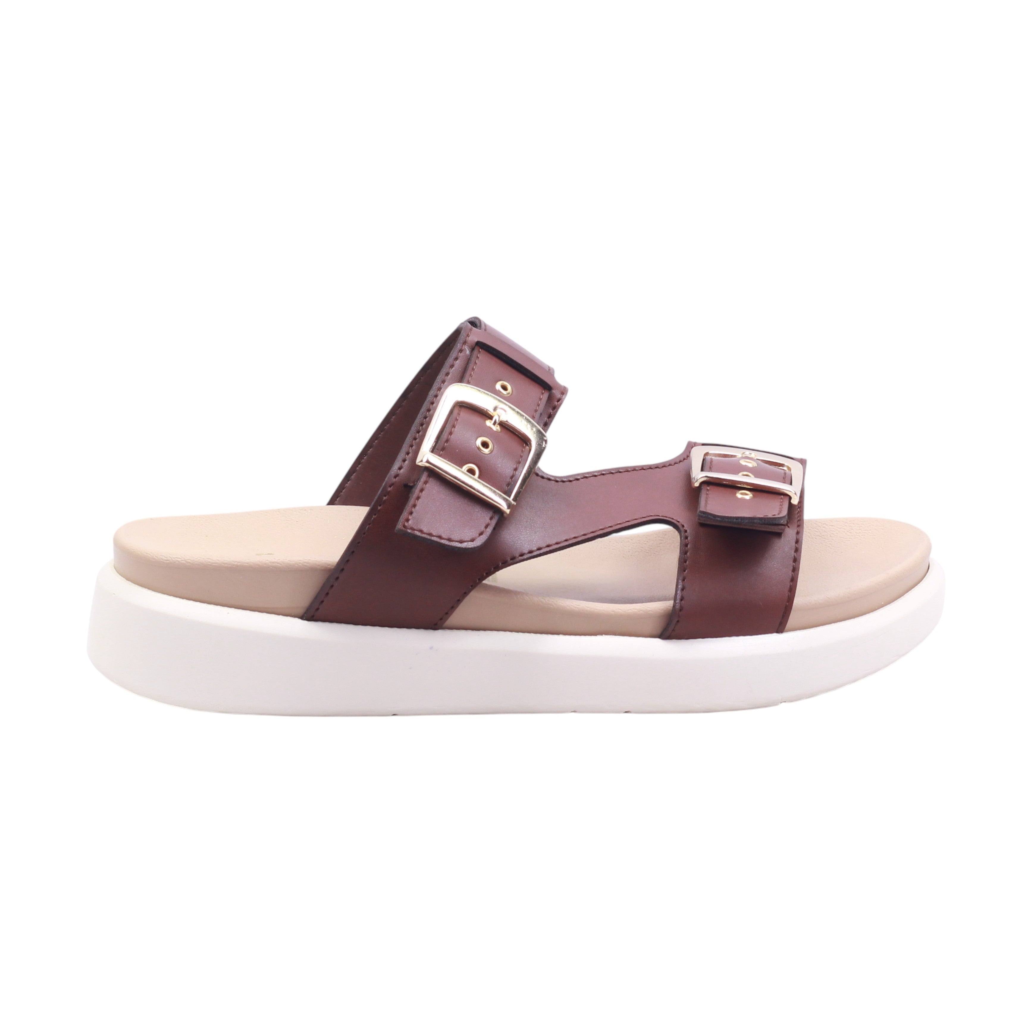 Sandalia para dama marca Francis en colores arcilla y negro. Sandalia femenina con corte y forro artificial, ideal para uso diario con estilo relajado. Su diseño de doble tira con hebilla metálica dorada permite un ajuste personalizado, mientras que la suela corrida de 2.5 cm brinda soporte ligero y amortiguación. El acabado en tono vino y la plantilla contorneada ofrecen confort y estabilidad, perfecta para combinar con outfits casuales o de verano.