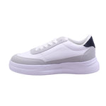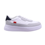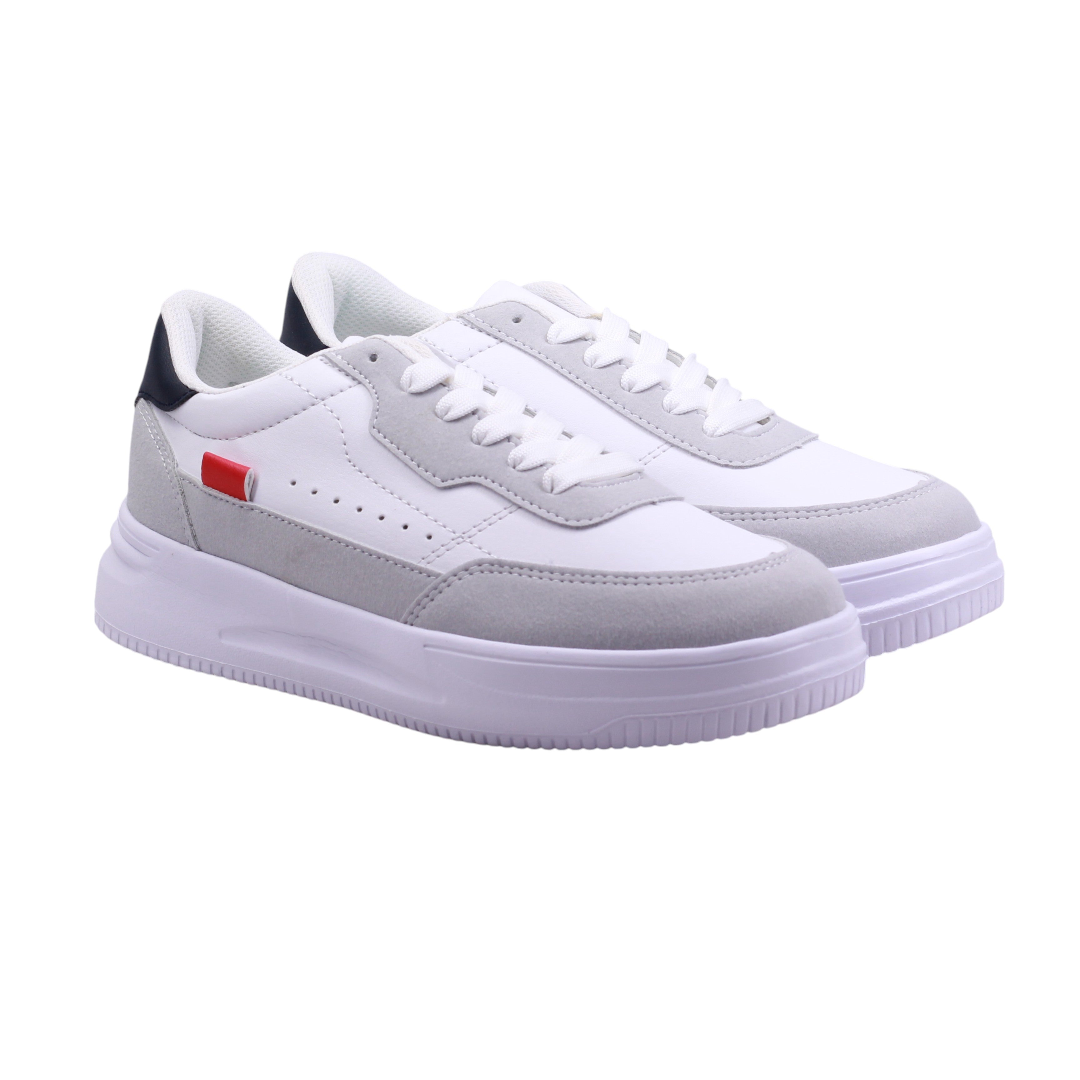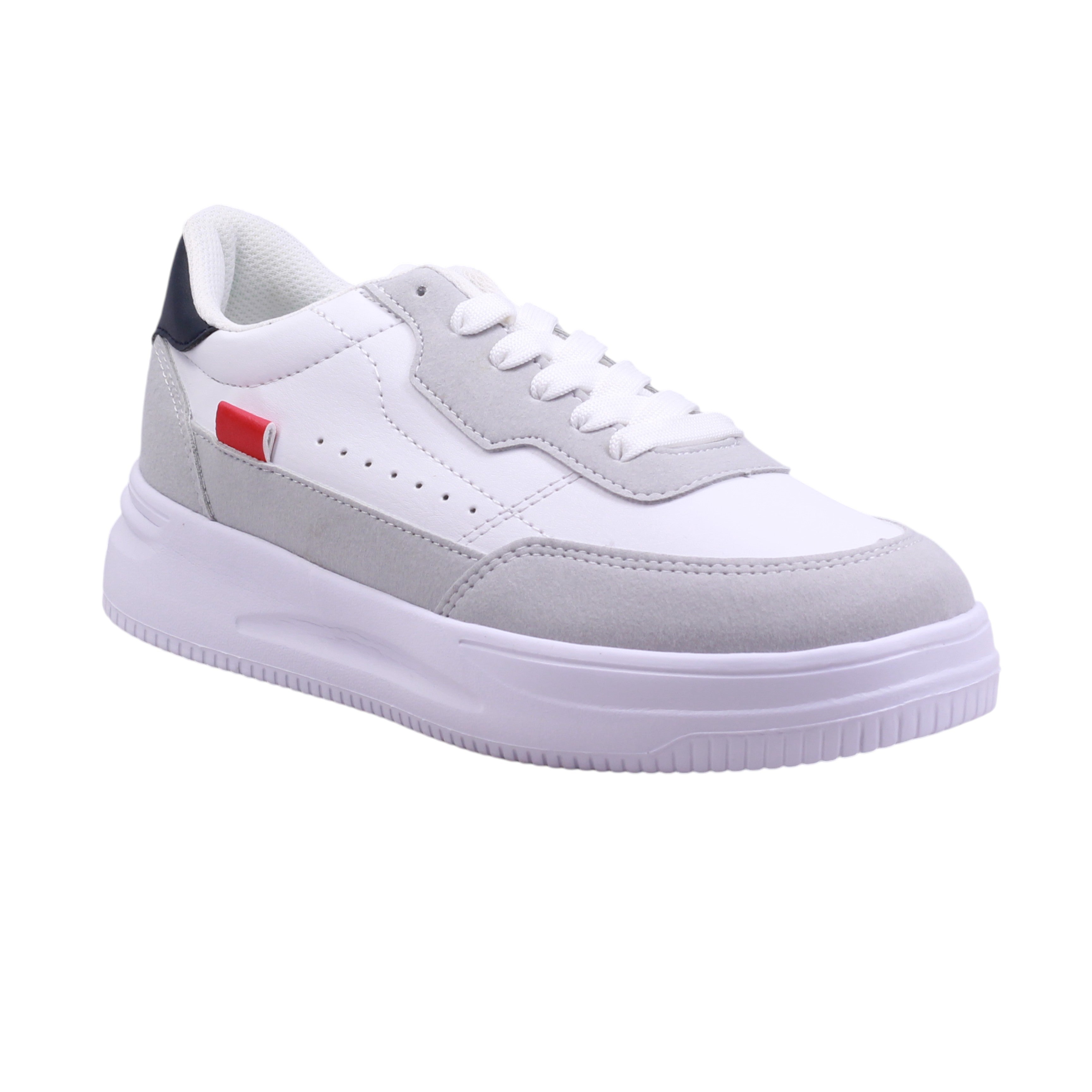 Tenis para dama en color blanco. Tenis femenino con corte artificial y forro textil que brinda frescura y suavidad al contacto con el pie. Suela blanca con altura de 4.0 cm que aporta amortiguación y estilo elevado. El diseño combina paneles en blanco, gris tipo gamuza y negro en el talón, con un detalle rojo lateral que añade contraste visual. Ajuste mediante agujetas blancas para un calce seguro. Perforaciones laterales que favorecen la ventilación. Collar acolchado y lengüeta suave para mayor confort. Ideal para uso diario, caminatas o looks urbanos con toque moderno.