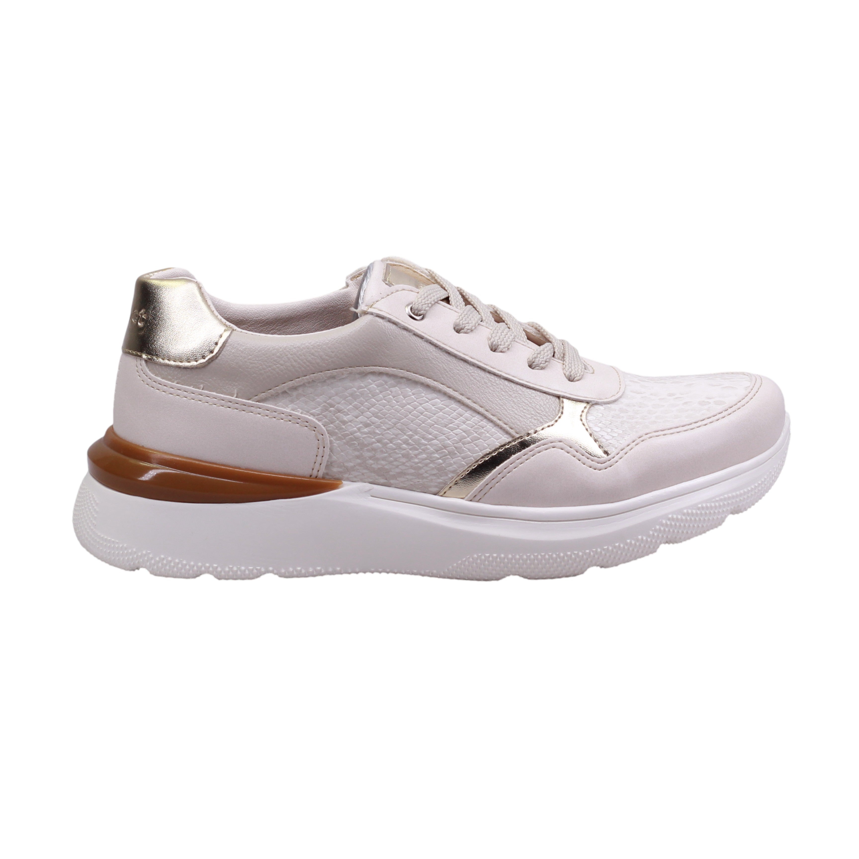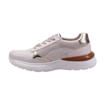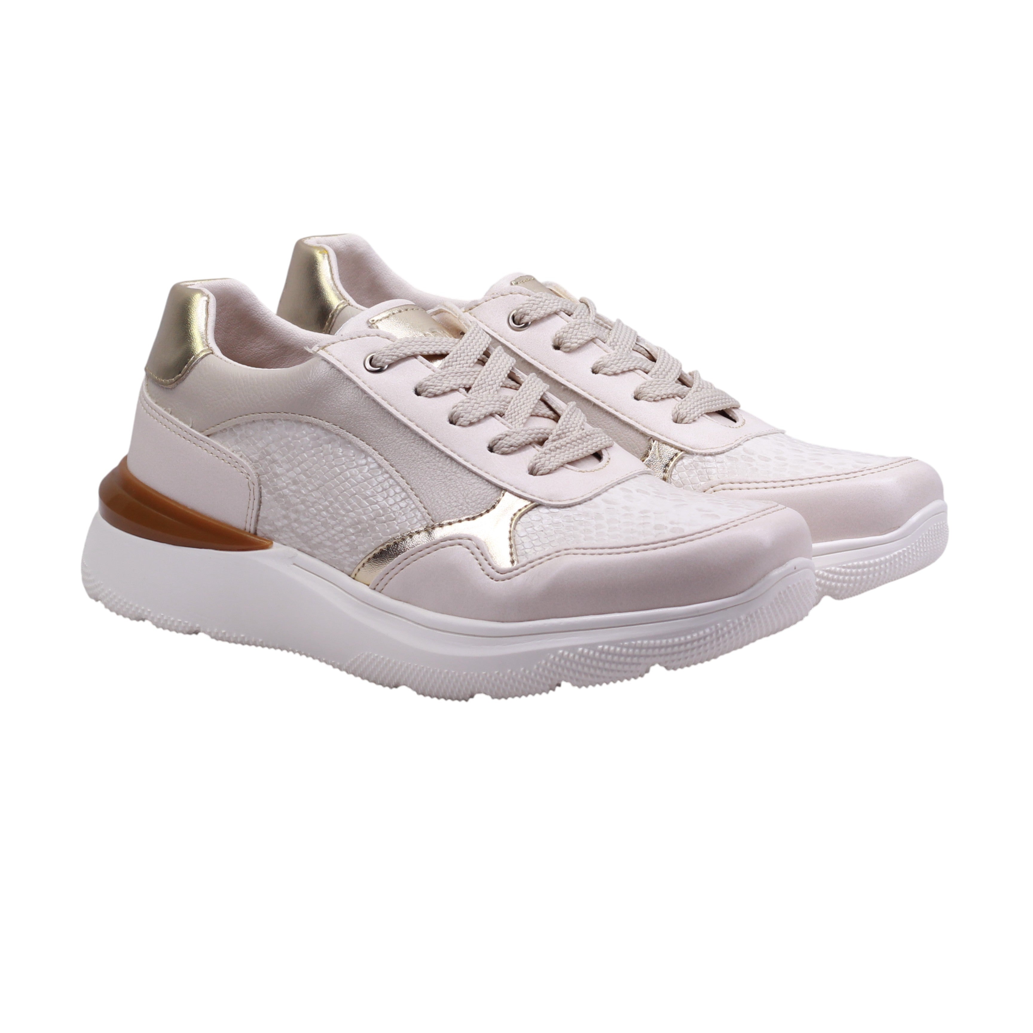 Calzado para dama marca Manet Moda en color late/oro. Tenis femenino con corte de piel y forro textil, diseñado para ofrecer estilo y confort en cada paso. La suela de 4.5 cm proporciona una elevación cómoda y moderna, ideal para uso prolongado sin sacrificar estabilidad.El diseño combina tonos beige y rosa claro con acentos metálicos dorados en el talón, ojillos y paneles laterales, aportando un toque sofisticado y femenino. El frente y los costados presentan texturas grabadas que añaden profundidad visual y un acabado elegante. El sistema de ajuste es mediante agujetas, lo que permite un calce personalizado.